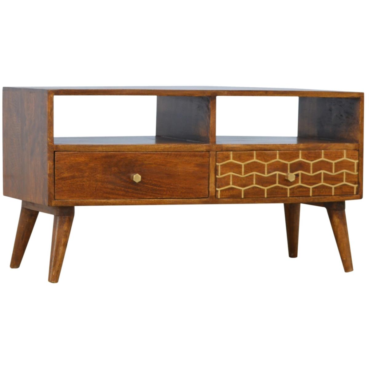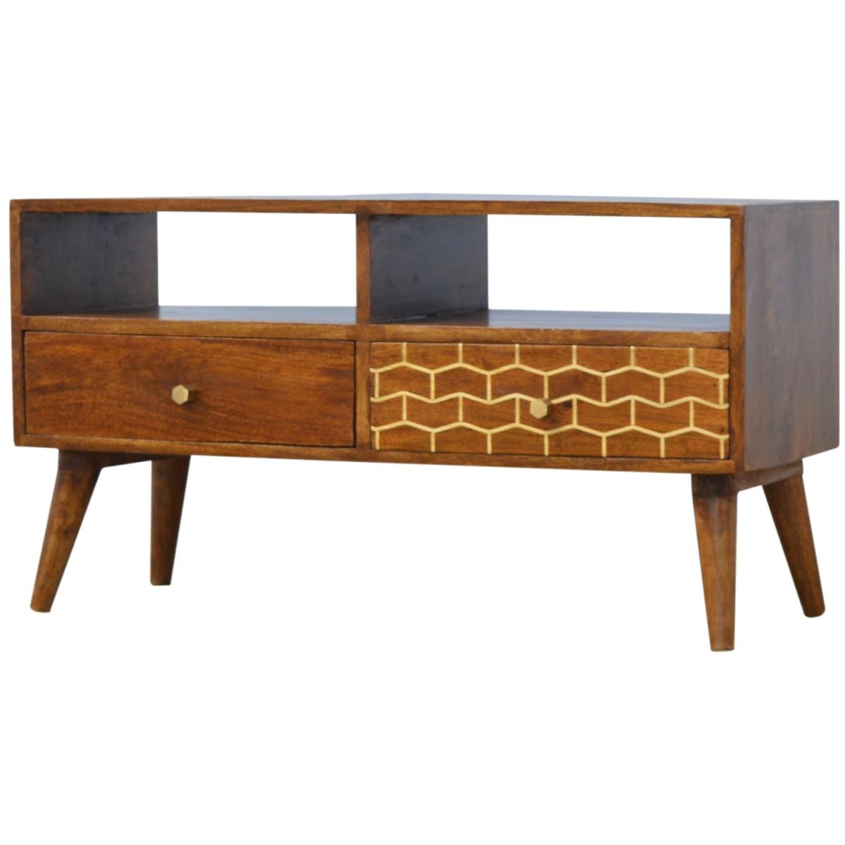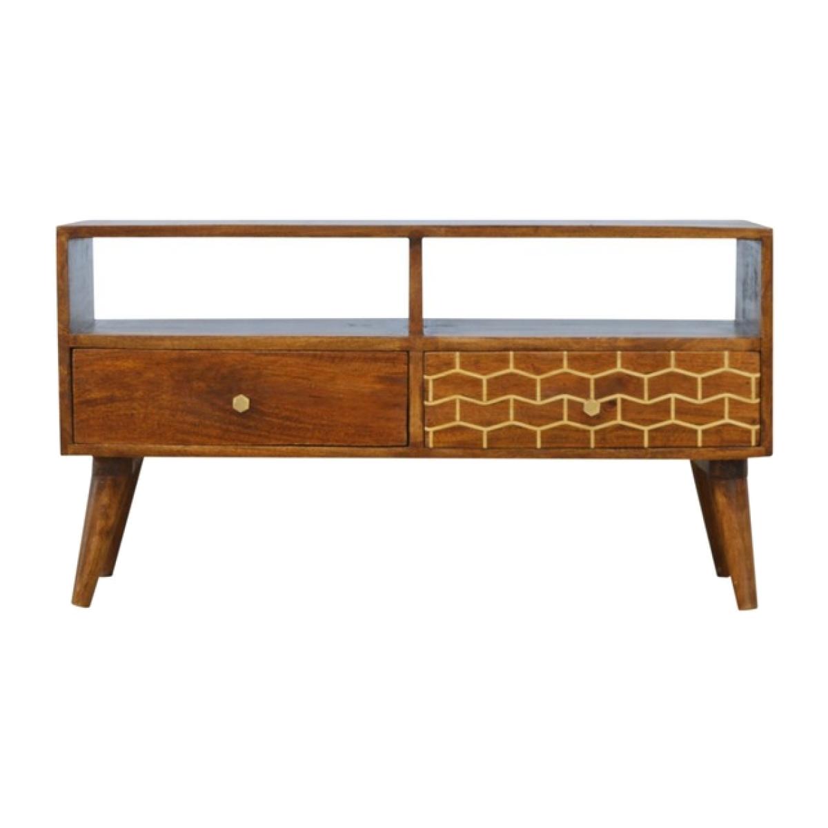 Add this media unit to your living room, or bedroom. Standing on 4 Nordic style legs it features 2 open slots and 2 drawers which each have 1 shiny brass knob. This is a very stylish and versatile piece that features a gold brass patterned drawer front. This piece can stand alone or can be completed with the matching collection.