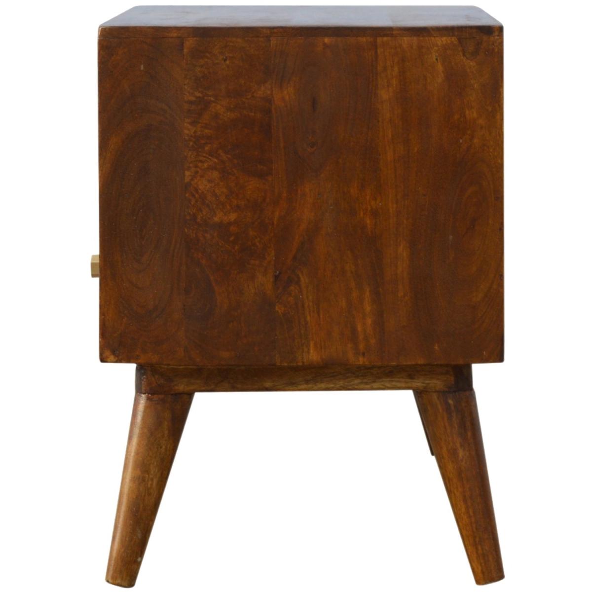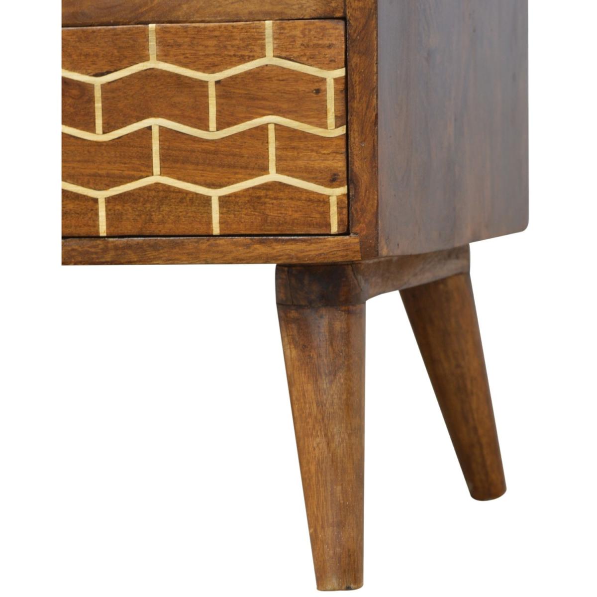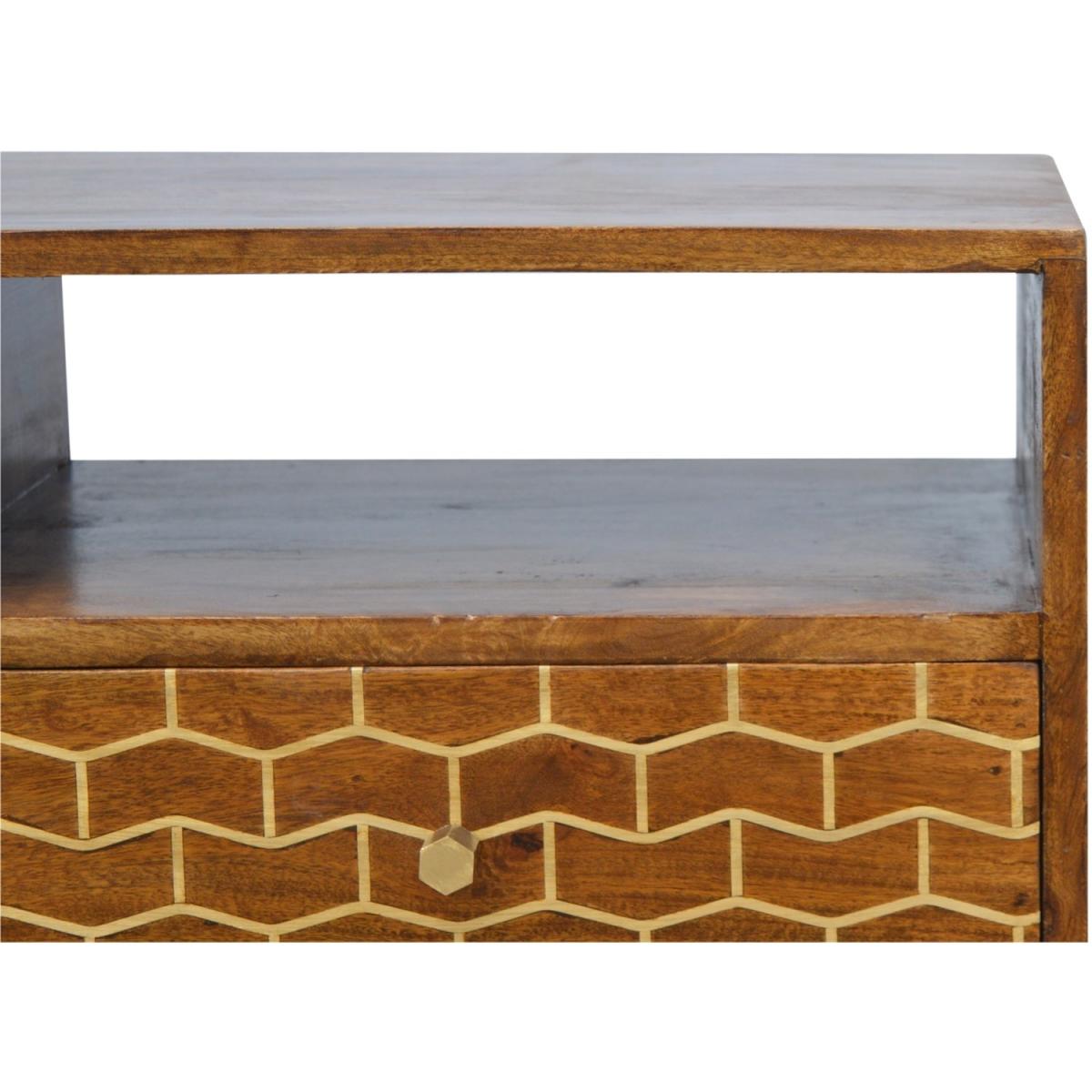 Add this media unit to your living room, or bedroom. Standing on 4 Nordic style legs it features 2 open slots and 2 drawers which each have 1 shiny brass knob. This is a very stylish and versatile piece that features a gold brass patterned drawer front. This piece can stand alone or can be completed with the matching collection.
