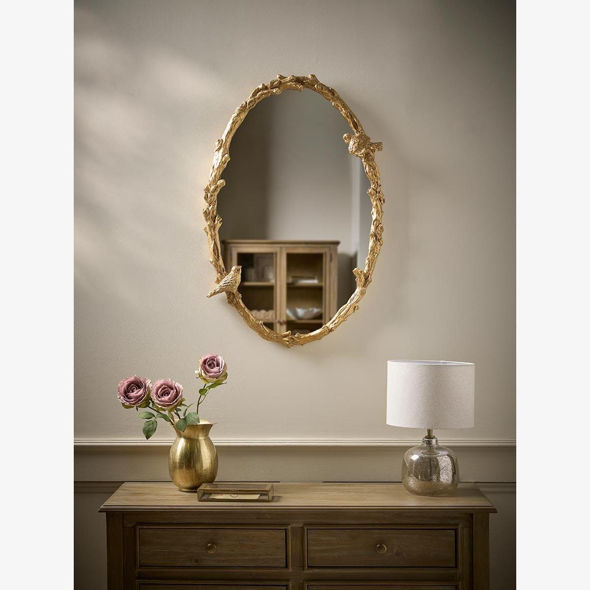 Bringing a touch of natural elegance to your home, our Gold Birds Mirror is a celebration of delicate detail and refined charm. Its oval frame, finished in soft antiqued gold, is beautifully adorned with sculpted branches and two perched birds for a design that feels both whimsical and timeless. Perfect for a hallway, bedroom or living space, this mirror adds a warm, organic note while gently reflecting the light around your room. Quietly luxurious and full of character, this mirror that brings natural elegance into your home.