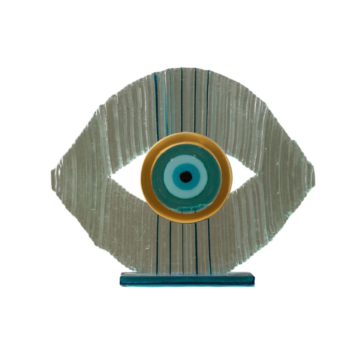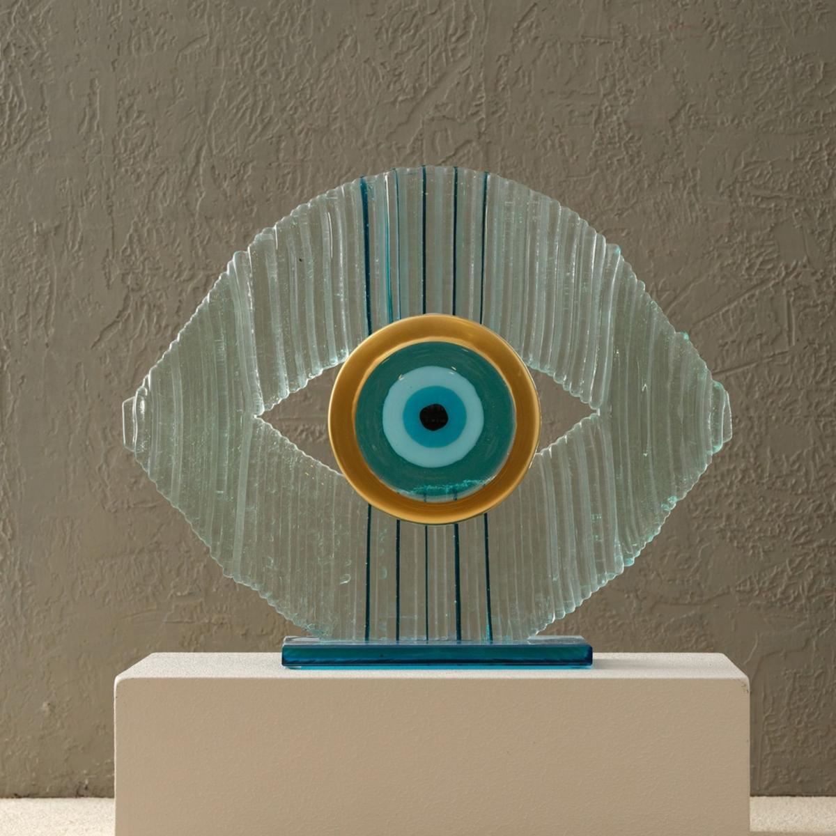 Enhance your home with the Blue and Gold Glass Evil Eye Ornament, a stylish blend of tradition and contemporary artistry. This handcrafted piece embodies the cultural symbolism of the evil eye, believed to guard against negativity while serving as a stunning piece of décor. The transparent glass frame, shaped into an eye with detailed ridges, creates a captivating backdrop for the concentric centerpiece, which features soothing shades of turquoise, deep blue, and gold. This ornament’s unique blend of colors and textures makes it perfect for adding a protective and artistic focal point to living rooms, offices, or entryways.