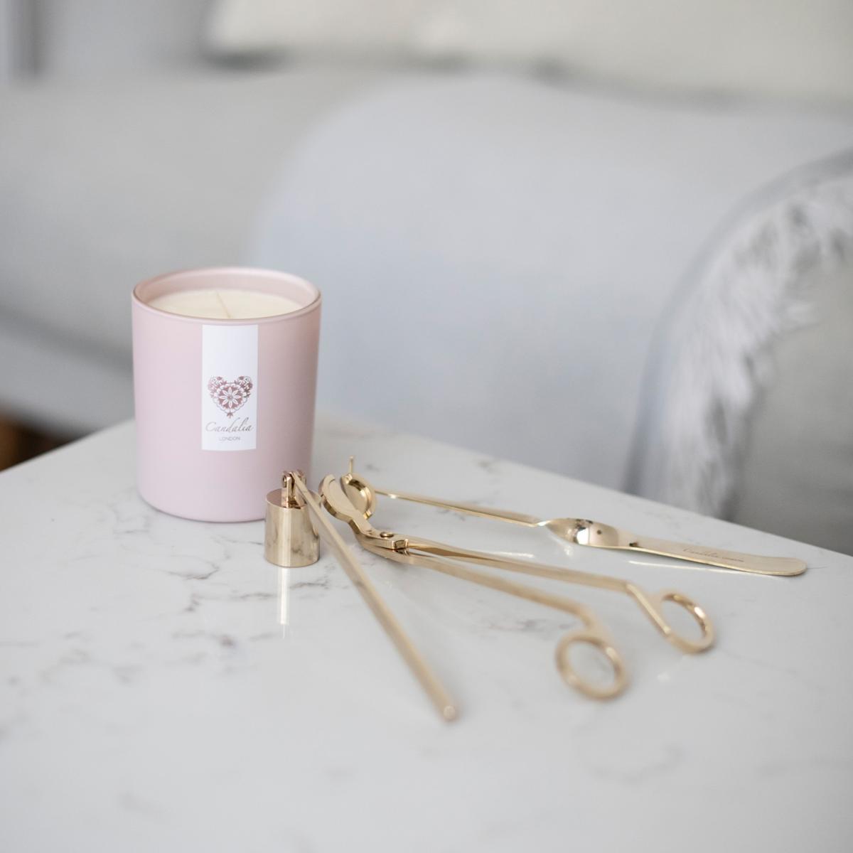 Enjoy the perfect burn and keep your candles in pristine quality with our elegant Candle Care Kit. A luxurious gold finished candle snuffer, a wick dipper and a wick trimmer, all engraved with our Candalia logo. A perfect gift for any fragrance lover and an essential for your home. Perfectly paired with our 100% natural wax candles.