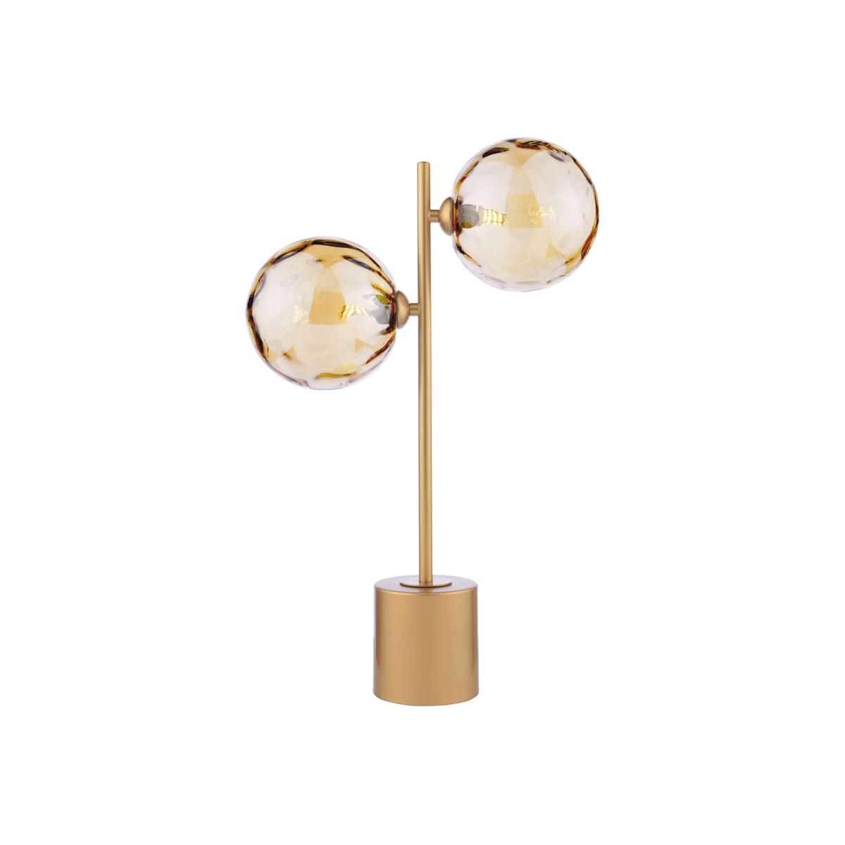 Bask your home in a soft, golden glow with this elegantly designed table lamp. We love its dimpled champagne glass orbs and minimalist Art Deco design. Why you'll love it Striking contemporary design with an eye-catching silhouette. Minimalist matt gold metal base. 2 champagne glass orb-shaped shades. Clear cable. This table lamp is part of the Furniture Village lighting collection. What you need to know Matt gold base. Glass shades. In-line rocker switch. Requires 2 x G9 bulbs (not included). Dimensions Height: 48 cm (19 in). Diameter: 32 cm (13 in). Shade dimensions Height: 14 cm (6 in). Diameter: 14 cm (6 in).