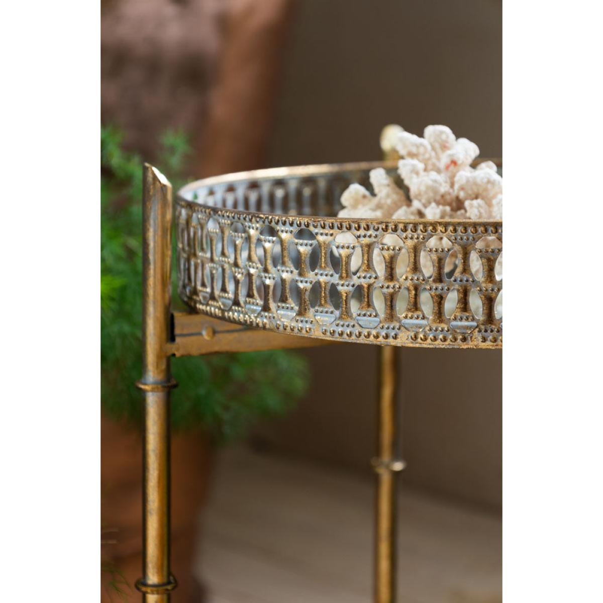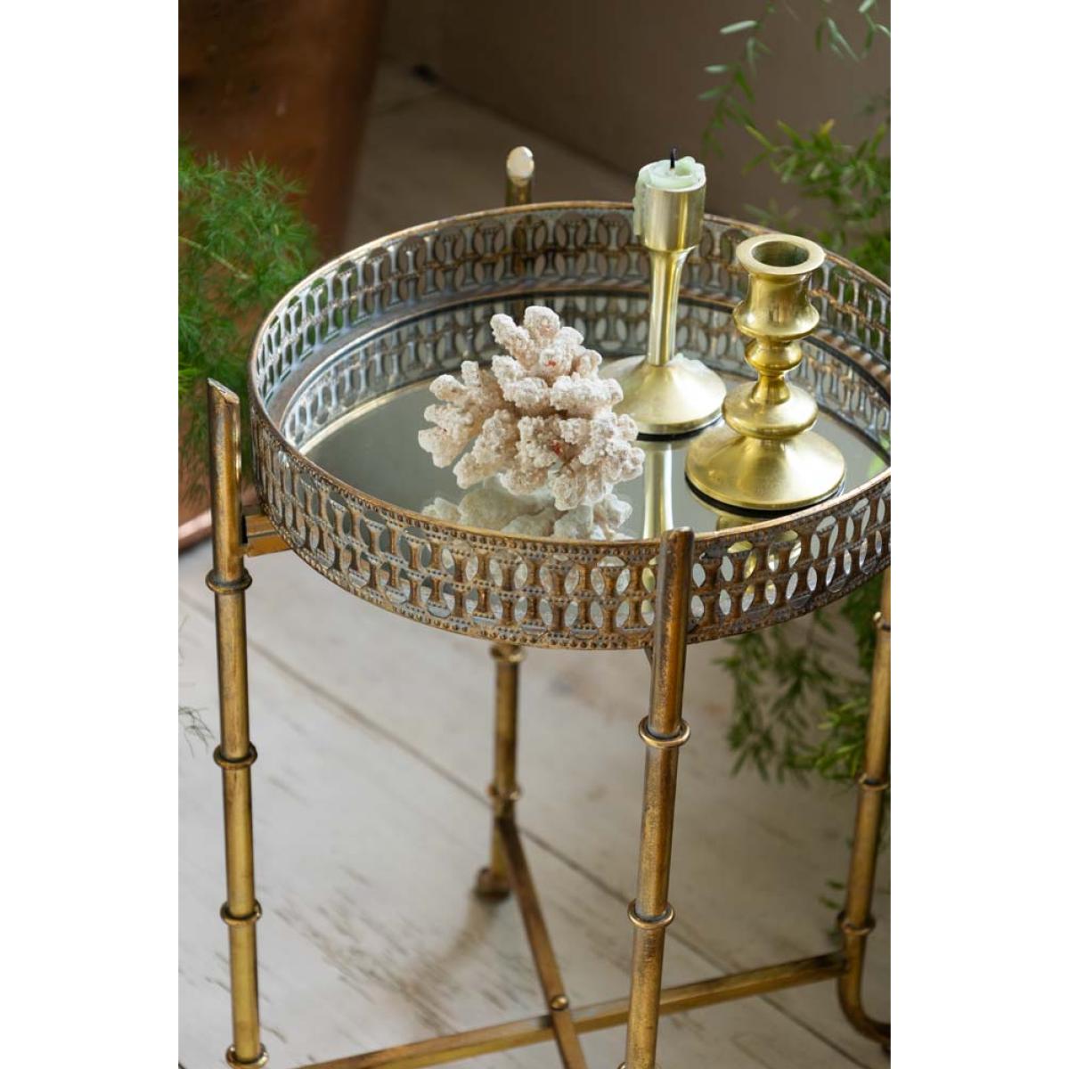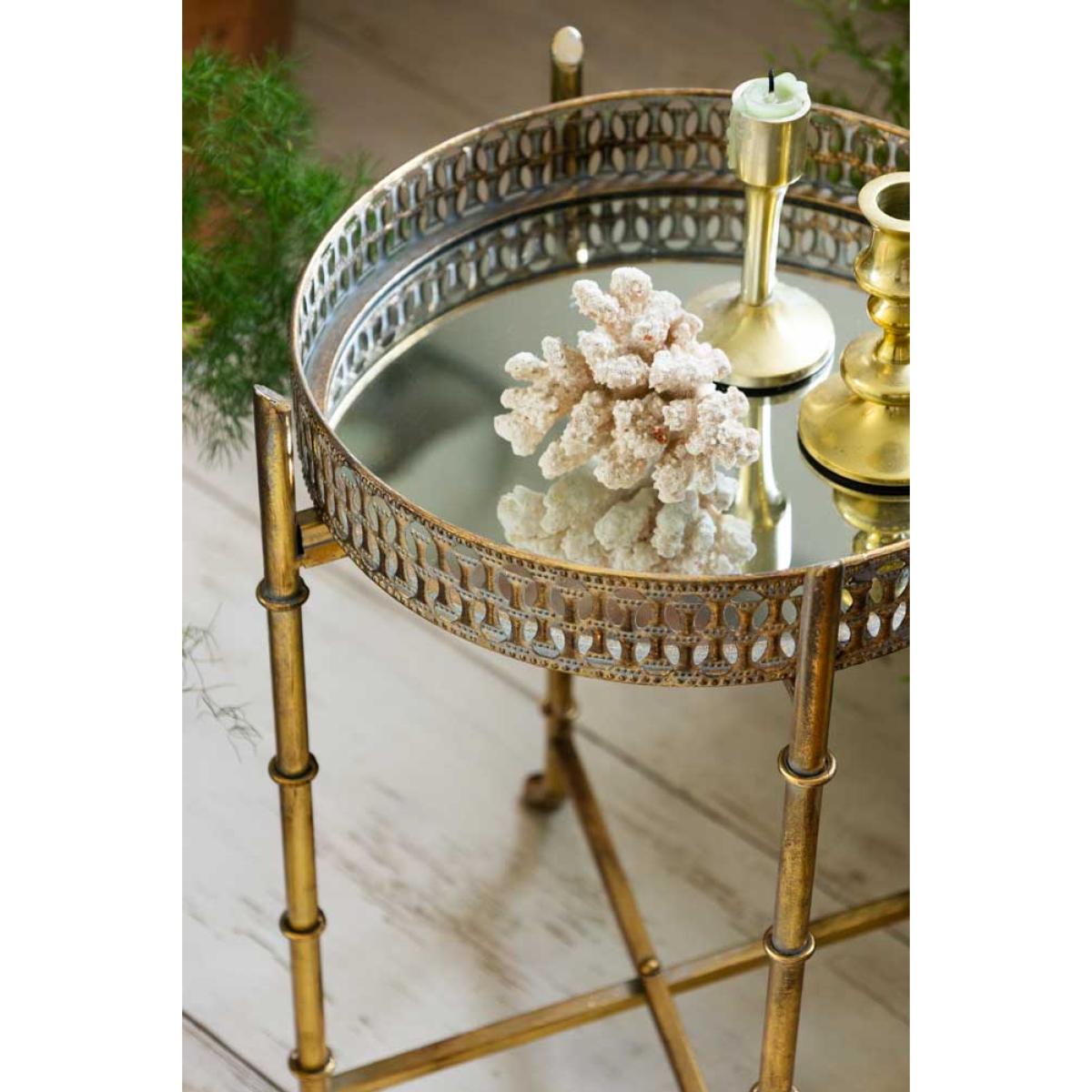 There’s a quirkiness to this piece that’s utterly charming, combining as it does a vintage-style bamboo-esque gold frame with a glass top and intricately detailed gold rim. Perfect for when you’re hosting, this is just right for drinks and snacks, and when you’re not, this wouldn’t look out of place in the kitchen or dining room as a drinks trolley (although please note this isn’t on wheels). Alternatively, it’s a bold enough design to take a statement vase and generous bunch of seasonal blooms, a voluminous plant or an assortment of candles – mix pillar styles with votive and tealights for a glorious light show. After all, who can fail to be charmed by flickering candlelight bouncing off the mirrored tabletop? Just stunning. - Gold Distressed Mirrored Side Table - Material: Metal and glass - Measures: H50cm x Dia. 33.5cm