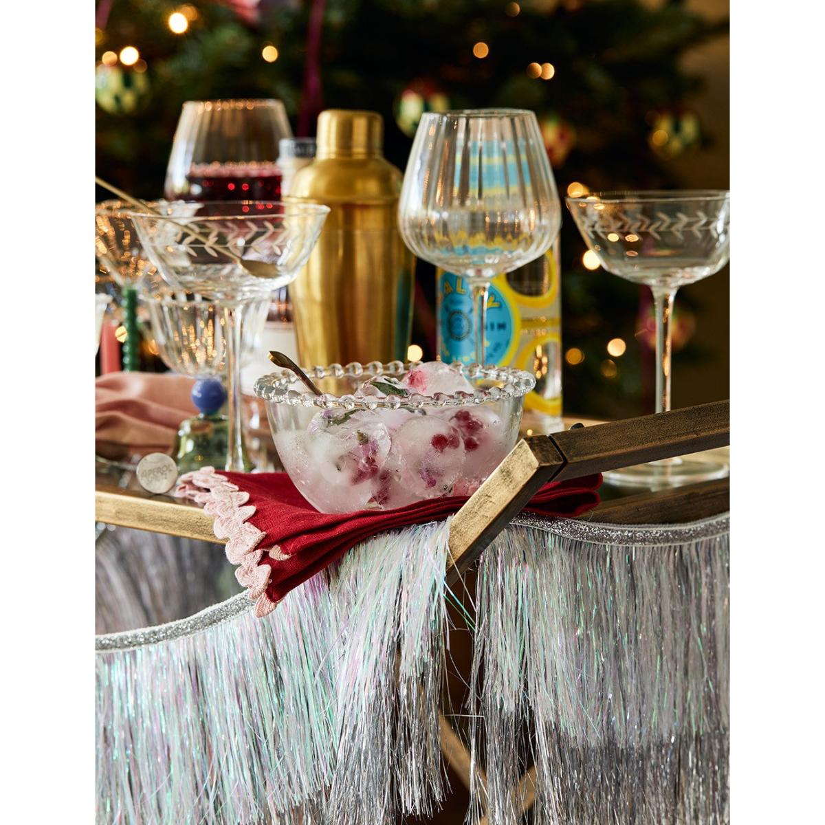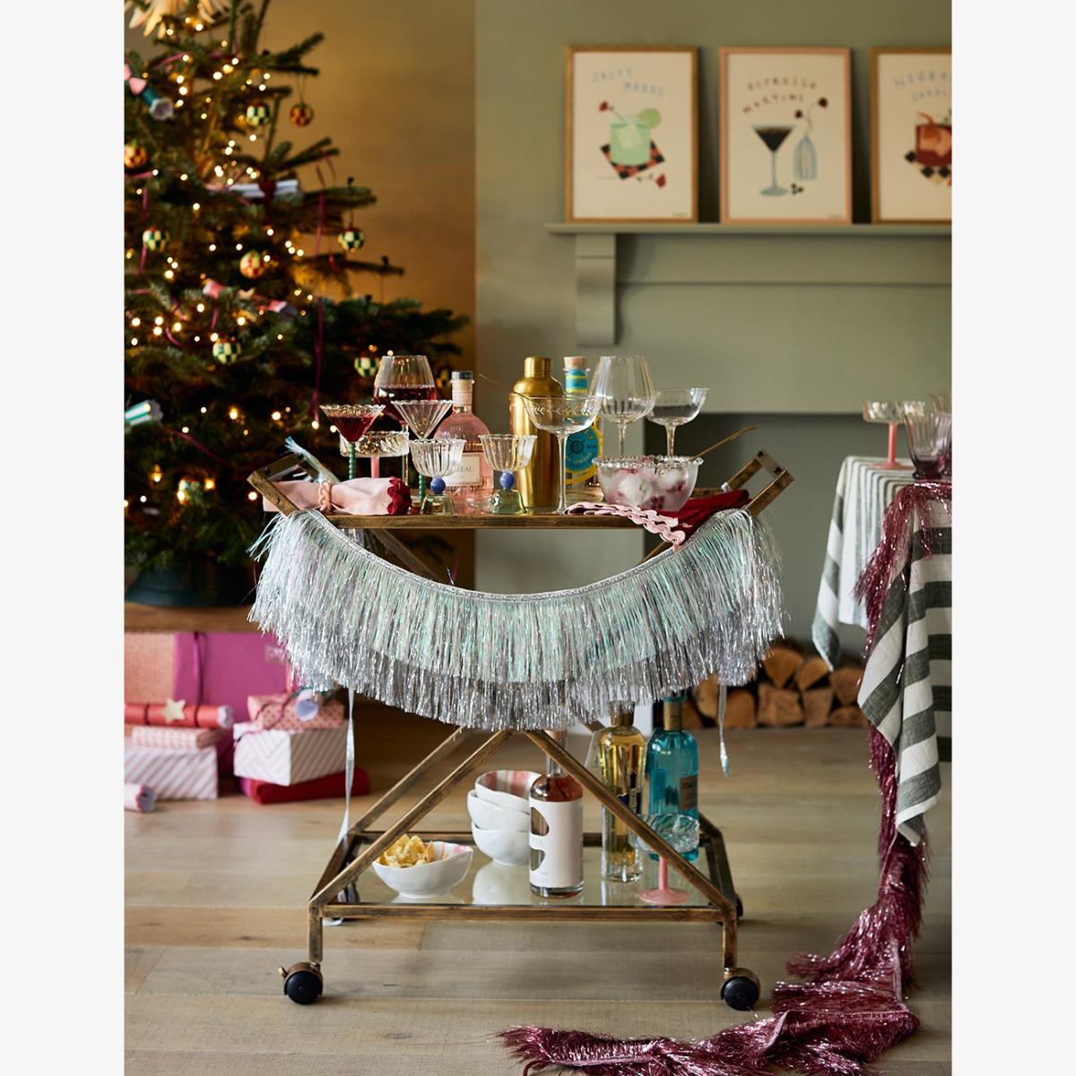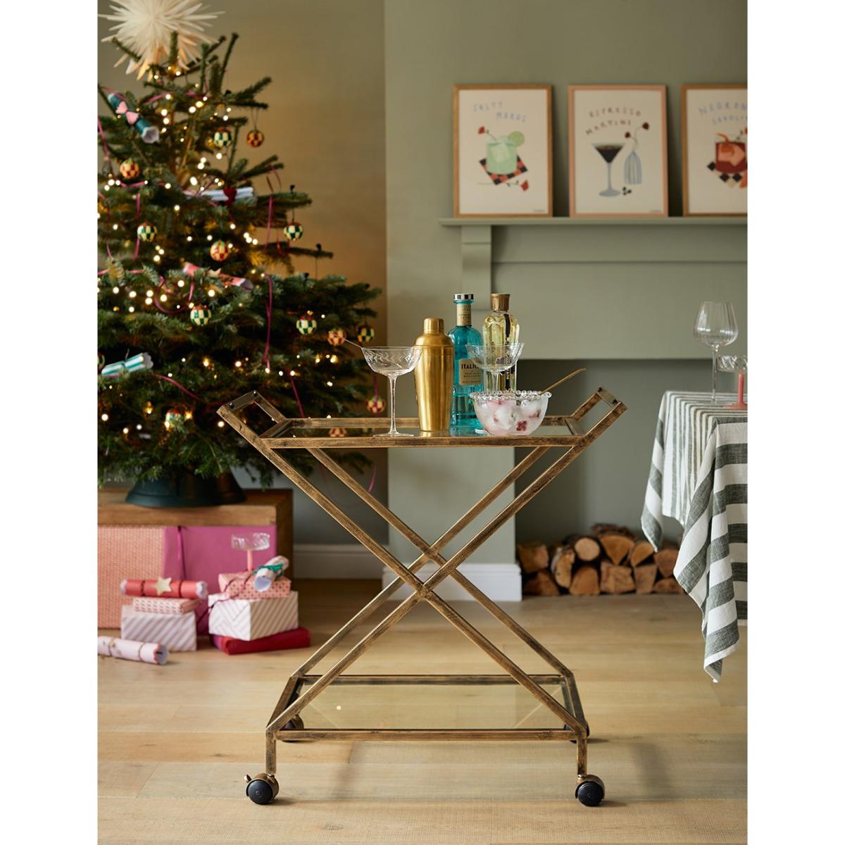 Host in style this Christmas with our Gold Drinks Trolley and effortlessly keep the good times flowing. With two spacious glass shelves, this bar cart is perfect for showcasing your favourite bottles and cocktail glasses. The sleek golden finish adds a touch of luxury to the room, whilst the wheels make it a practical choice for all your hosting needs. Whether you love to style with classic wine glasses or colourful coupes, our versatile drinks trolley can be tailored to suit your interior style.
