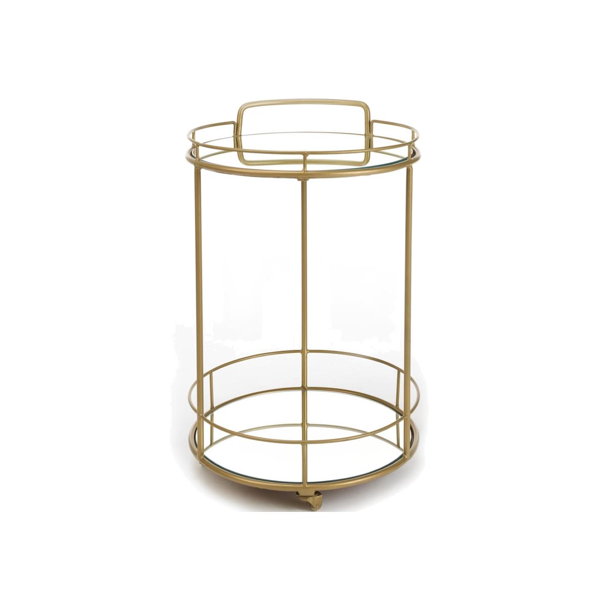 This round gold drinks trolley with mirrored glass is a chic and functional accent piece, perfect for entertaining in style. The trolley features a sleek, circular design with a luxurious gold metal frame that adds a touch of glamour and sophistication to any space. Two tiers of mirrored glass shelves reflect light and enhance the trolleys elegant appearance, while providing ample space for storing and displaying drinks, glassware, or bar accessories. Equipped with smooth rolling caster wheels, this drinks trolley can easily move from room to room, making it a versatile addition to your home. Whether used as a mobile bar cart for cocktail parties or as a stylish storage solution for your dining or living area, its both practical and visually striking. The combination of the gold finish and mirrored surfaces creates a contemporary yet timeless design, making this drinks trolley a standout feature in any setting.
