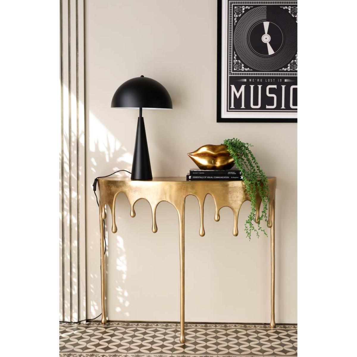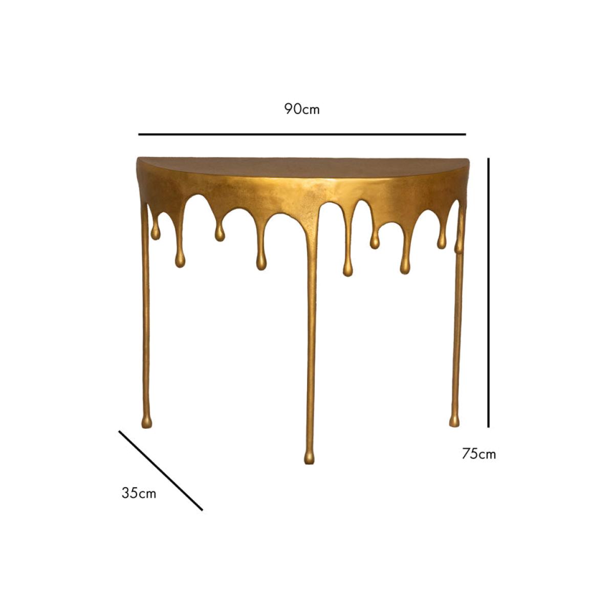 About The Gold Drip Console TableInspired by our bestselling side table design, the Gold Drip Console Table introduces statement glamour to your hallway! Measuring H75cm x W90cm x D35cm, the gold coffee table is made from aluminium with quirky gold drip design details. Please note, that this console table features a distressed gold finish and unique markings that mean no two designs are the same. When cleaning your console table, please use a dry cloth and avoid any cleaning products as these will tarnish the paint finish. We also recommend using coasters with drinks to avoid discolouration from liquids. Why We Think You Will Love The Gold Drip Hall TableThe hall table is vital for making the most of otherwise unused space and is the perfect piece to make a statement. Therefore, why not liven up your entrance hall with the rock ‘n’ roll style inspiration and bold charm of the gold drip modern console table?! Both practical and glamorous, there is plenty of space to store all your essentials and the gorgeous gold finish promises to welcome you home in style. Where To Style The Hallway Console TableThe Gold Drip Hallway Console Table can be used in both upstairs and downstairs hallways for handy extra storage and an irresistible style spot. Place a trendy trinket tray on the top for keys and style with everything from a beautiful table lamp to books, plants and candles for a fabulous feature!