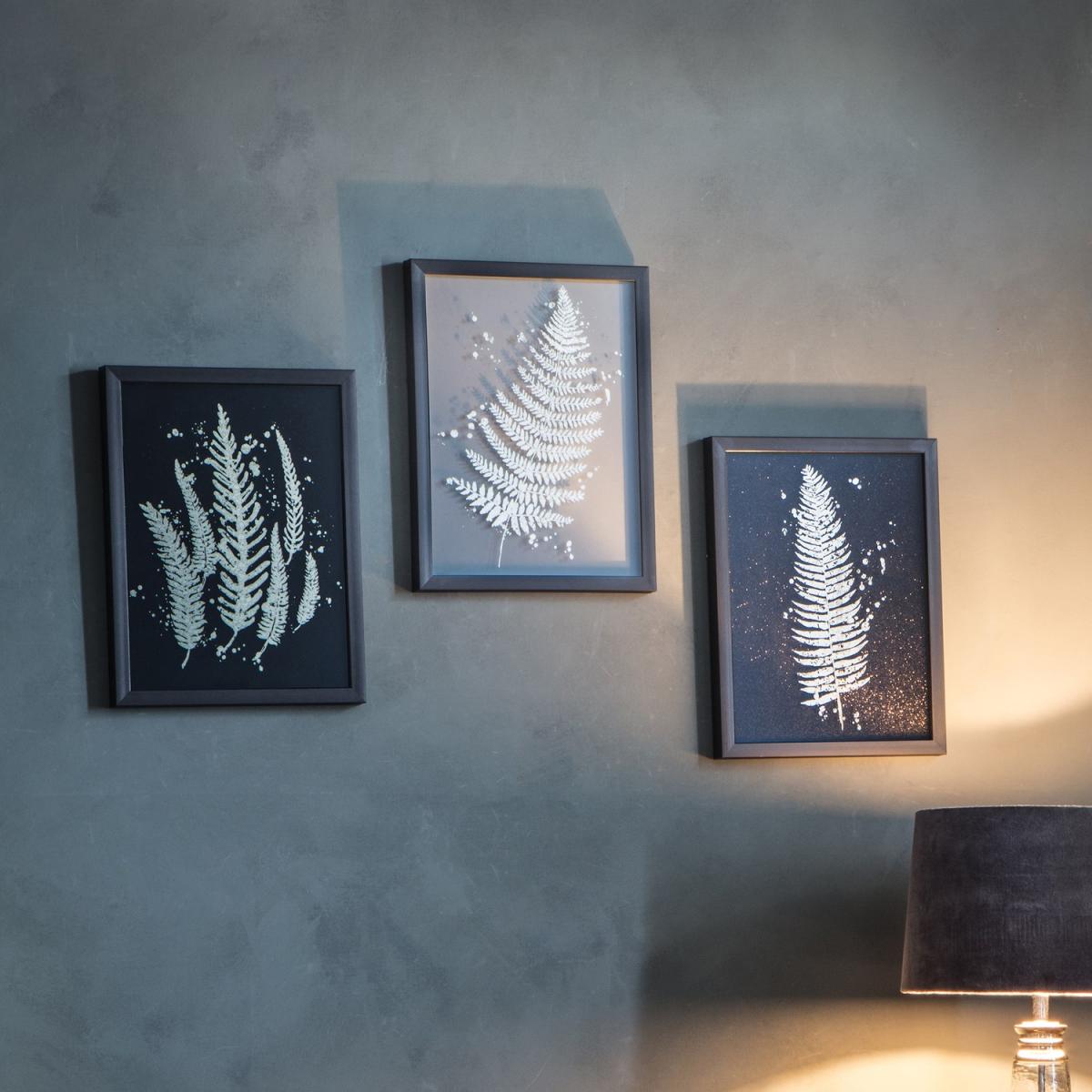 I love how the Ferns set brings a touch of nature into a space, adding both texture and a calming aesthetic. It works particularly well in modern or minimalist interiors, where the monochrome palette can subtly complement neutral colour schemes, or in botanical-inspired rooms aiming for a contemporary feel. For practical styling, consider hanging them in a clustered arrangement above a console table or sofa, ensuring even spacing for a tidy look. Alternatively, these pieces can be grouped with other botanical artworks or placed in a gallery wall. The framed nature of this set makes it versatile and easy to incorporate into various spaces, from living rooms to bedrooms, adding visual interest without overwhelming the room.