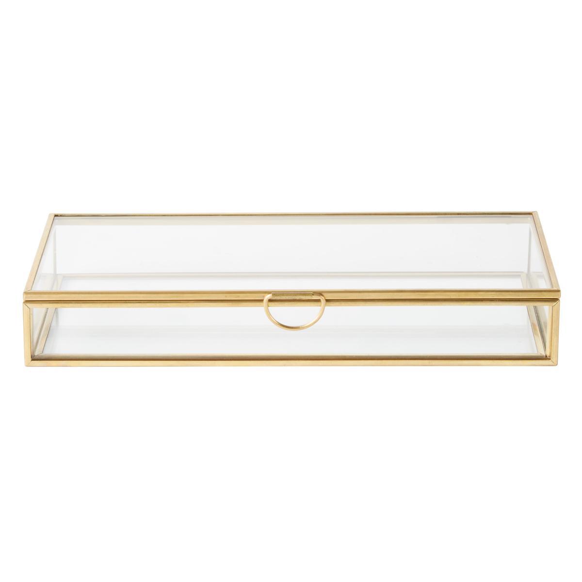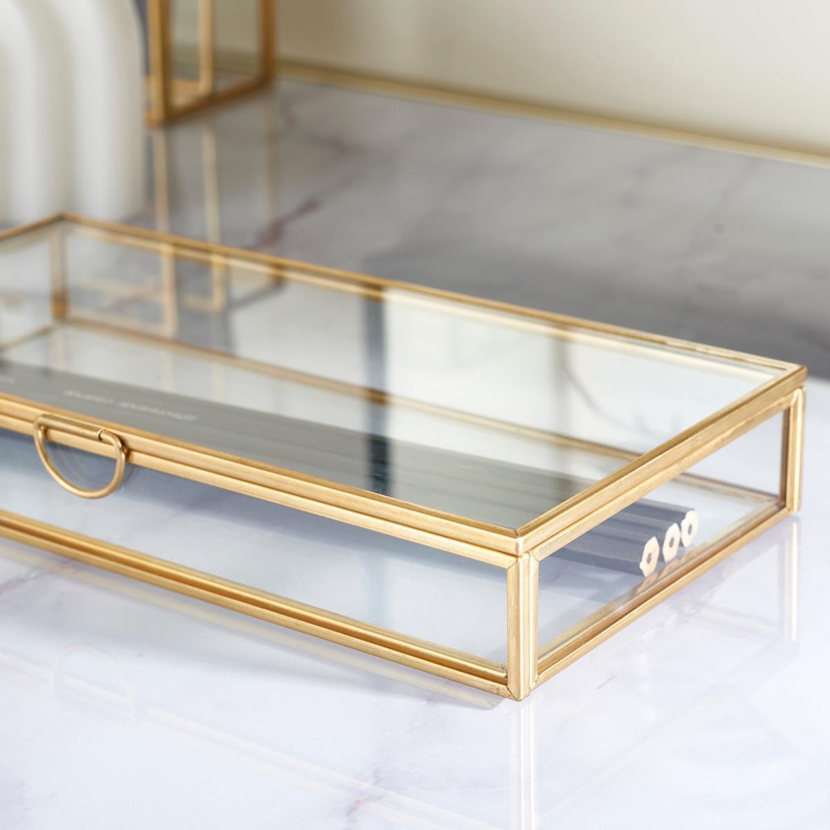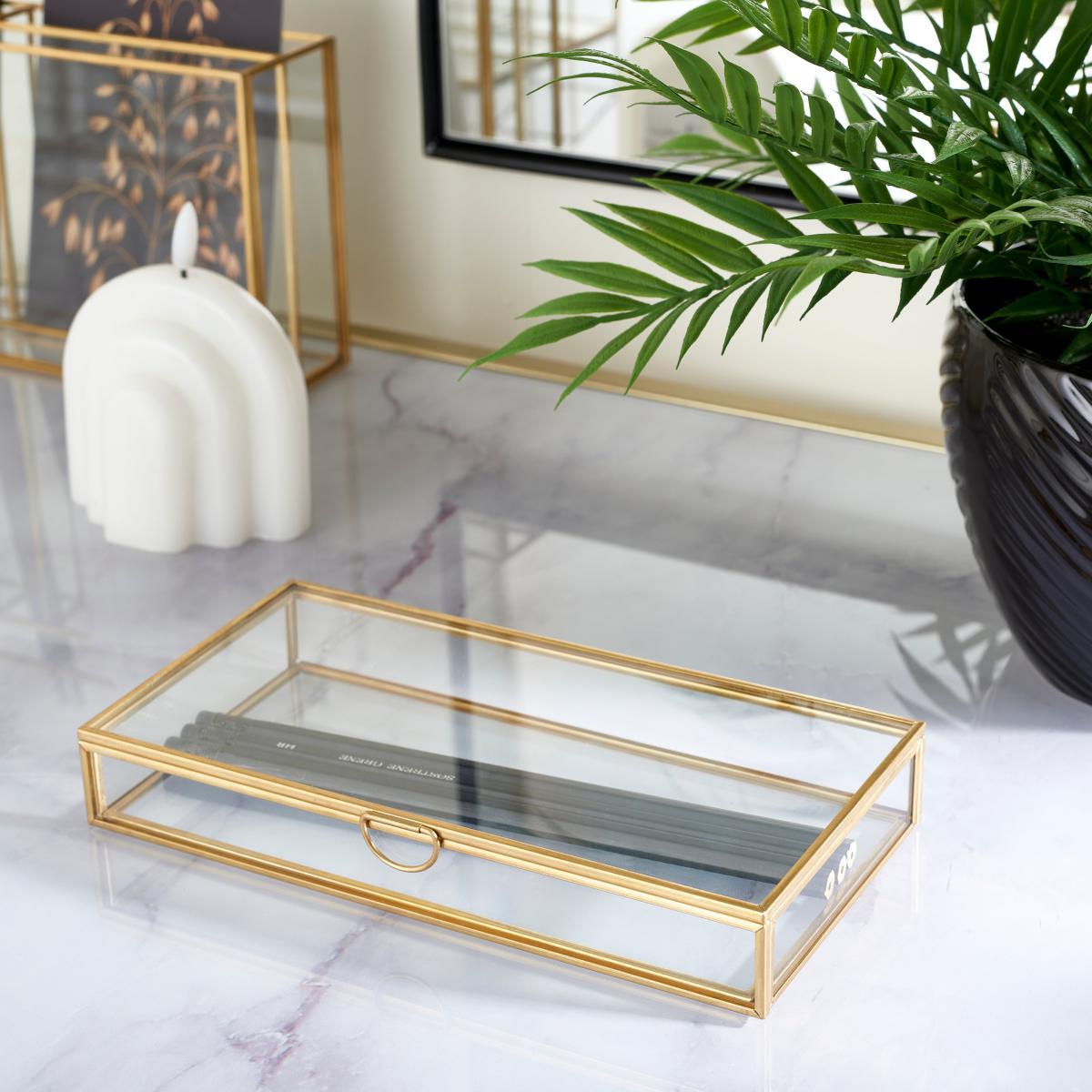 Add a stylish addition to your desk space with this stunning Gold Glass Desk Box organiser, a beautifully designed box made from clear glass with a gold metal frame. This multifunctional storage solution is perfect for organising stationary, pens and pencils.