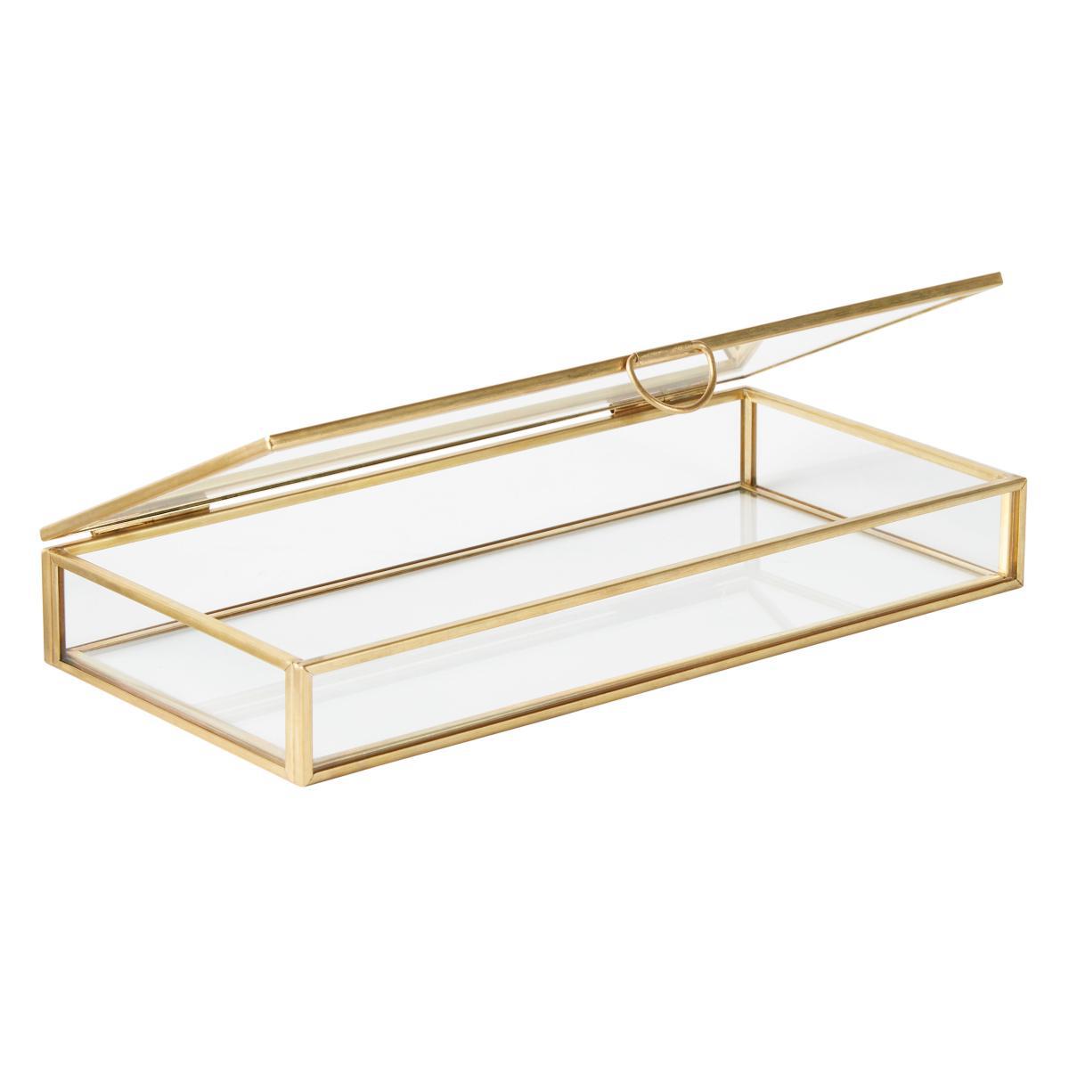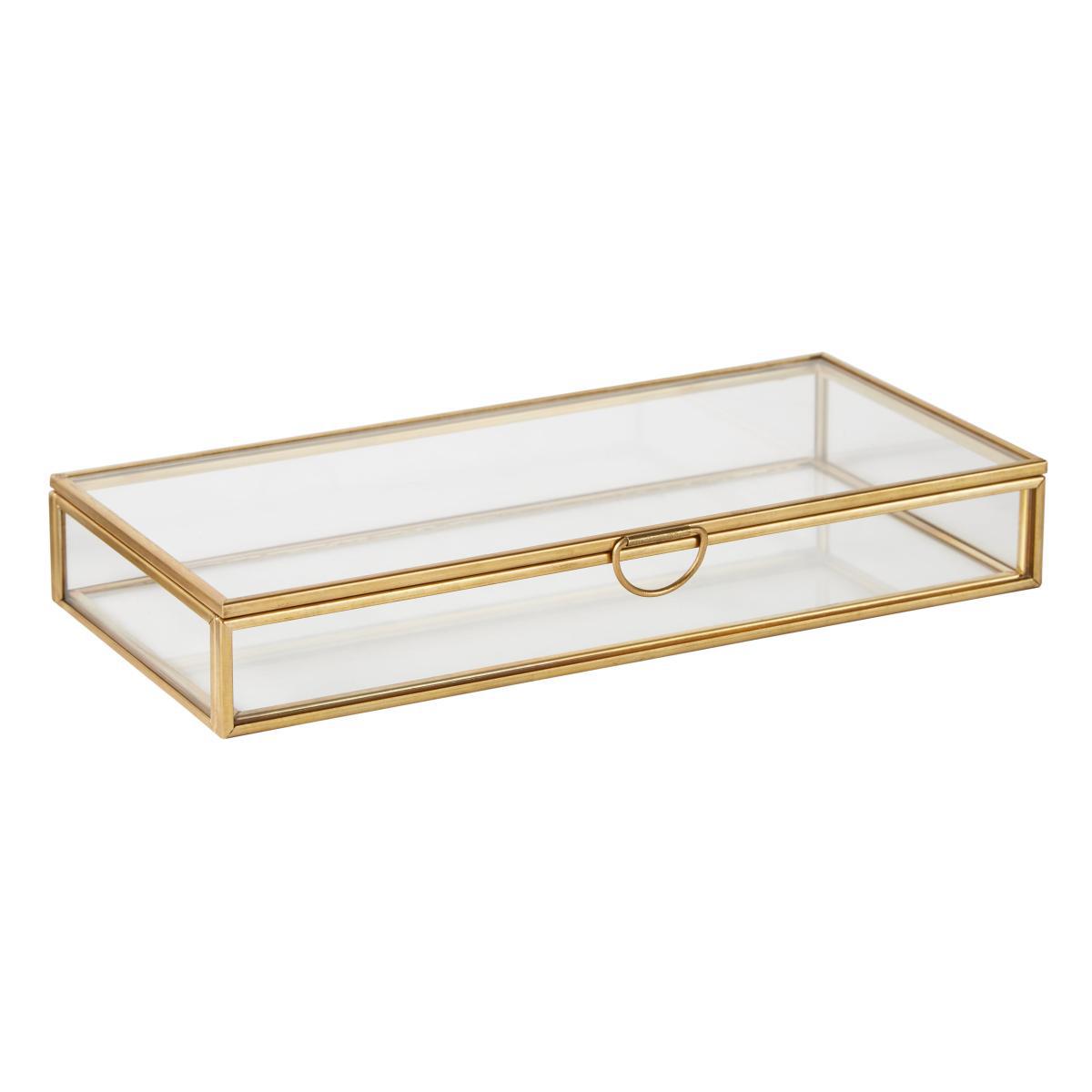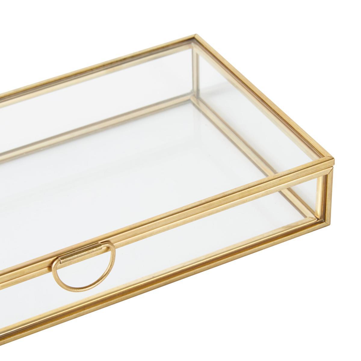 Add a stylish addition to your desk space with this stunning Gold Glass Desk Box organiser, a beautifully designed box made from clear glass with a gold metal frame. This multifunctional storage solution is perfect for organising stationary, pens and pencils.