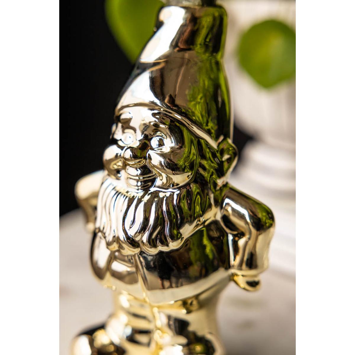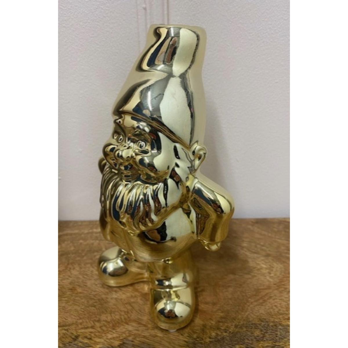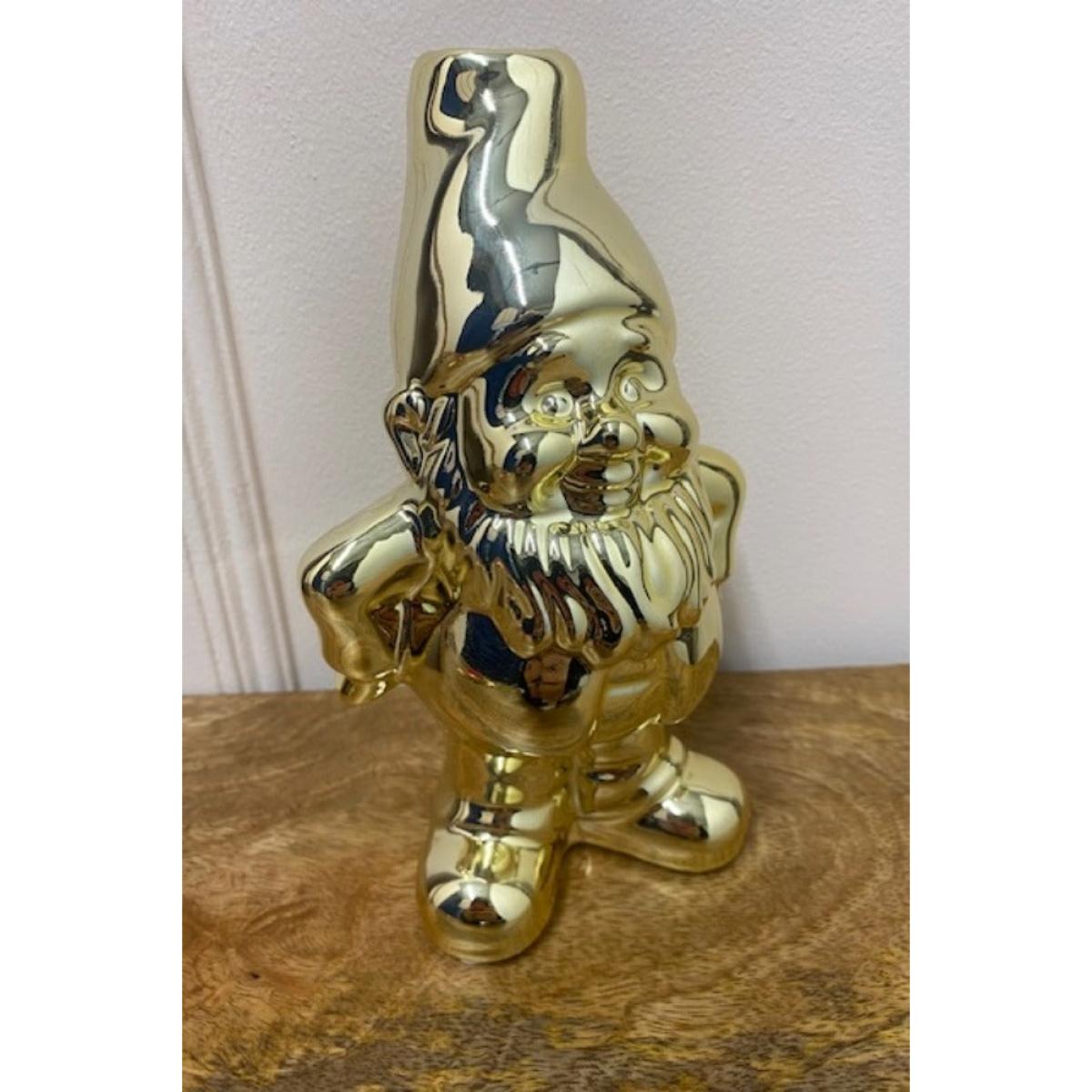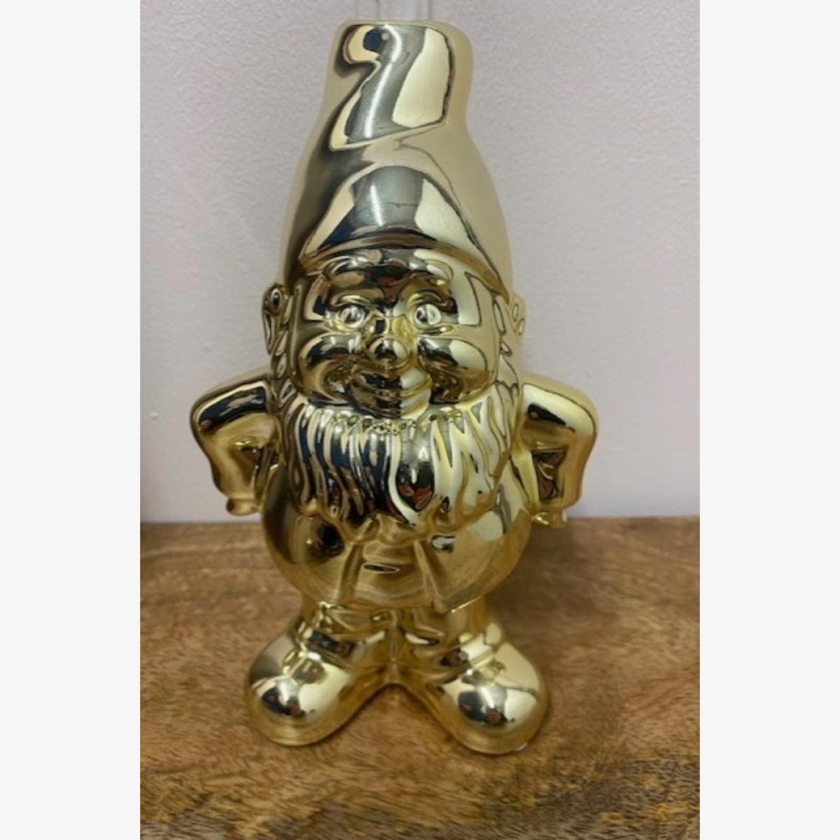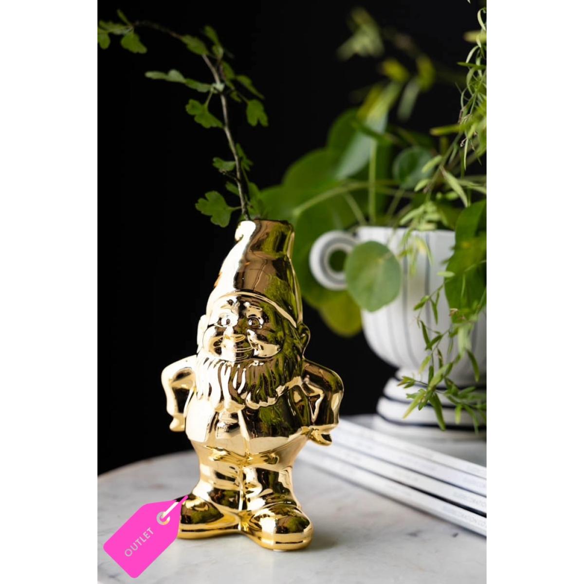 Welcome this quirky little character into your home – because this gnome is so much more than your average garden ornament! Bursting with personality and charm, he doubles as either a vase or a candle holder, perfectly sized for a single stem or a slim dinner candle. Whether he’s taking centre stage on your dining table or keeping you company on the kitchen windowsill, this steadfast fellow brings a touch of shimmer, shine, and cheer wherever he goes. A discontinued piece, he has been removed from his original packaging.- Gold Gnome Single Stem Vase / Candlestick Holder- Material: Metal  - Measures: H17.7cm x W10.5cm x D7.6cm
