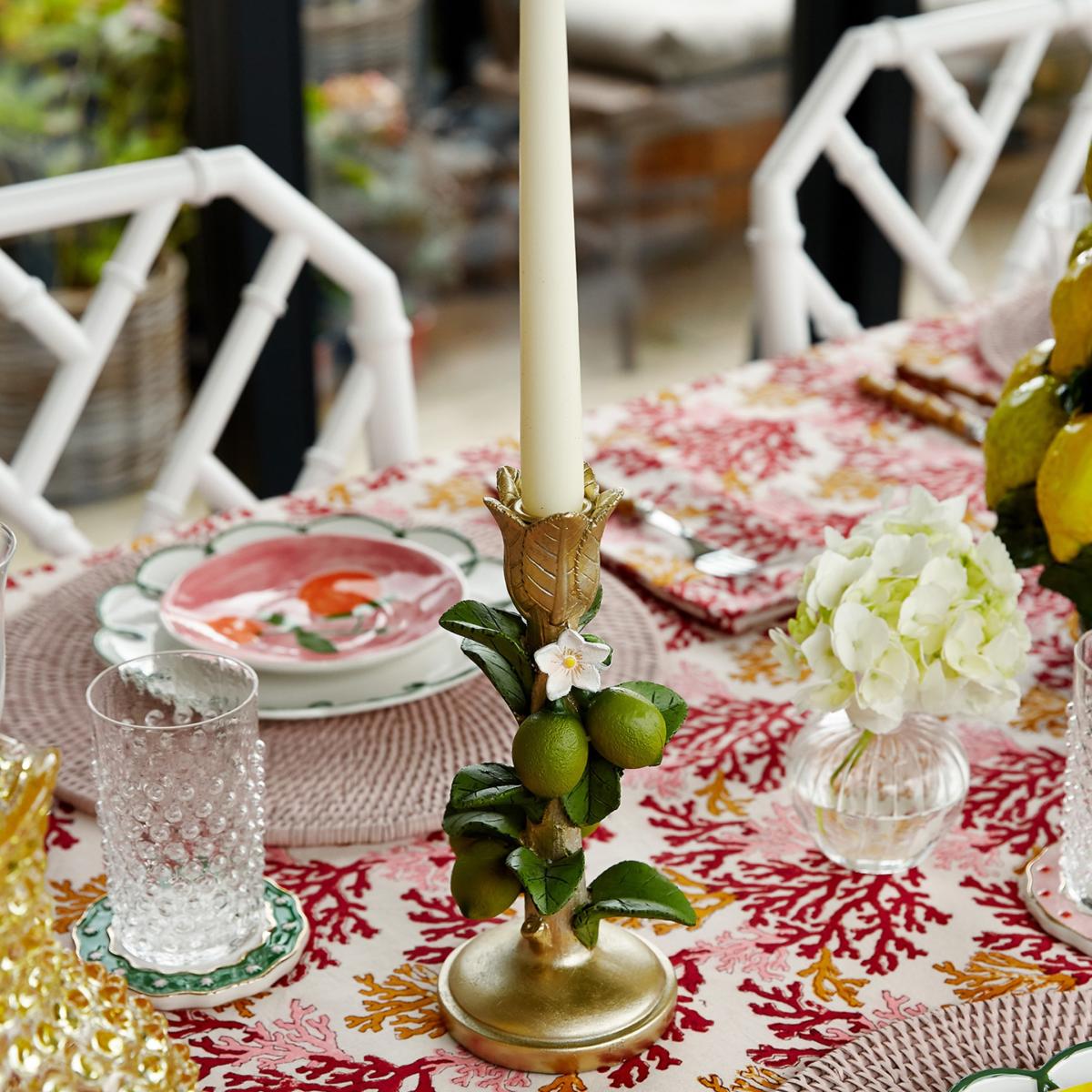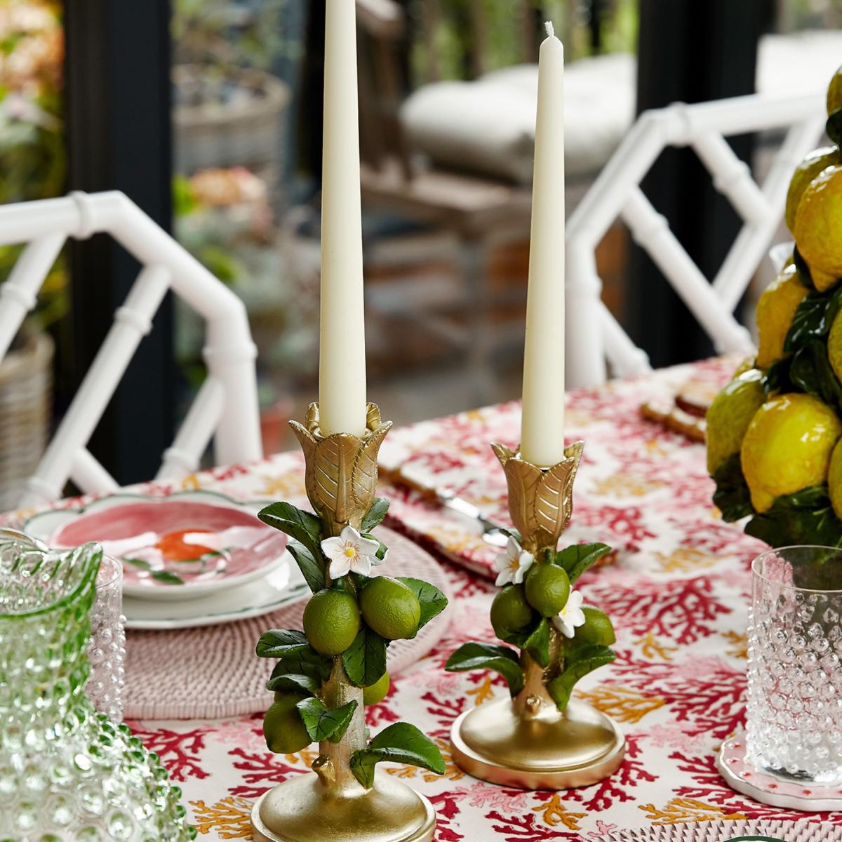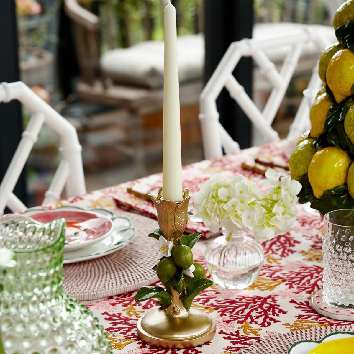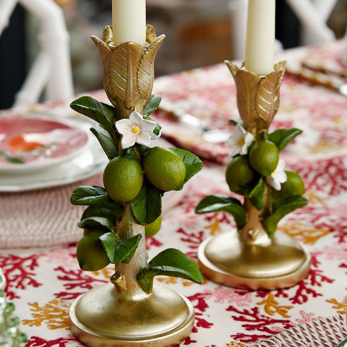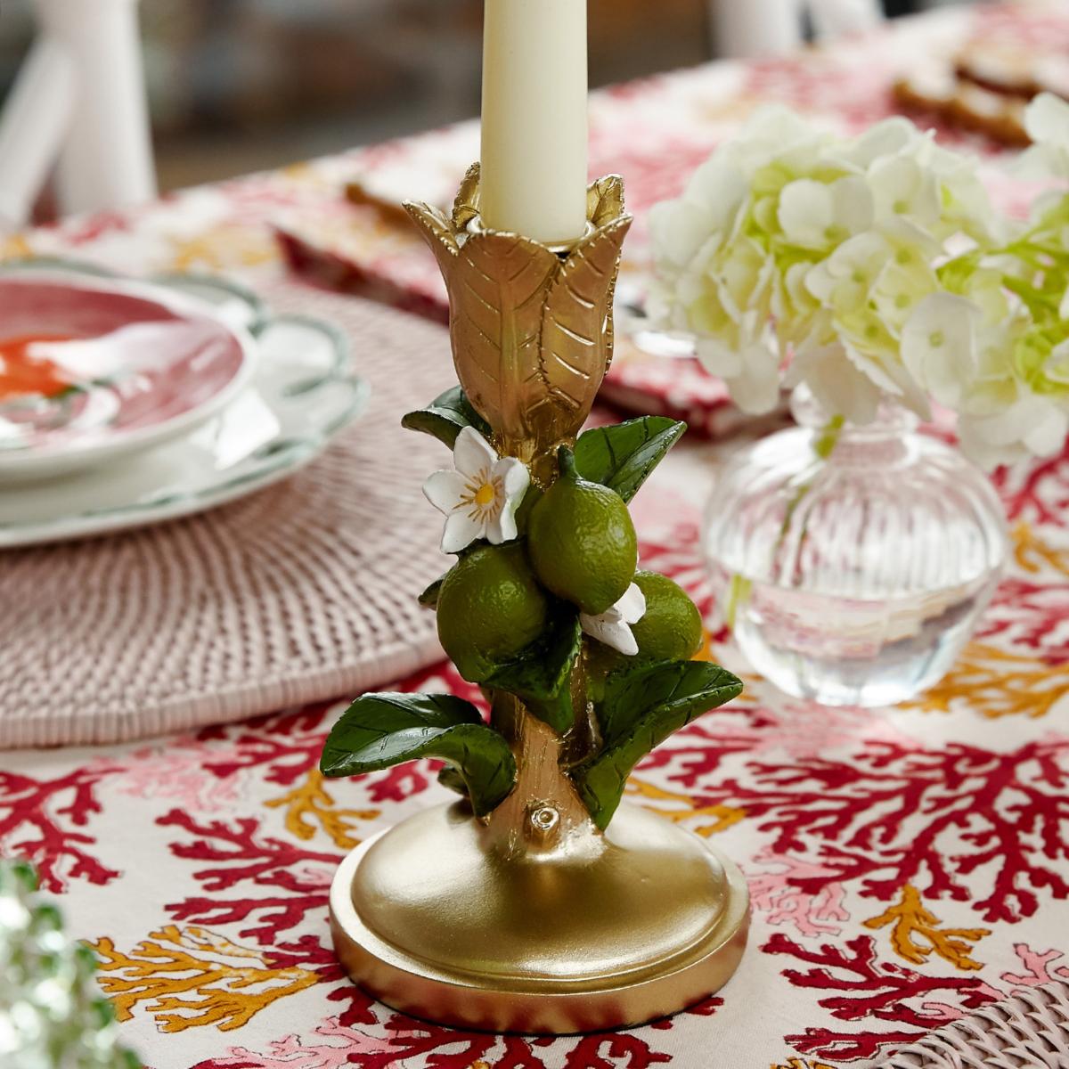 I love this vibrant candleholder for its playful yet elegant personality. The gold finish ensures it can slot seamlessly into both modern and classic interiors, adding a touch of luxe without feeling too formal. Its zesty green and floral details make it a great piece for lively, colour-rich spaces like eclectic kitchens or boho-inspired living rooms. For styling, consider grouping it with other metallic accents or placing it on a neutral tray with candles of varying heights to create a focal point. It works well on side tables, mantels, or even as a centrepiece on a dining table, especially when paired with complementary green or botanical accessories for a fresh, natural vibe.