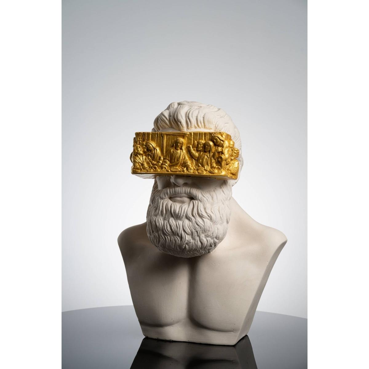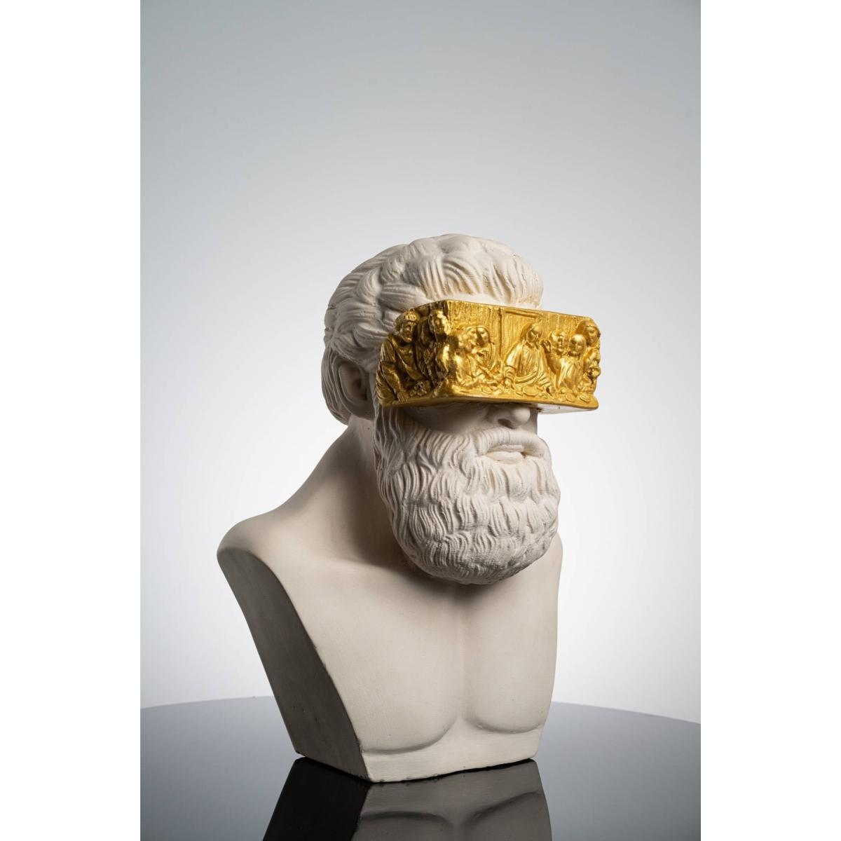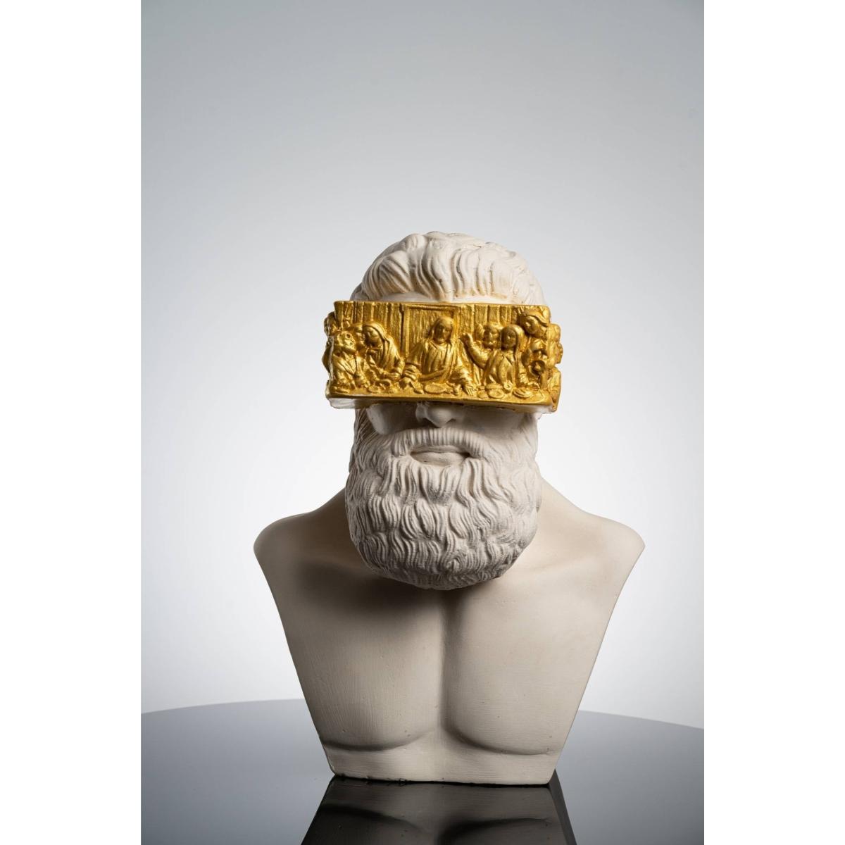 The sacral number twelve… Twelve labors of Hercules… Twelve Disciples of Christ… the white plaster bust of Hercules is adjoined with the golden VR glass depicting the Last Supper of Christ. But why Hercules wears virtual reality glasses to see the future, especially a scene from The Last Supper? Will he tell people that Jesus is mortal in the scene? Or will he just enjoy the moment and see what people eat in the future? The artist has invested all the skills and efforts to present this wonderful piece of art that has both heroic and visionary appeal. Adding it to your home interior will show your refined taste and the pursuit of the beautiful, powerful and sacred.
