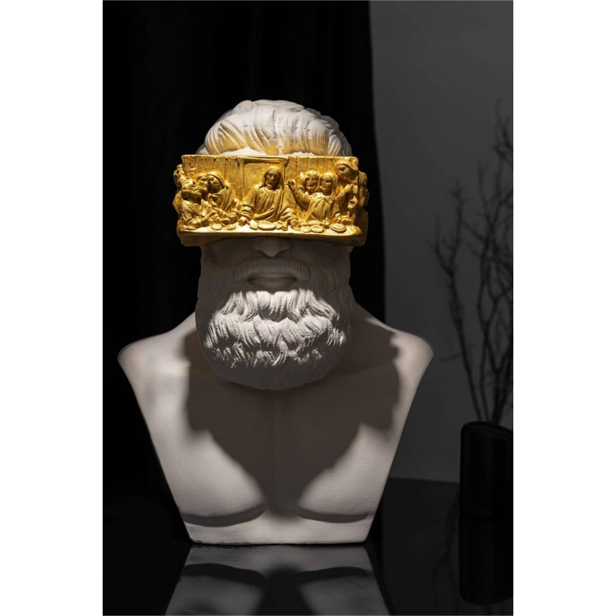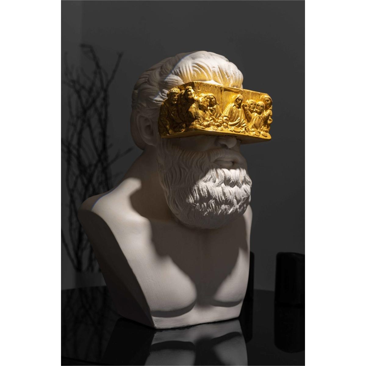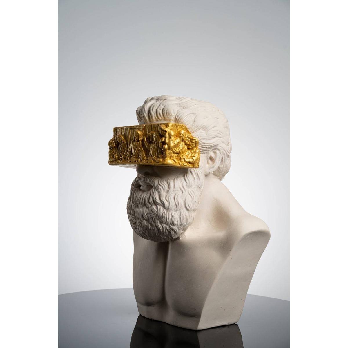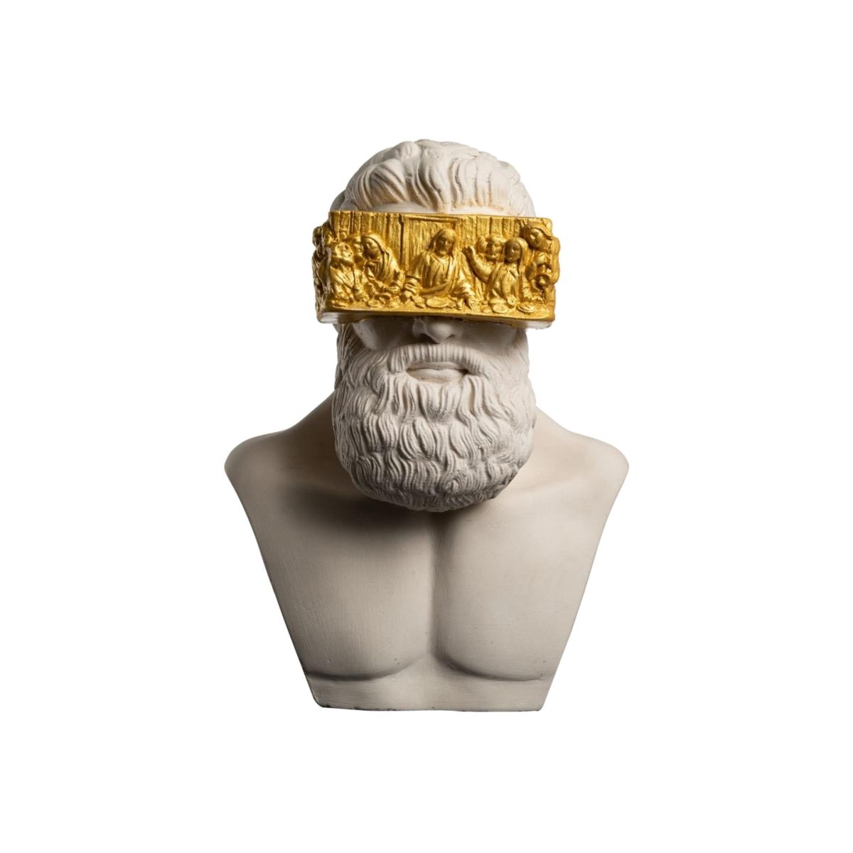 The sacral number twelve… Twelve labors of Hercules… Twelve Disciples of Christ… the white plaster bust of Hercules is adjoined with the golden VR glass depicting the Last Supper of Christ. But why Hercules wears virtual reality glasses to see the future, especially a scene from The Last Supper? Will he tell people that Jesus is mortal in the scene? Or will he just enjoy the moment and see what people eat in the future? The artist has invested all the skills and efforts to present this wonderful piece of art that has both heroic and visionary appeal. Adding it to your home interior will show your refined taste and the pursuit of the beautiful, powerful and sacred.