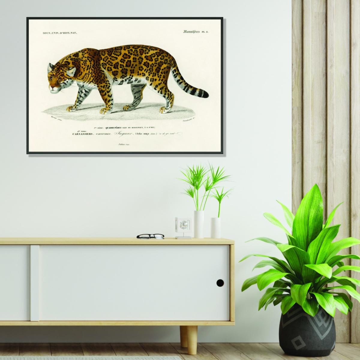 I love this piece for its bold character and vintage charm. The Gold Jaguar is a versatile artwork that can act as a statement piece in a variety of interiors - from eclectic and boho spaces to sleek, contemporary settings. It works particularly well when displayed alongside rich textures or paired with other golden accents to create a warm, luxurious feel. Practical styling tips include placing it above a neutral sofa or sideboard to draw attention or using it as a focal point in a gallery wall with other botanical or animal prints. To pay homage to its vintage roots, consider framing it in a classic antique or gold-toned frame to enhance its character and tie it into a sophisticated, curated look.
