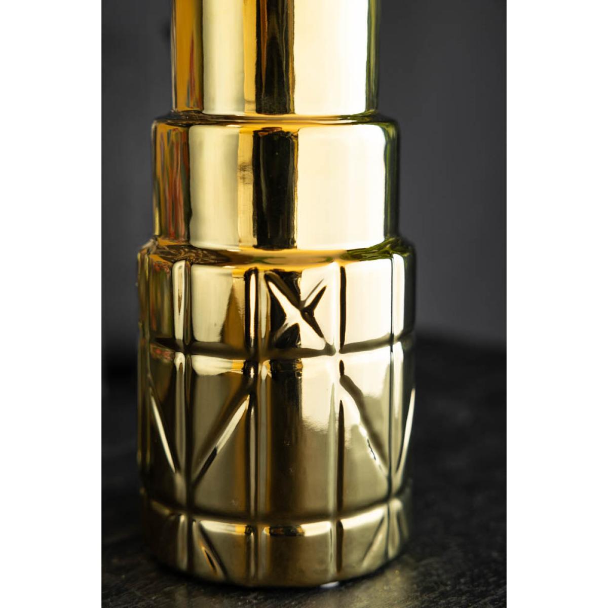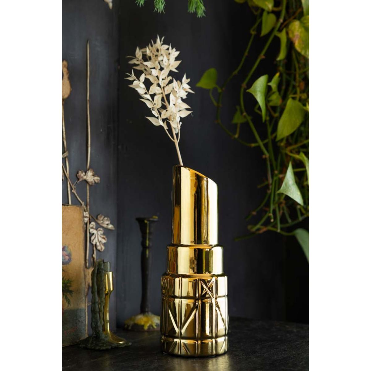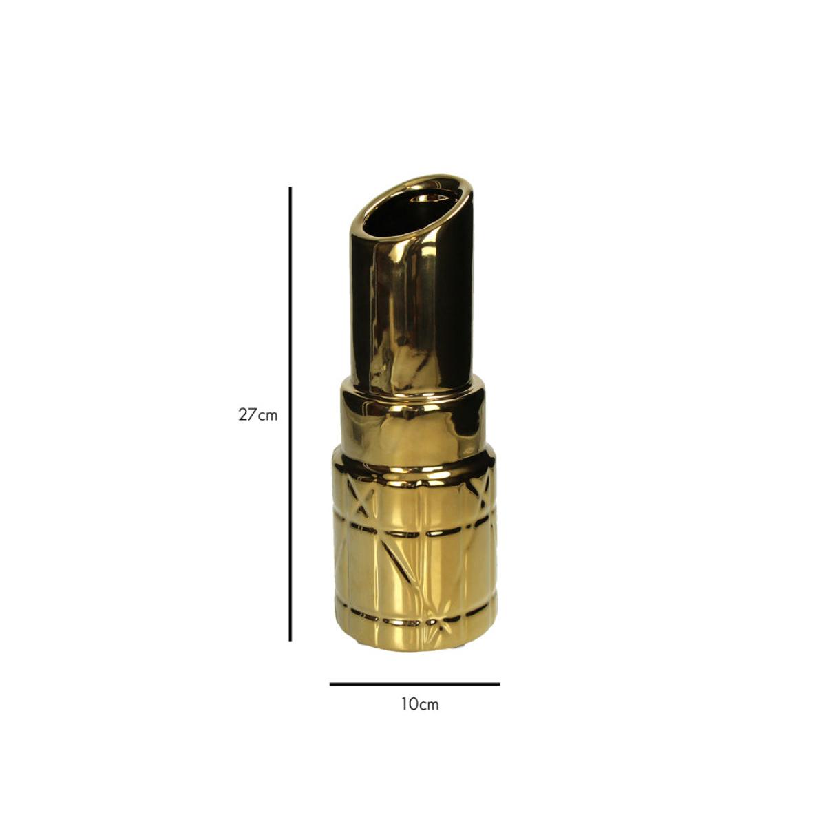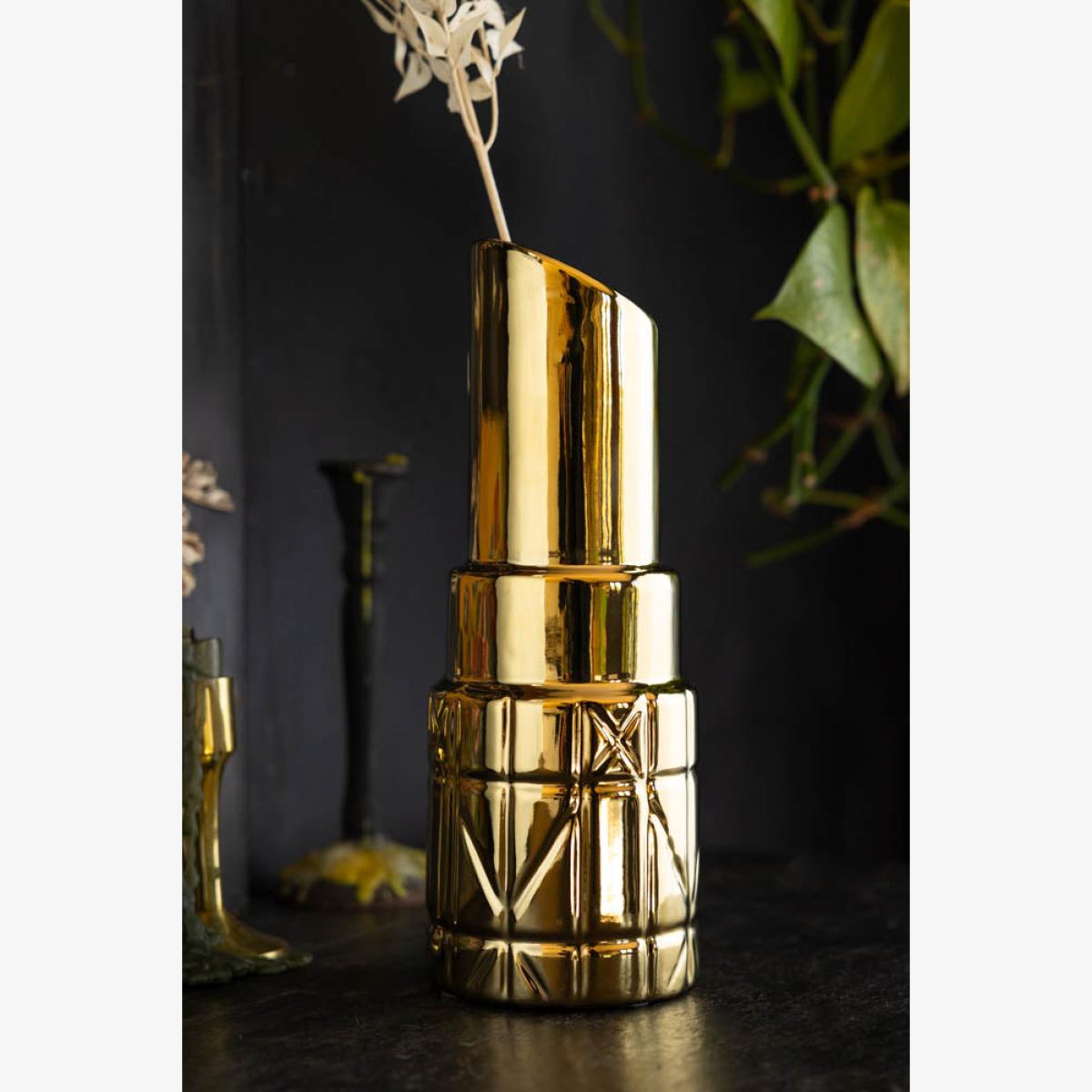 Give in to maximalist glamour with the Gold Lipstick Vase. Inspired by the captivating world of beauty, this unique flower vase aims to boost your mood in a similar fashion to wearing your favourite shade of lipstick. There is something about a bold lip that makes you feel confident, polished and ready to take on the world! Whether you opt for a bold red lip or subtle pale pinks to complete your look, the effect is the same. With a high-shine finish and decorative details that exude Hollywood glamour, the gold vase promises to make the same statement in your home. Style yours in the living room for a playful take on classic flower vases, or add the Gold Lipstick Vase to your dressing table in the bedroom to create a chic corner for glam. You deserve it, darlings! - Gold lipstick tall vase - Measures: H27cm x W10cm - Made from porcelain with a shiny gold finish
