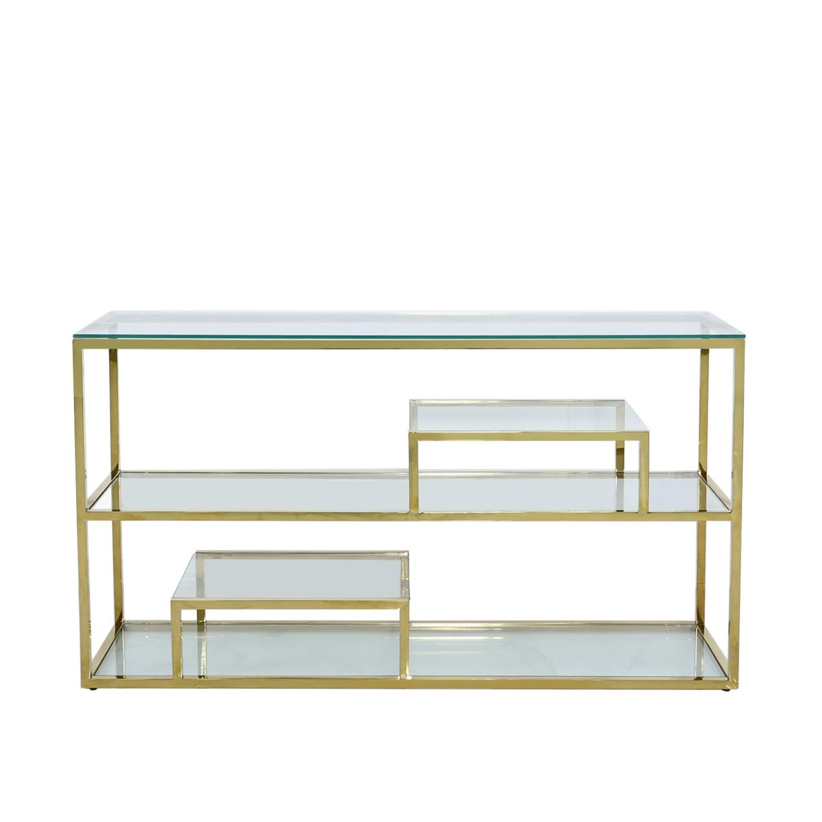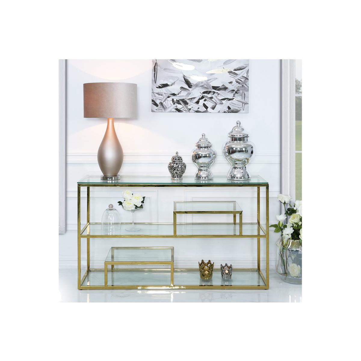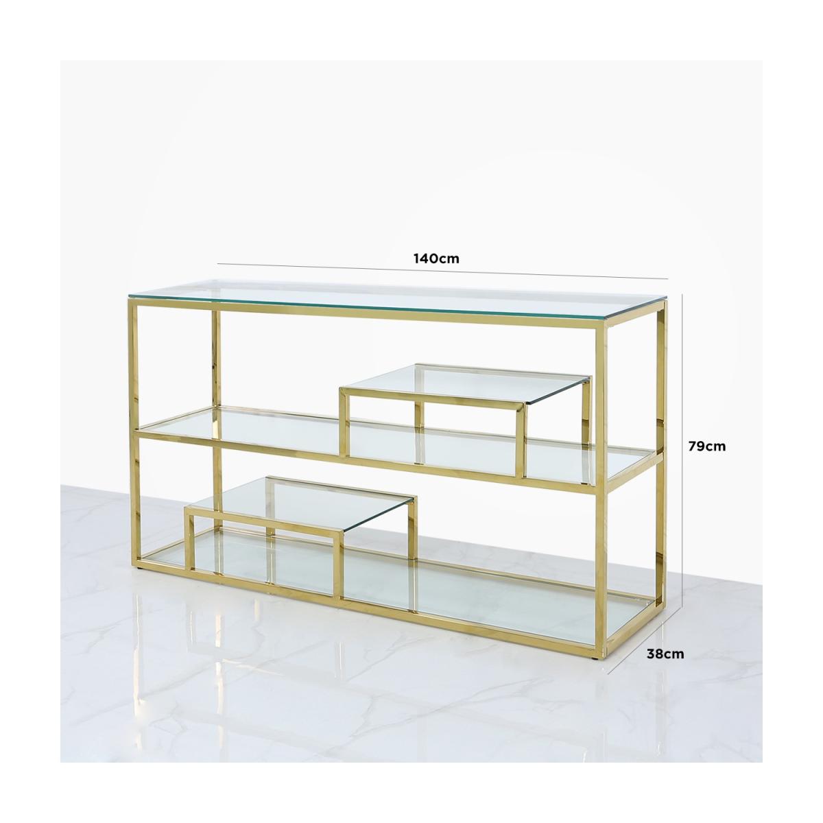 Complete any entry or hallway with this luxurious console table, featuring tiered shelves for decorations, books or even a telephone, the possibilities are endless with this stunning design. The clear glass tops are made with toughened tempered glass meaning they are strong and safe. Handily, the glass surface is also effortless to maintain with its easy to wipe clean surface. The gold steel frame provides not only a sturdy base for the glass to sit upon but also gives the console table a look of true elegance and luxury, ideal for your home.