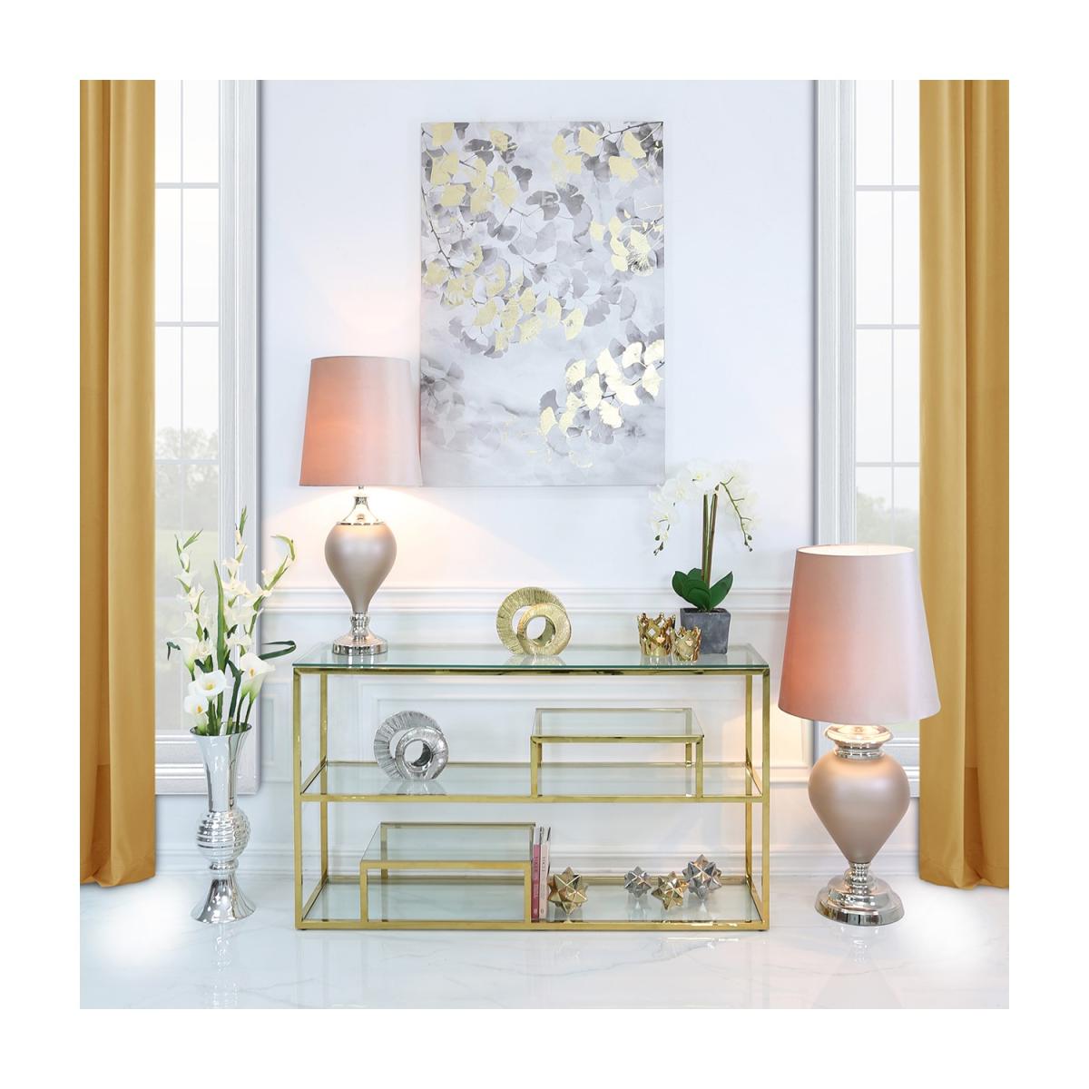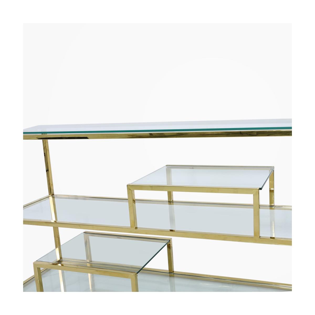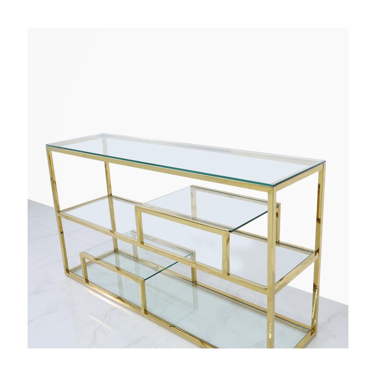 Complete any entry or hallway with this luxurious console table, featuring tiered shelves for decorations, books or even a telephone, the possibilities are endless with this stunning design. The clear glass tops are made with toughened tempered glass meaning they are strong and safe. Handily, the glass surface is also effortless to maintain with its easy to wipe clean surface. The gold steel frame provides not only a sturdy base for the glass to sit upon but also gives the console table a look of true elegance and luxury, ideal for your home.