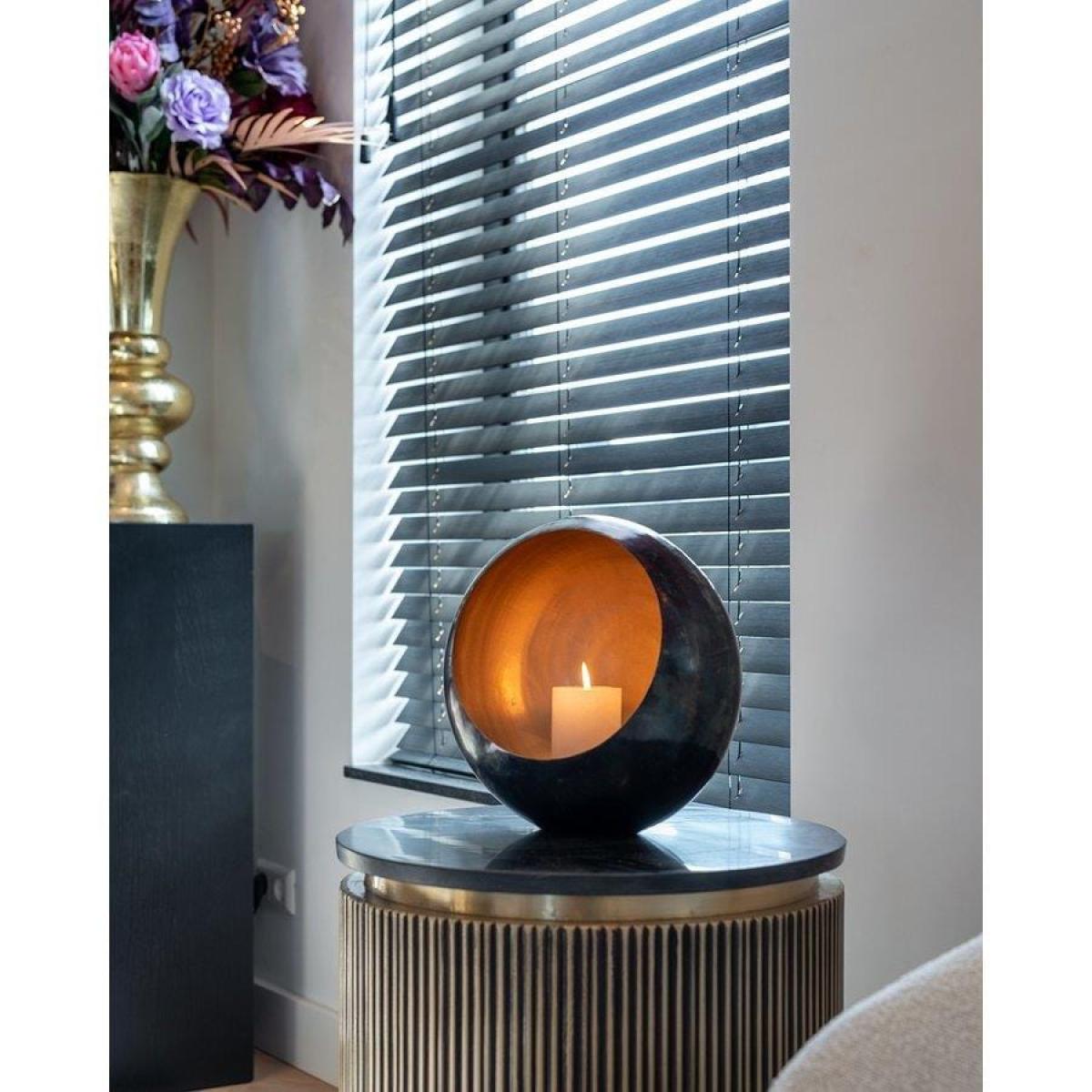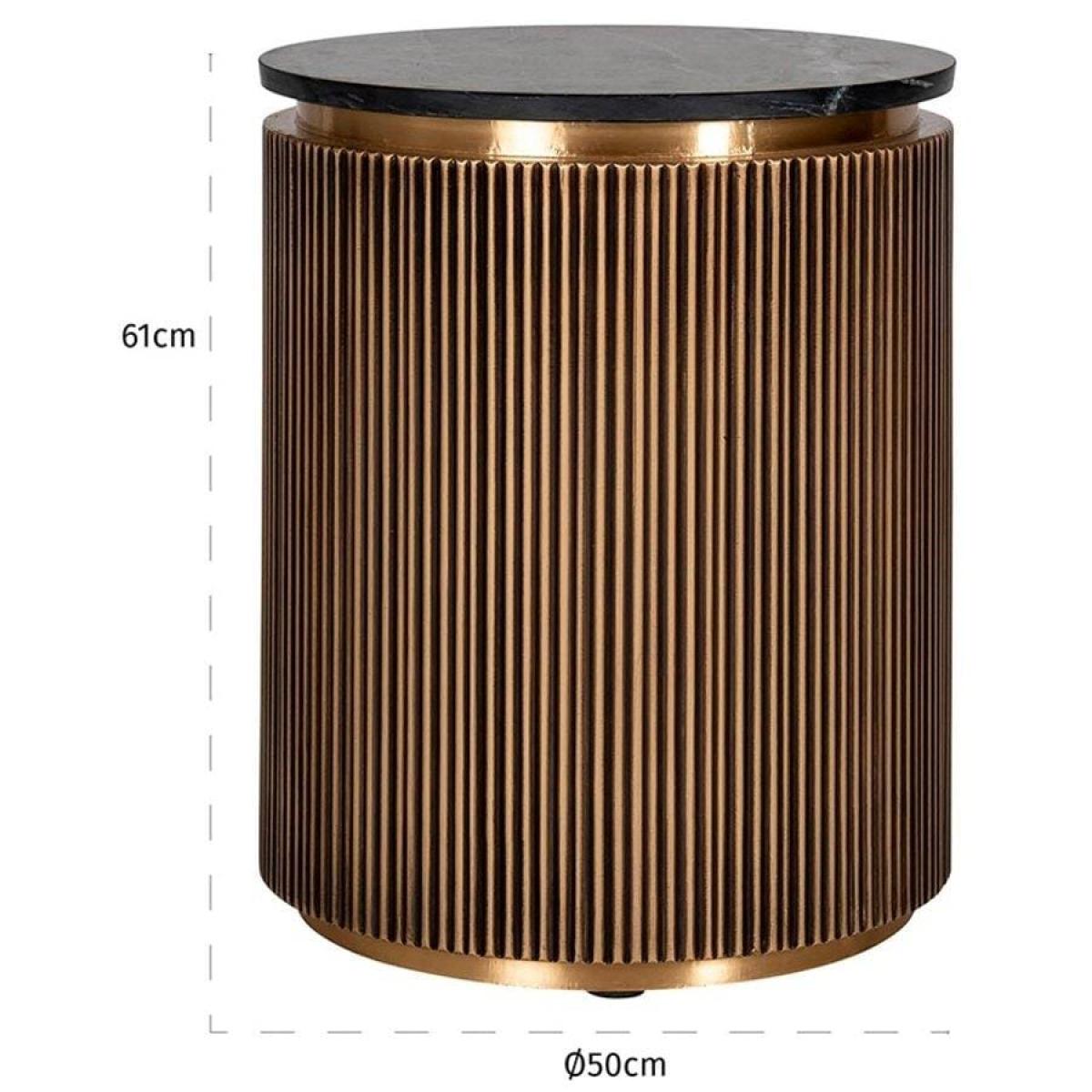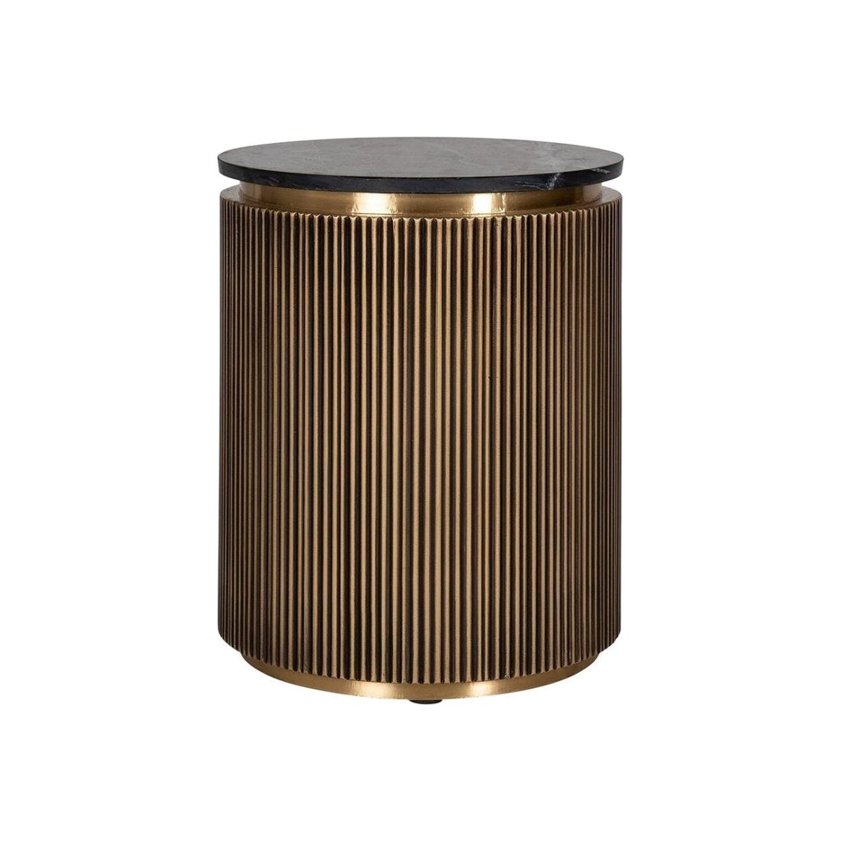 The Ironville Gold Drum Side Table brings together modern and mid-century forms. The cylindrical design features a ribbed brass metal sheet body finished in a golden tone that exudes opulence and luxury, while nodding to styles of the 1960s. A black marble top completes the look. This gold side table offers a rigid and streamline structure reminiscent of mid-century furniture styles. The vertical ribbed design injects a space with instant definition. Use either side of a bed or at the sofa side to bring vibrant colour and a luxe feel to a space. W50cm D50cm H61cm Gold Drum Lamp Table With Marble Top Find matching products in the Ironville Range