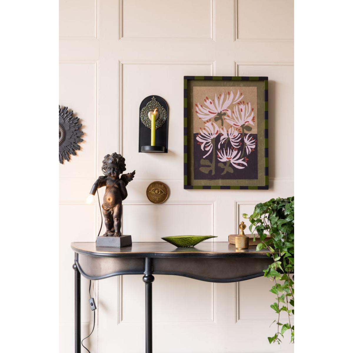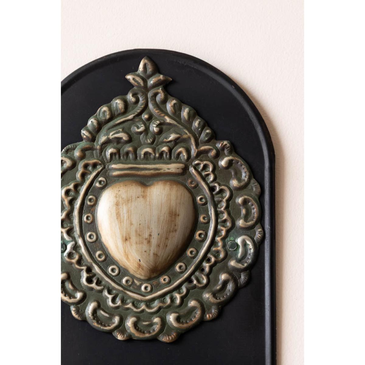 This candle holder is an instant mood setter. The Gold Milagro Heart Candlestick Wall Sconce brings a little old-world romance and soulful glow to any space. With its rich, dark backdrop and striking embossed sacred Milagro heart in antiqued gold, it’s a unique candlestick holder that feels like it’s been plucked from a candlelit chapel or dreamy old hacienda. Designed to hold a single taper candle, this wall sconce casts a soft, flickering light that dances beautifully across the ornate detailing. It’s perfect for adding a sense of warmth and quiet drama to your hallway, wall lights or bedroom – anywhere you’d like a touch of magic. A little sacred, a little sultry and completely captivating. - Gold Milagro Heart Candlestick Wall Sconce - Measures: W13cm x H33cm x D13cm - Material: Iron