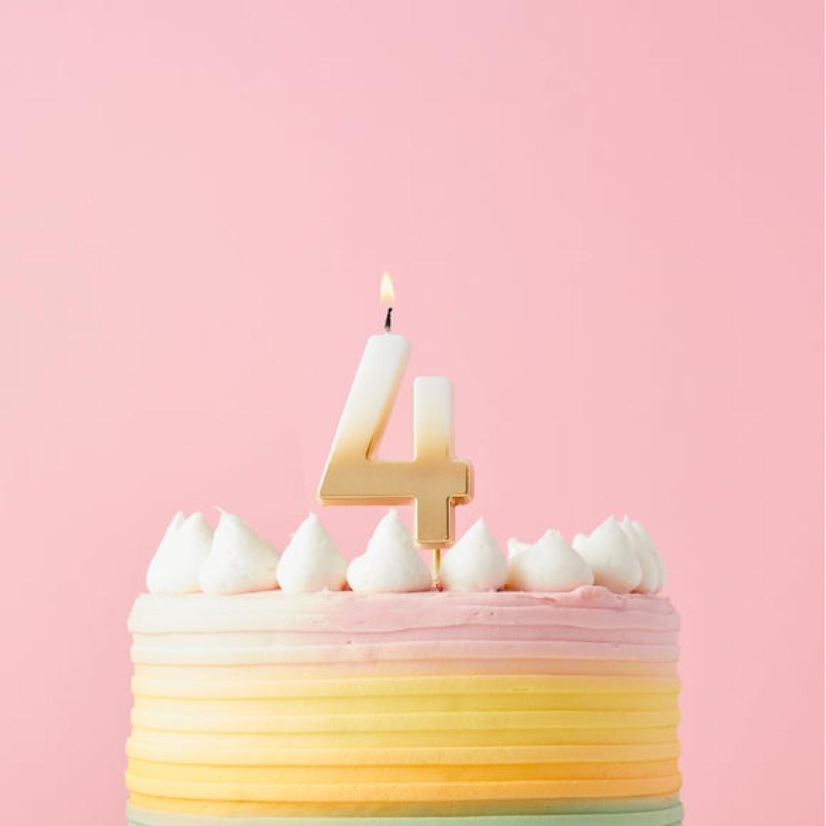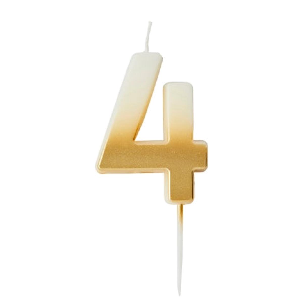 * Gorgeous gold ombre design * Ideal cake topper size * Slow burning time * Available in other numbers and colours Top off your cake in shimmering style with our Gold Ombre Number '4' Candle. Featuring a gorgeous ombre finish and slow-burning design, it’s the perfect size for birthday cakes and is available in other numbers and colours to suit any celebration.