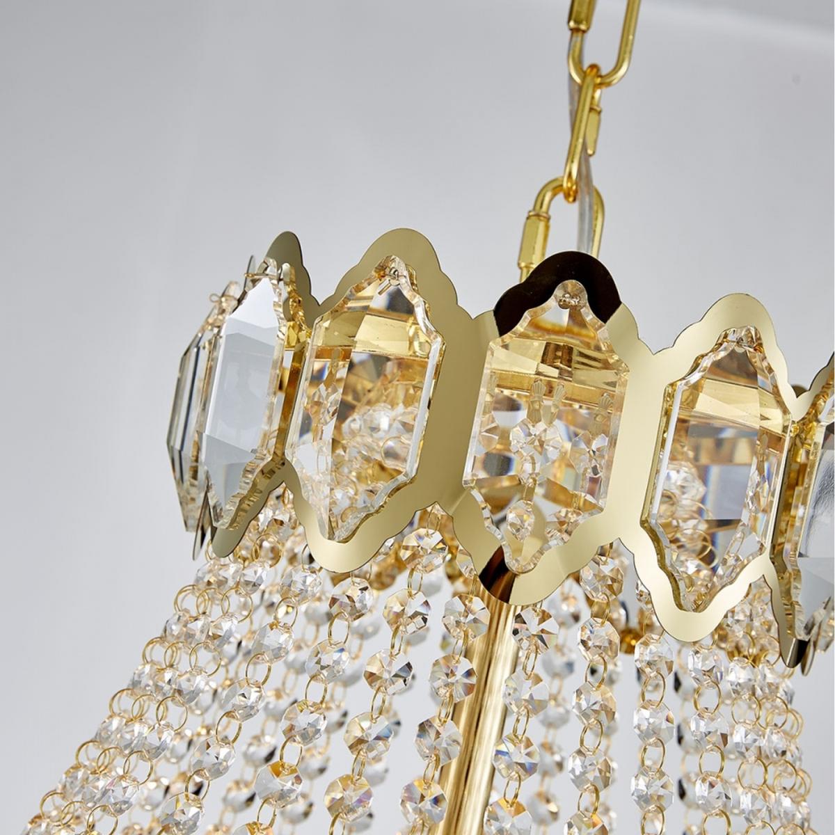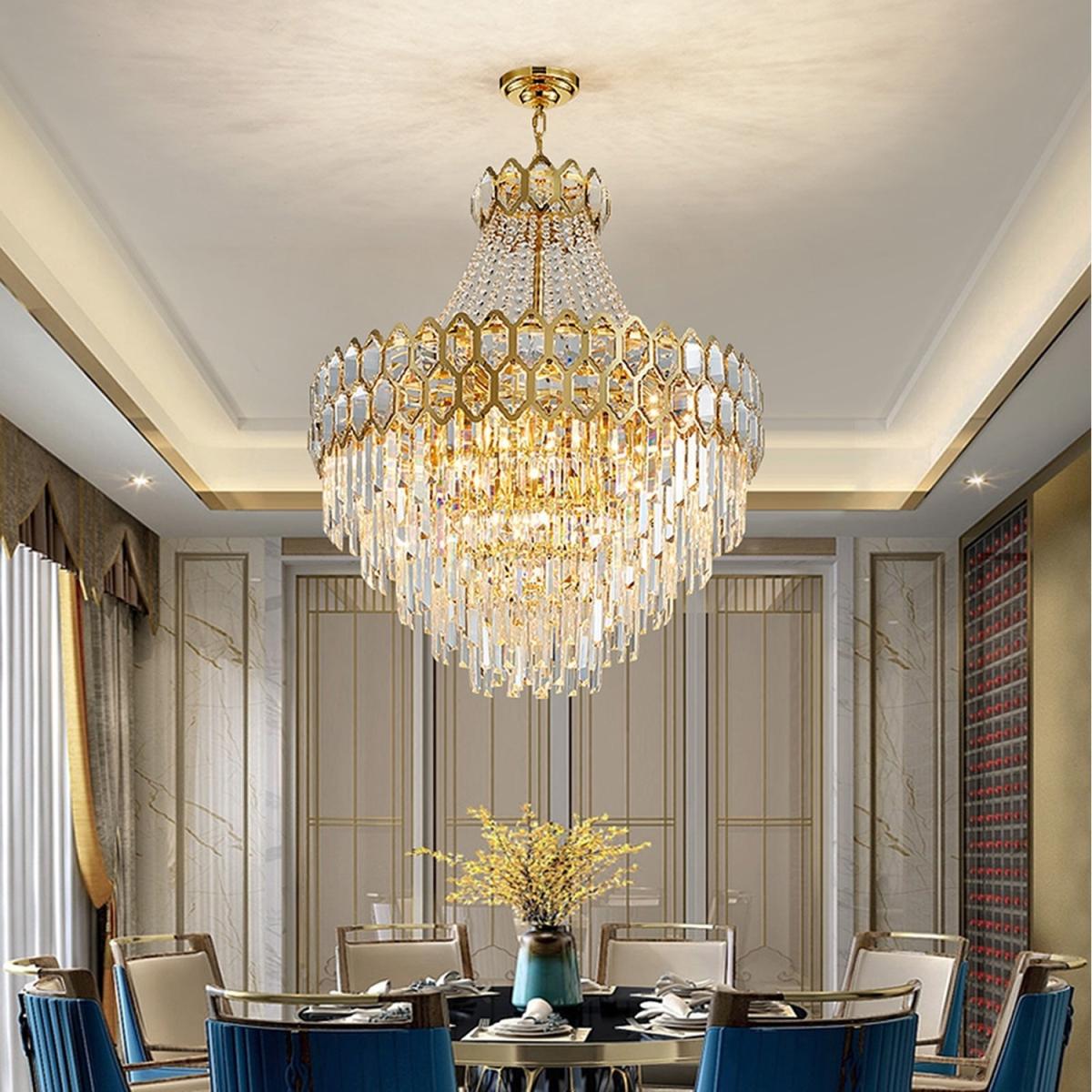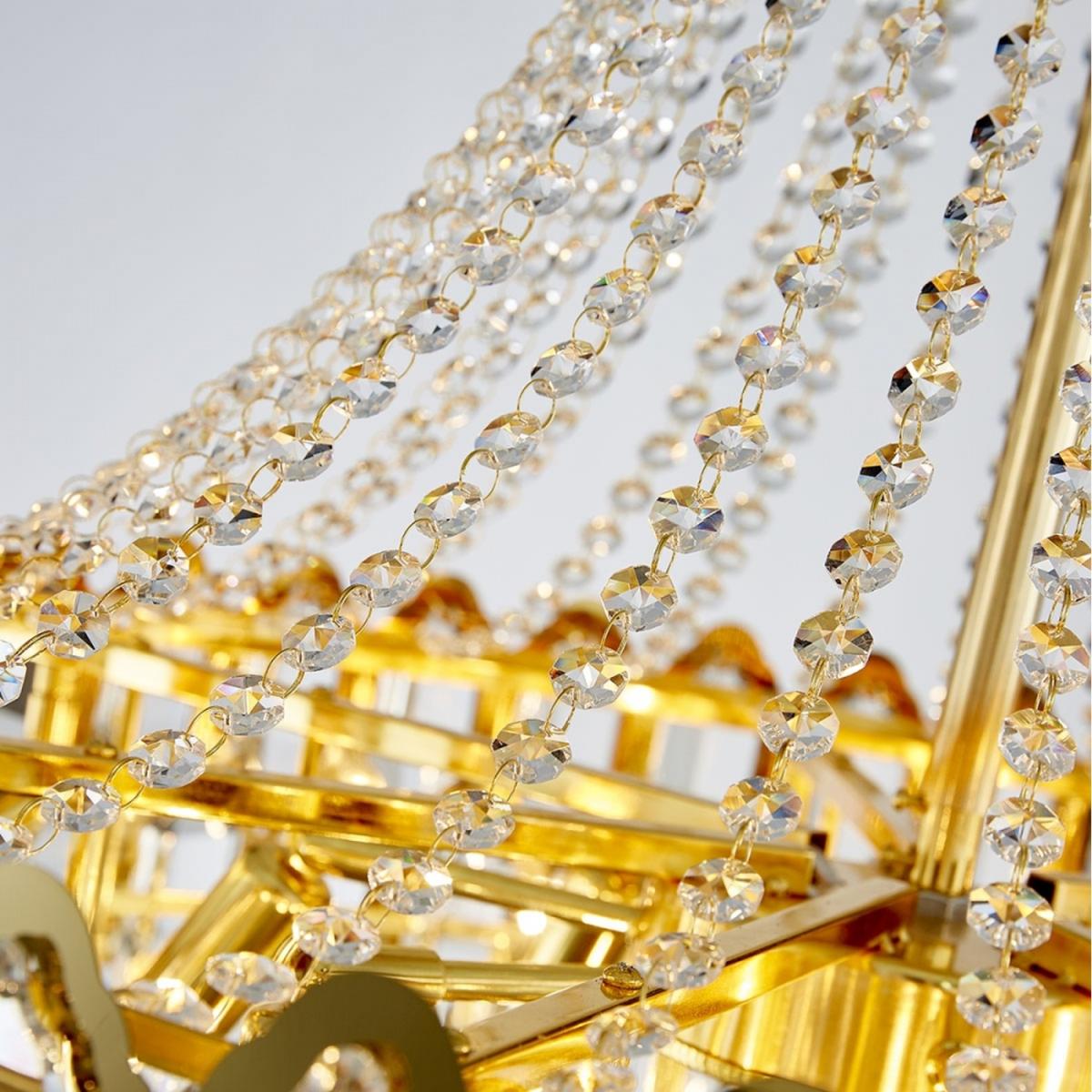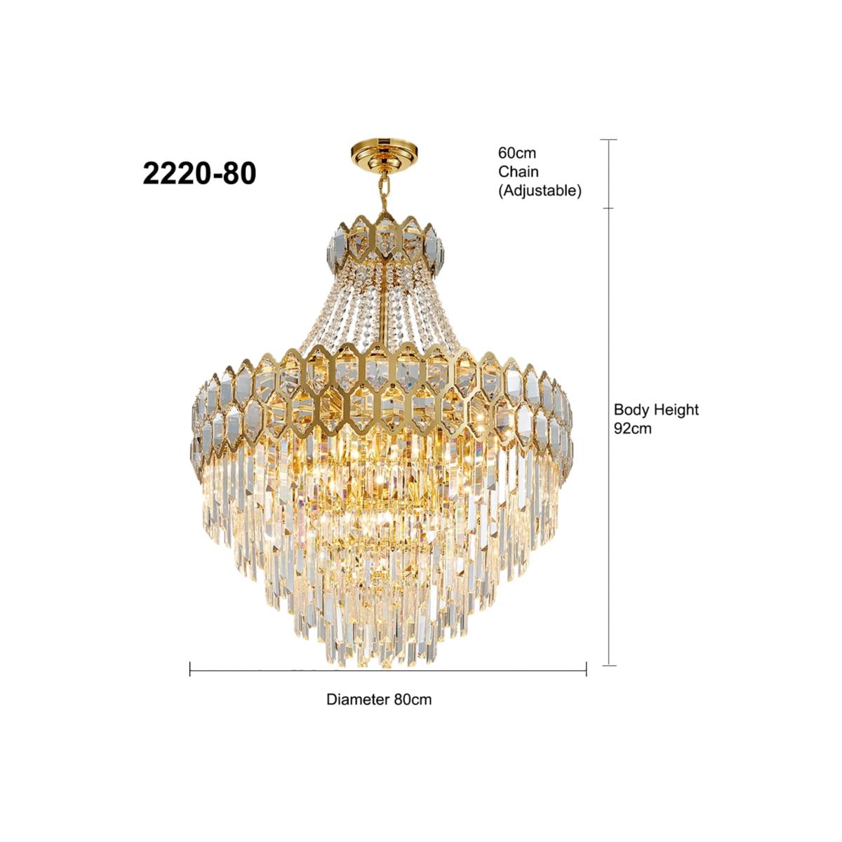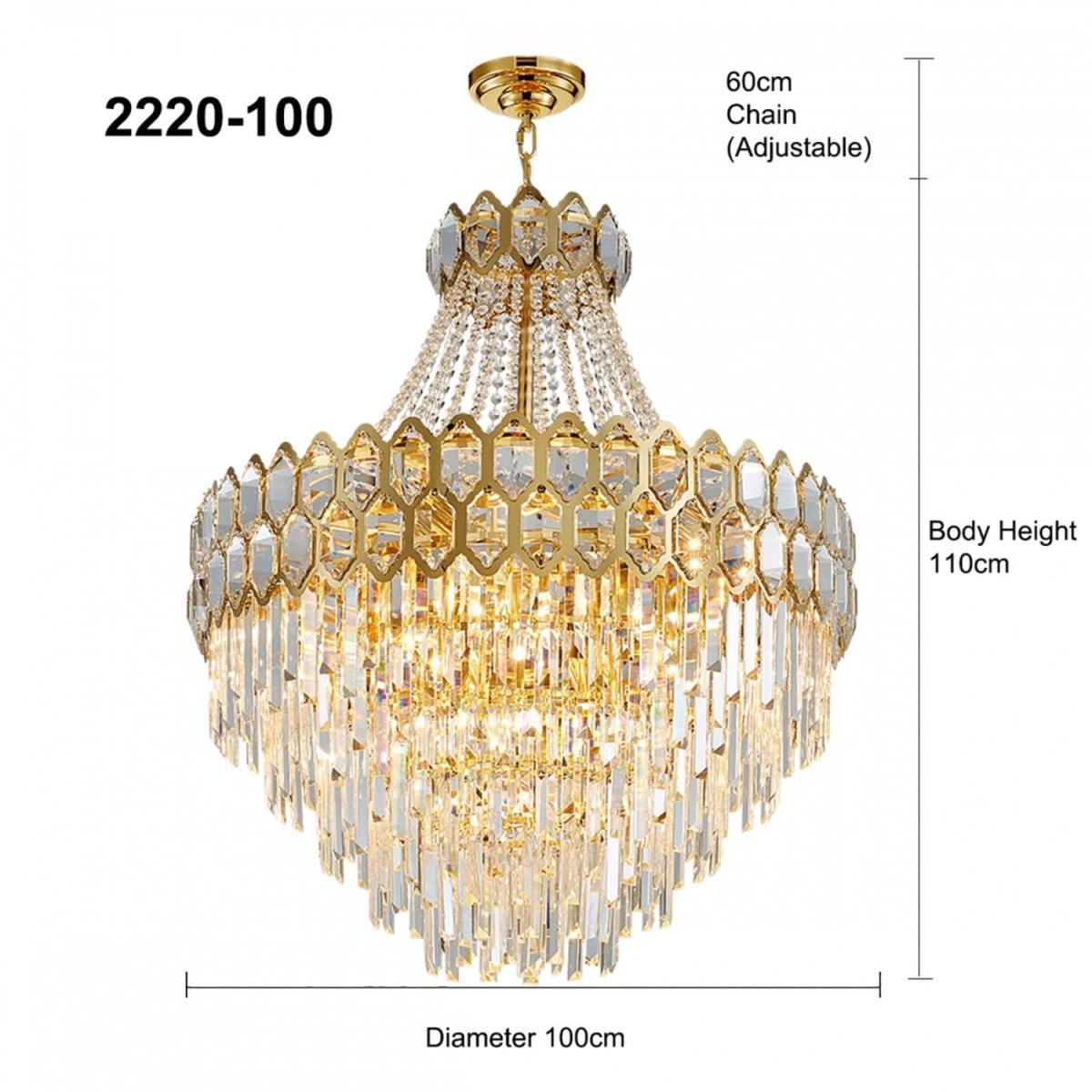11 Bulbs Diameter: 60cm. Style: crystal, modern/contemporary Suggested space size: up to 20-25 sq.m. Number of lights: E14 x 11. Finish: Electroplated. Materials: K9 Crystal and Metal Dimmable with E14 Dimmable Bulbs. Lighting direction: ambient light. Power:Max 40W x 11 E14 Net weight: 19 kg. Body Diameter: 60 cm. Body Height: 71 cm. Chain Length: 60 cm (Adjustable)17 Bulbs Diameter: 80cm. Style: crystal, modern/contemporary Suggested space size: up to 25-30 sq.m. Number of lights: E14 x 17 Finish: Electroplated. Materials: K9 Crystal and Metal Dimmable with E14 Dimmable Bulbs. Lighting direction: ambient light. Power:Max 40W x 17 E14. Net weight: 29.5 kg. Body Diameter: 80 cm. Body Height: 92 cm. Chain Length: 60 cm (Adjustable)22 Bulbs Diameter: 100cm. Style: crystal, modern/contemporary Suggested space size: up to 30-35 sq.m. Number of lights: E14 x 22. Finish: Electroplated. Materials: K9 Crystal and Metal Dimmable with E14 Dimmable Bulbs. Lighting direction: ambient light. Power:Max 40W x 22 E14 Net weight: 41.8 kg. Body Diameter: 100 cm. Body Height: 110 cm. Chain Length: 60 cm (Adjustable)