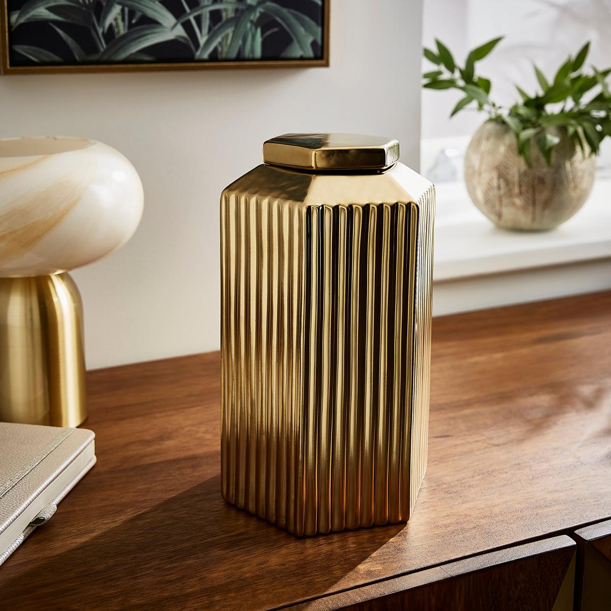 I love the gold ribbed ginger jar for its modern take on a classic silhouette, making it a versatile piece that can elevate various interiors. Its striking metallic finish adds a touch of glamour, perfect for styling on sideboards, shelves, or as a statement piece in minimalist or contemporary spaces. To optimise its impact, consider pairing it with neutral tones or contrasting textures like matte ceramics or wooden accents. It's especially suited for interiors with a hint of luxe or an eclectic vibe, and it works well with both fresh stems or as a standalone decorative object. Practical tip: keep it at eye level or slightly below to emphasise its geometric detailing and shiny finish.