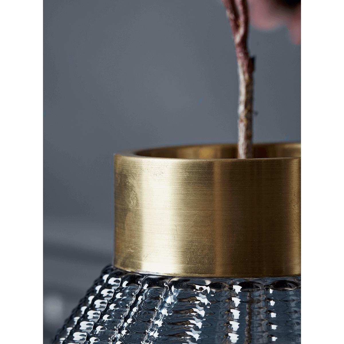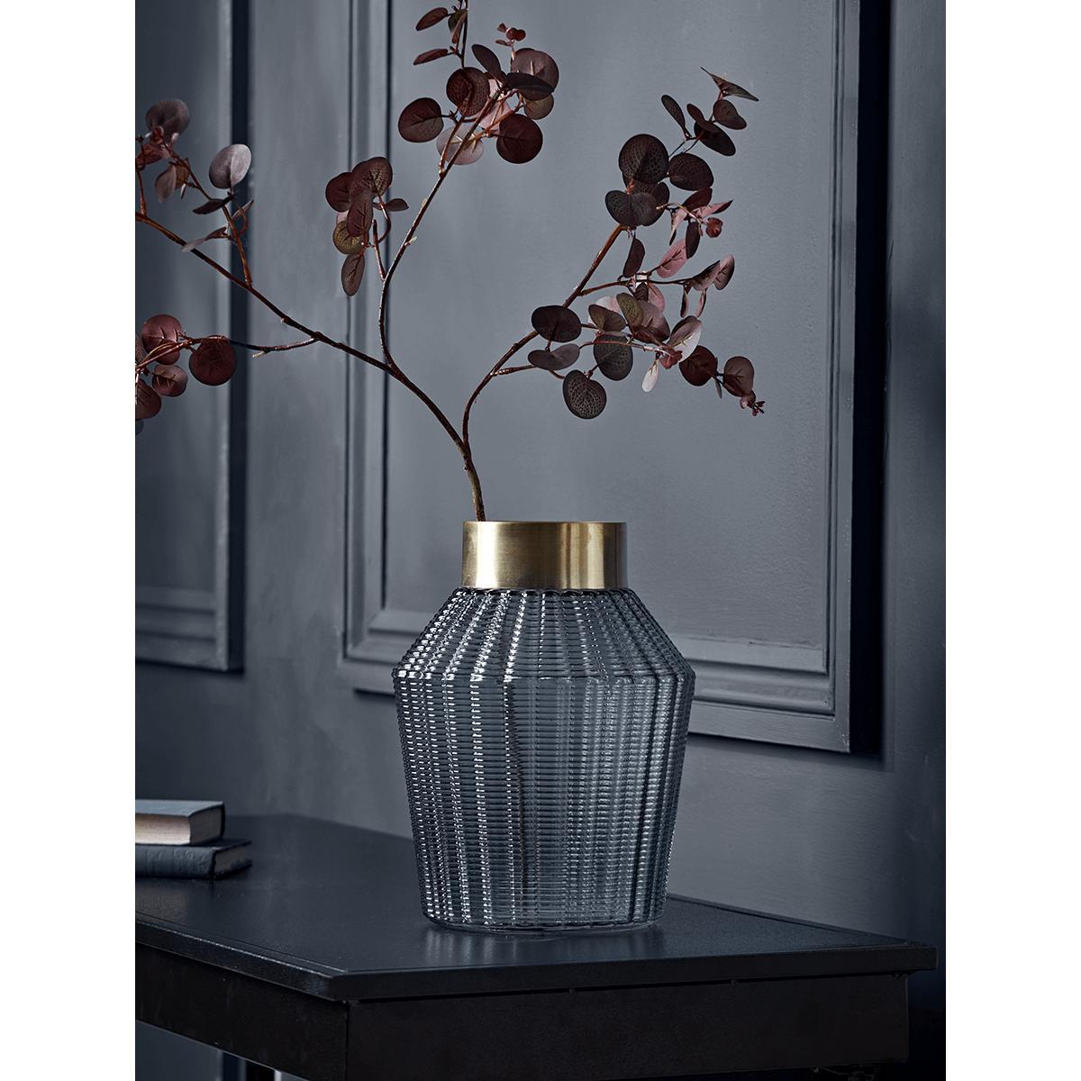 The ribbed geometry of our blue-toned glass vase, coupled with its handsome brushed gold rim, is perfectly in tune with Deco style. We love how decorative additions like this can instantly dial up the mood. Position to any surface with an expressive. Faux frond. To make an impact.