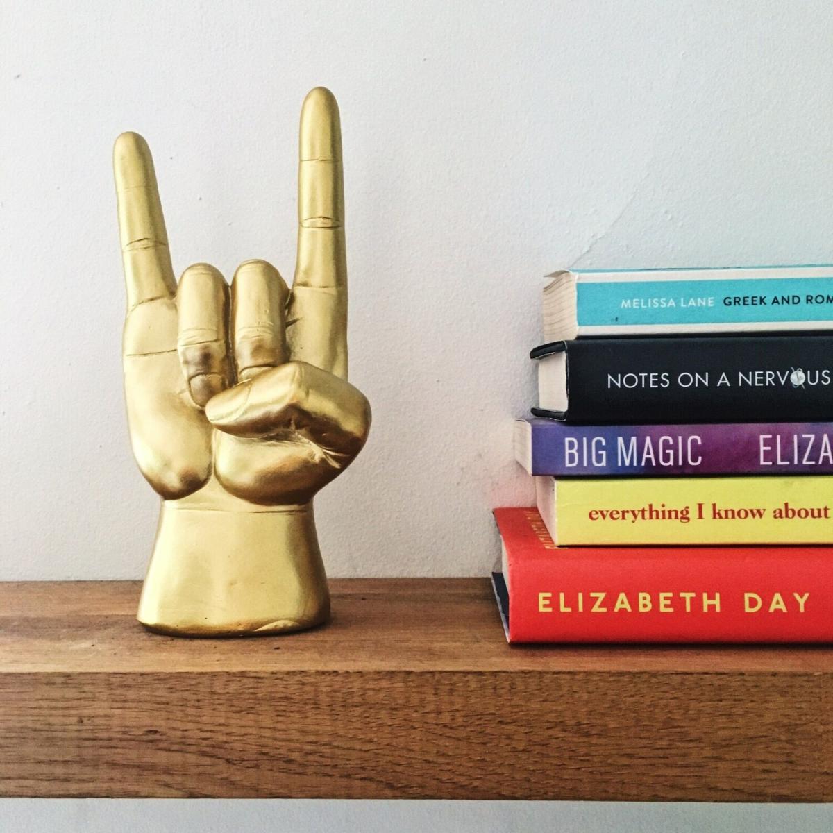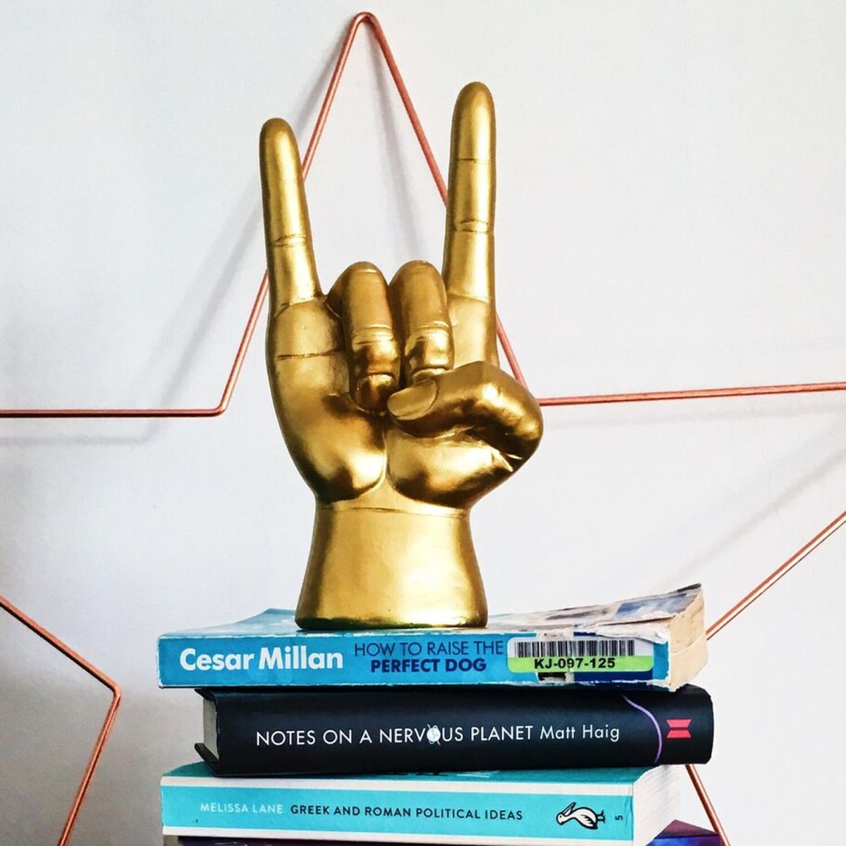 Gold Rock Hand Ornament, hand gesture ornament. Gold Coloured and ready to rock! Can also be used as a key, jewellery or headphones holder. Made from coated resin.