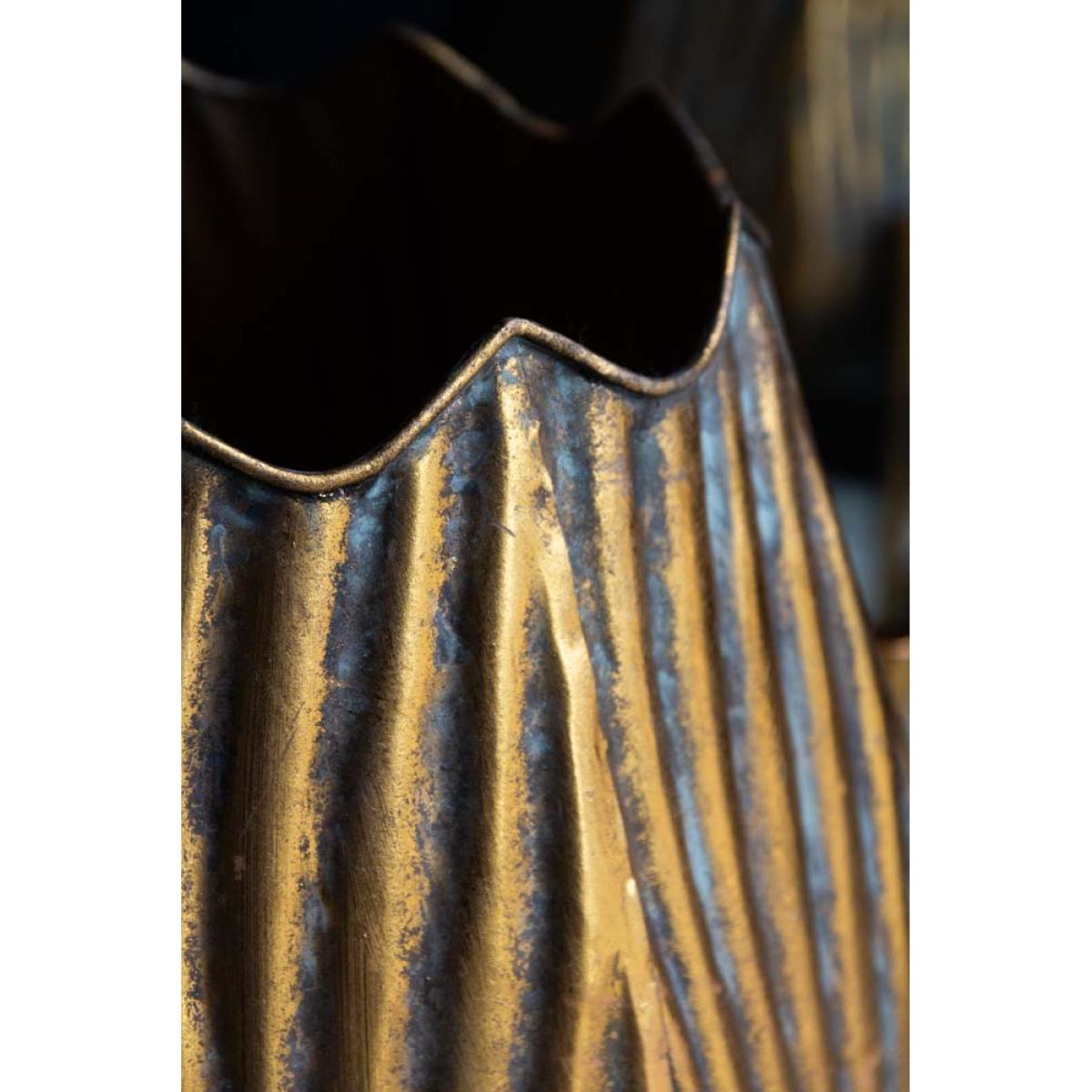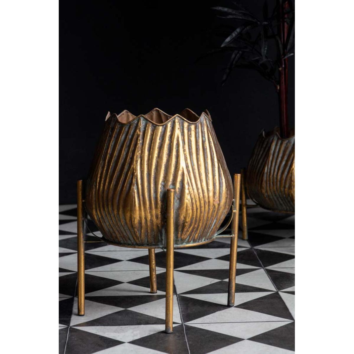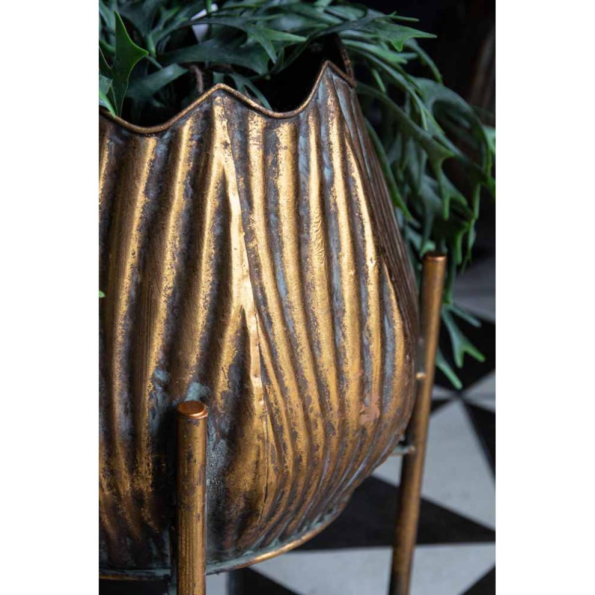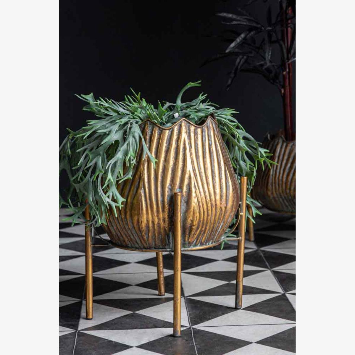 About The Gold Scallop Planter On Stand A true statement piece, the Gold Scallop Planter On Stand will elevate the look of your plants with show-stopping style. Featuring a tall planter with a narrow top and four legs, in an intricate scallop effect design that exudes beautiful textural grooved detailing. To top it off, this large planter offers a luxurious gold colour in a rustic aged finish, giving an oh-so-charming look that’ll pair so delightfully with the rich green colour of foliage. This statement planter is elevated from the ground making it the perfect piece for creating eye-catching displays. To prevent damaging the interiors, we suggest using faux plants for these gorgeous planters. Why We Think You’ll Love The Gold Rustic Planter On Stand We love the aged finish of this gold planter, the intricate scallop design offers hints of imperfections that make it all the more unique. What’s more, this elevated plant pot encourages you to explore various heights and shapes within your interior, which will only make your home look even more interesting. This plant stand is fabulously big and beautiful, we can’t wait to get out hands on it! How To Style The Tall Planter On Stand Indoor planters instantly create the ultimate style spot. Display this raised planter in your dining or living room, to break up different zones with a statement piece. Pairing it with the gorgeous Wide Gold Scallop Planter On Stand will enable you to play around with height, scale and texture bringing marvellous variation to your space, so what’s not to love?!