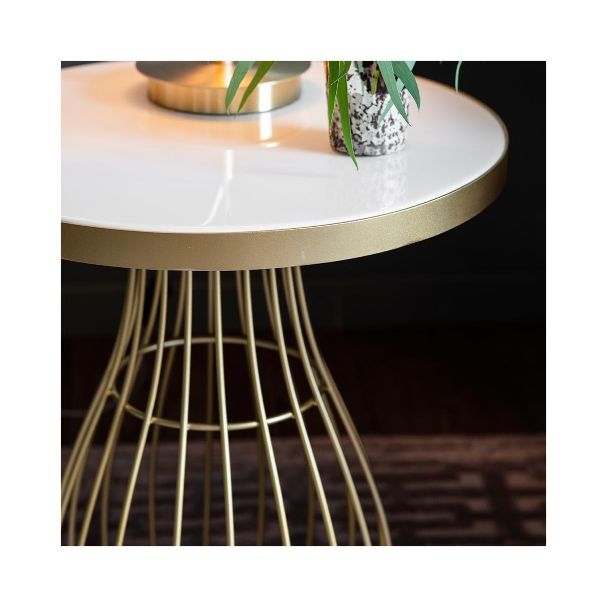 Dimensions W50 x H55 x D50 cm. The Southgate Side Table in Champagne combines elegance and sophistication in one useful piece of furniture. Features. Shiny glass top. Polished gold base Contemporary elegant design Assembly not required..