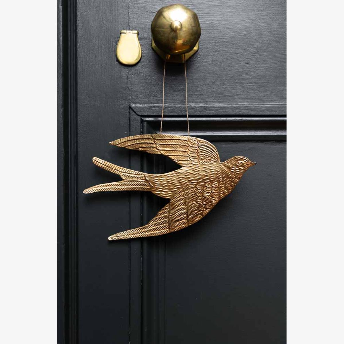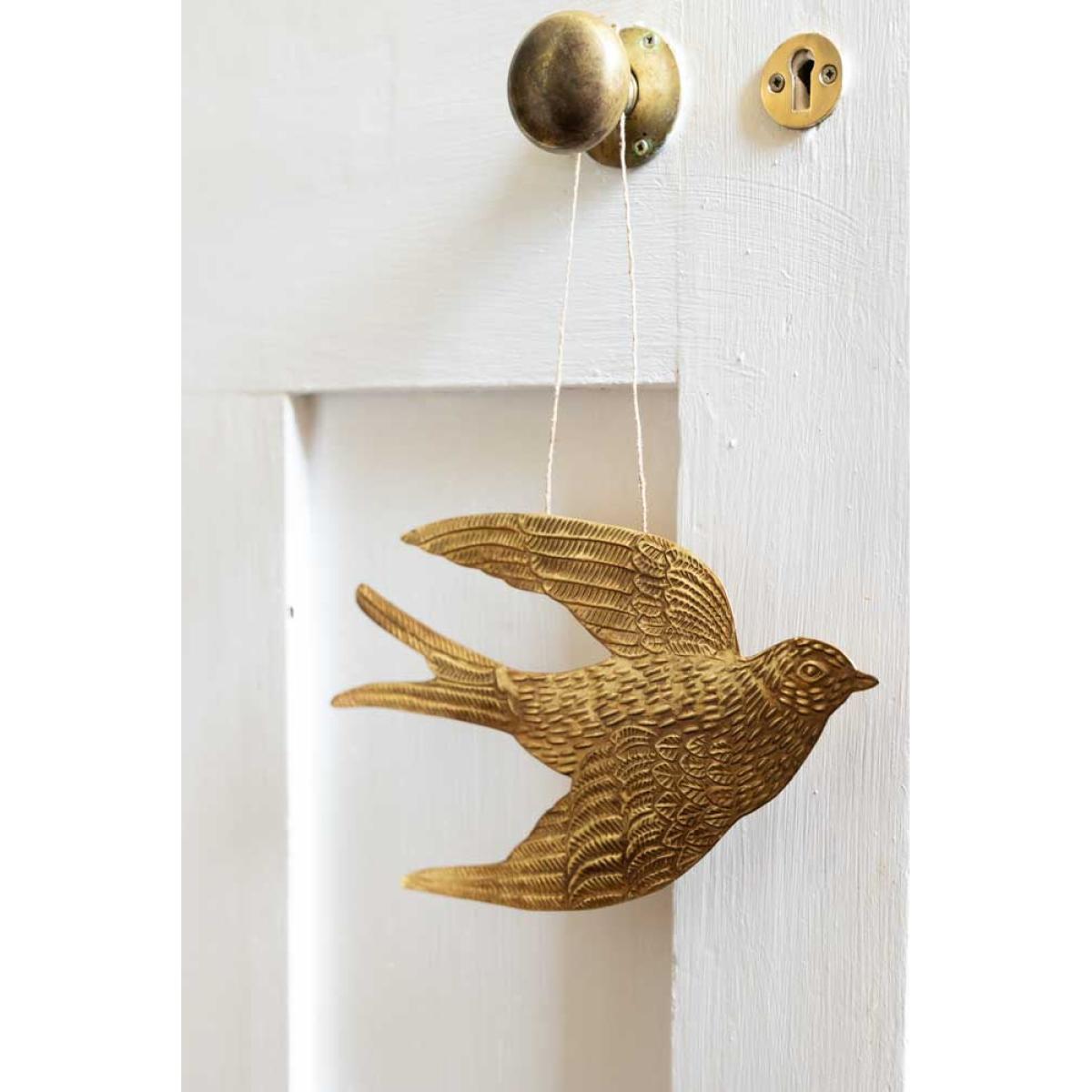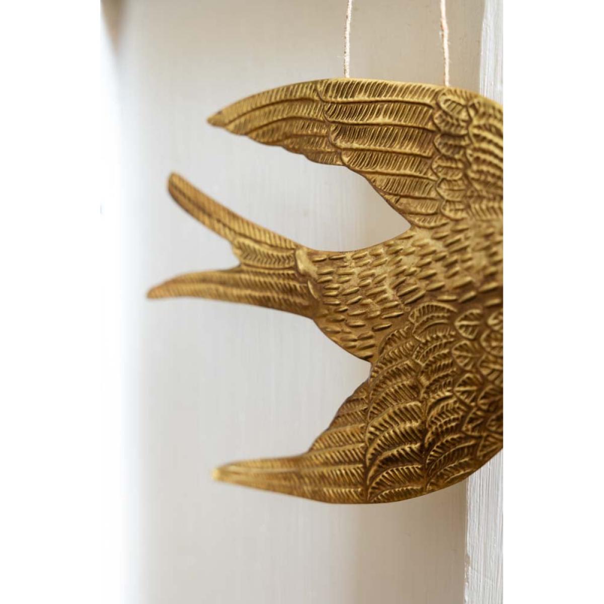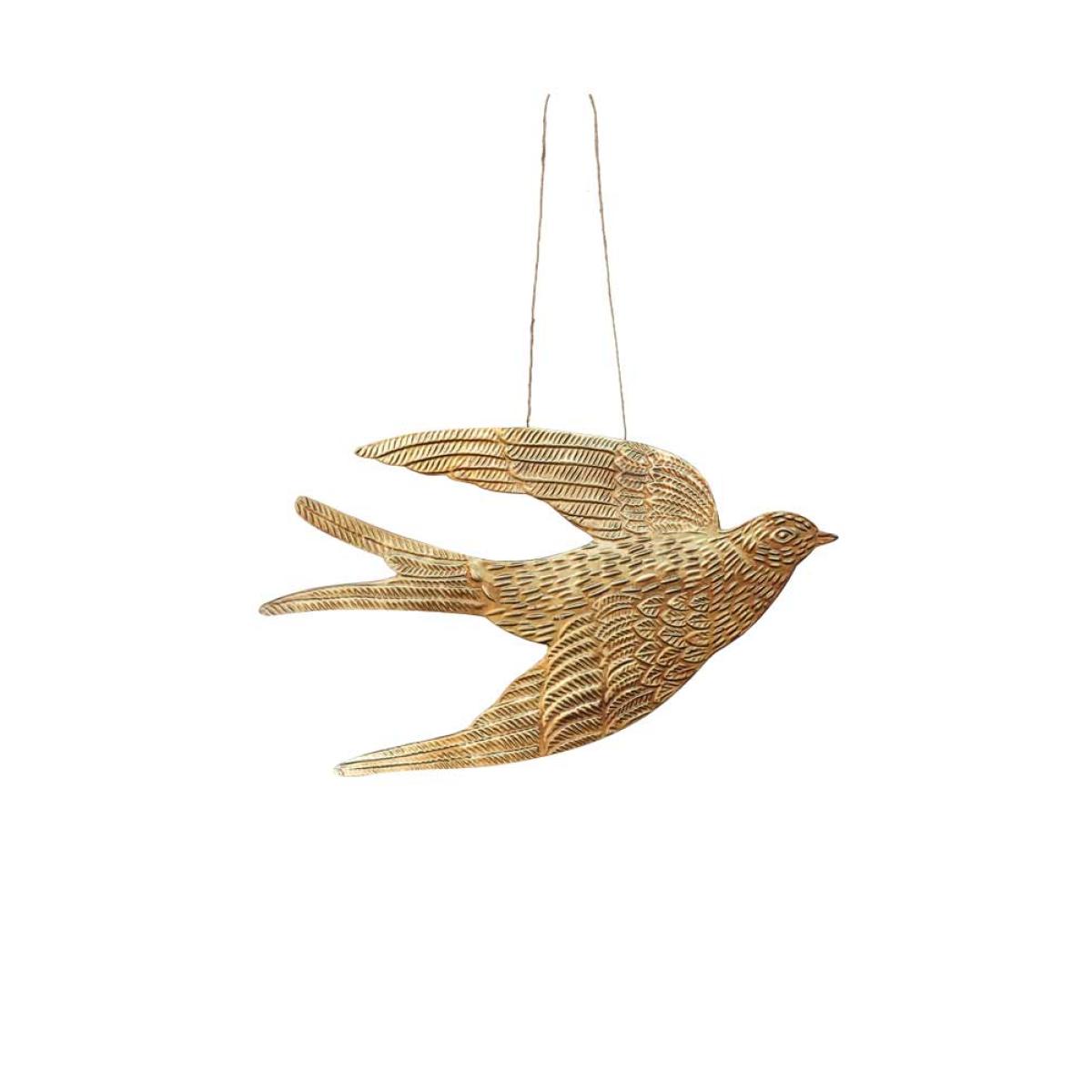 The Gold Swallow Hanging Ornament is a unique and glamorous treasure for your home that brings joy to any style spot, from shelves to the fireplace. As a symbol of freedom across cultures, birds are the perfect motif to introduce to your interior. However, the swallow is extra special. Often associated with the end of winter, swallows' arrival after migration coincides with the start of spring in April and May. As a result, swallows have long been considered a symbol of good luck and positive change. Handmade in India, this glamorous gold ornament captures the signature silhouette of a swallow and includes beautiful attention, from dashes that recreate feathers to the subtle curves of the wings. We are always looking for affordable and quirky treasures that set your home apart, and this is one of our favourite finds yet. A fabulous size for styling on your shelves, the swallow wall decoration also looks amazing hung from door handles and furniture or introduced to your gallery wall to spark everyday moments of magic.- Gold metal swallow hanging decoration - Measures: H16cm x W27.5cm - Handmade in India - Please take care when handling and unpacking, as the edges can be sharp