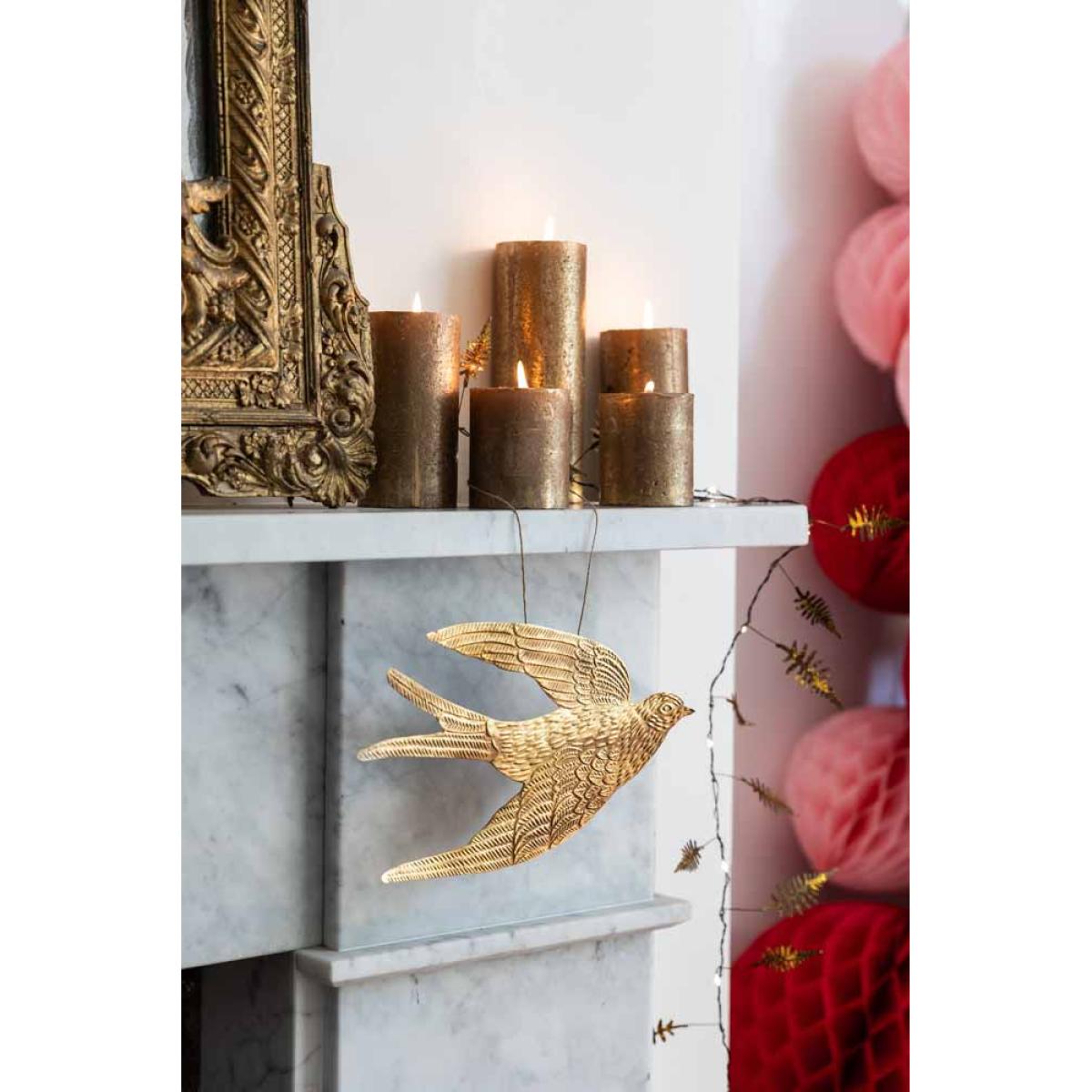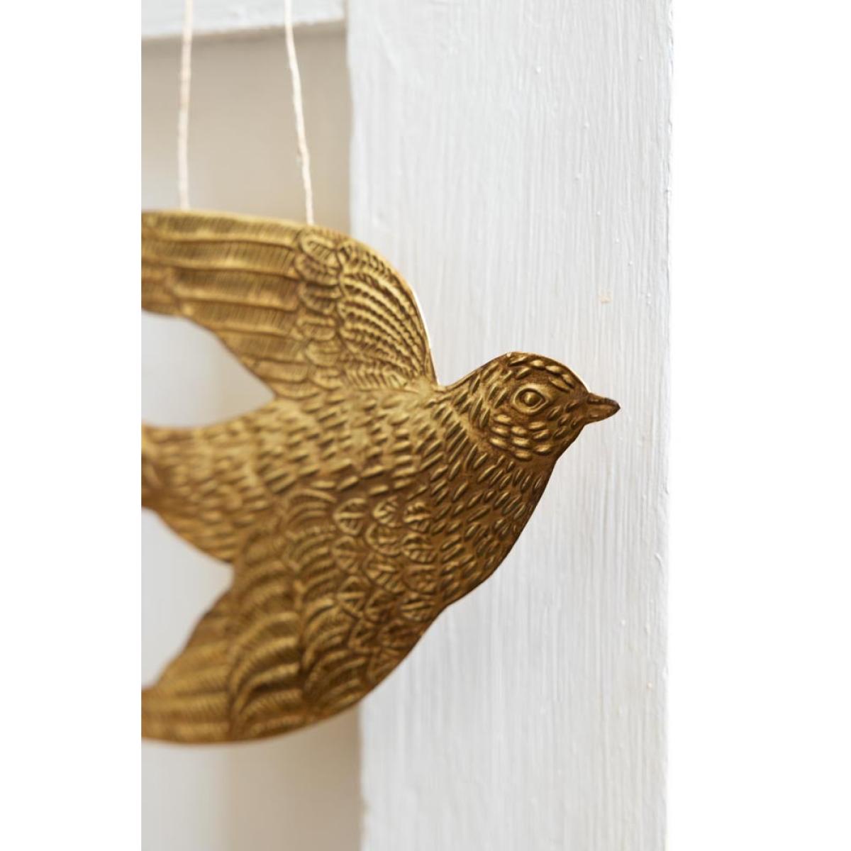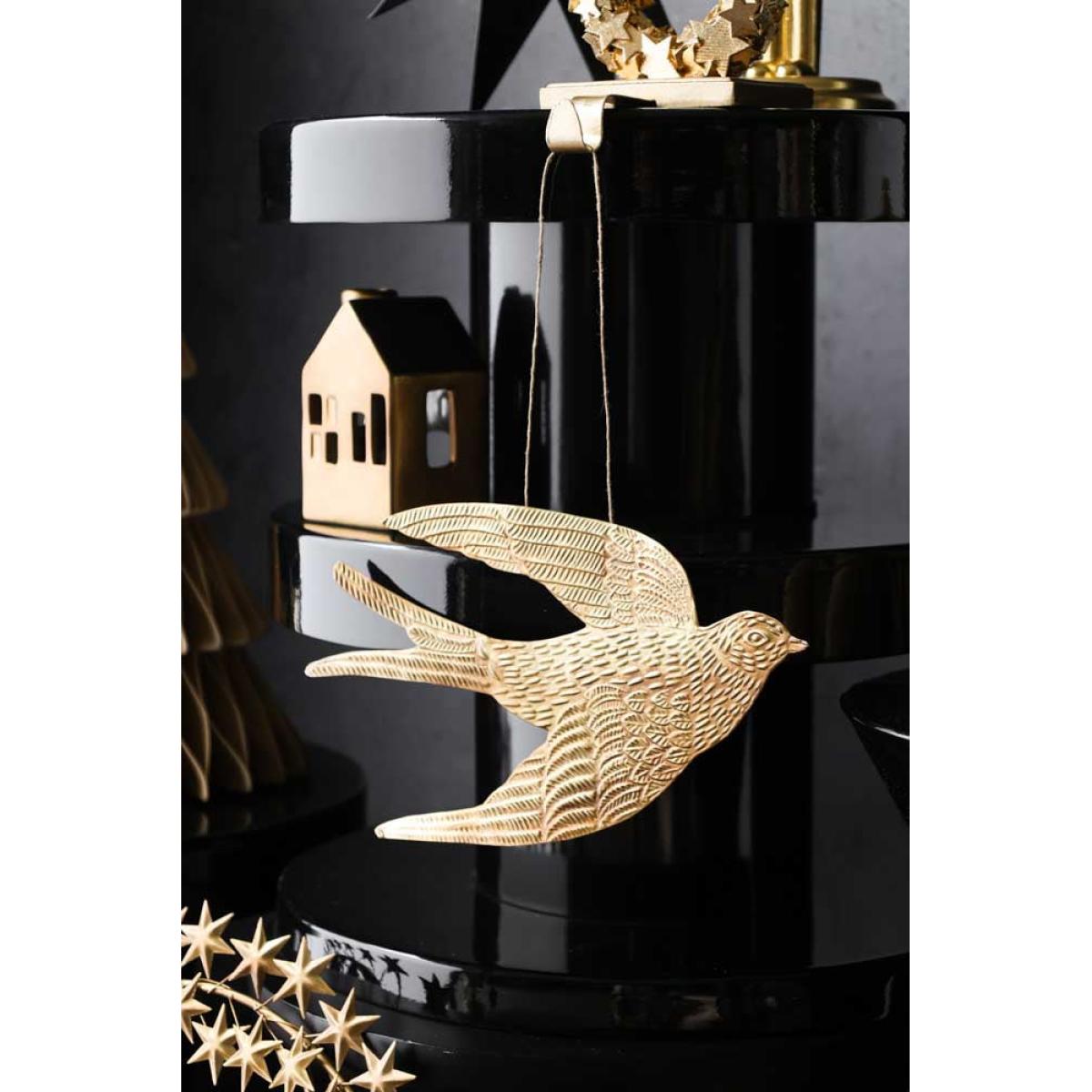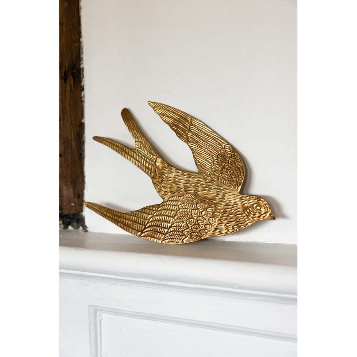 The Gold Swallow Hanging Ornament is a unique and glamorous treasure for your home that brings joy to any style spot, from shelves to the fireplace. As a symbol of freedom across cultures, birds are the perfect motif to introduce to your interior. However, the swallow is extra special. Often associated with the end of winter, swallows' arrival after migration coincides with the start of spring in April and May. As a result, swallows have long been considered a symbol of good luck and positive change. Handmade in India, this glamorous gold ornament captures the signature silhouette of a swallow and includes beautiful attention, from dashes that recreate feathers to the subtle curves of the wings. We are always looking for affordable and quirky treasures that set your home apart, and this is one of our favourite finds yet. A fabulous size for styling on your shelves, the swallow wall decoration also looks amazing hung from door handles and furniture or introduced to your gallery wall to spark everyday moments of magic.- Gold metal swallow hanging decoration - Measures: H16cm x W27.5cm - Handmade in India - Please take care when handling and unpacking, as the edges can be sharp