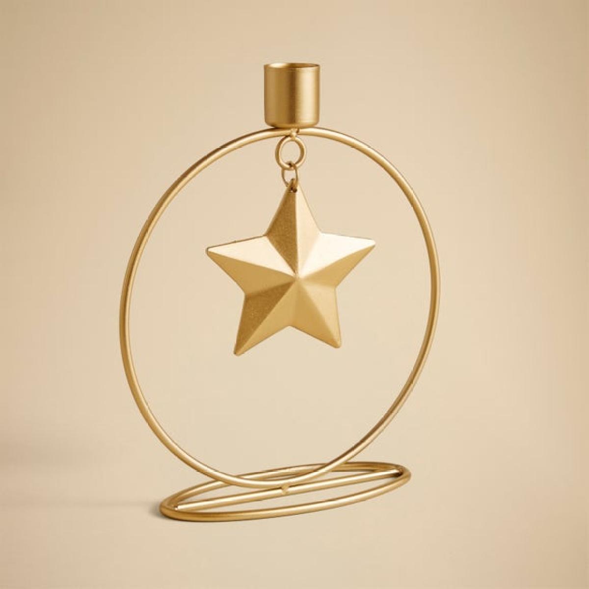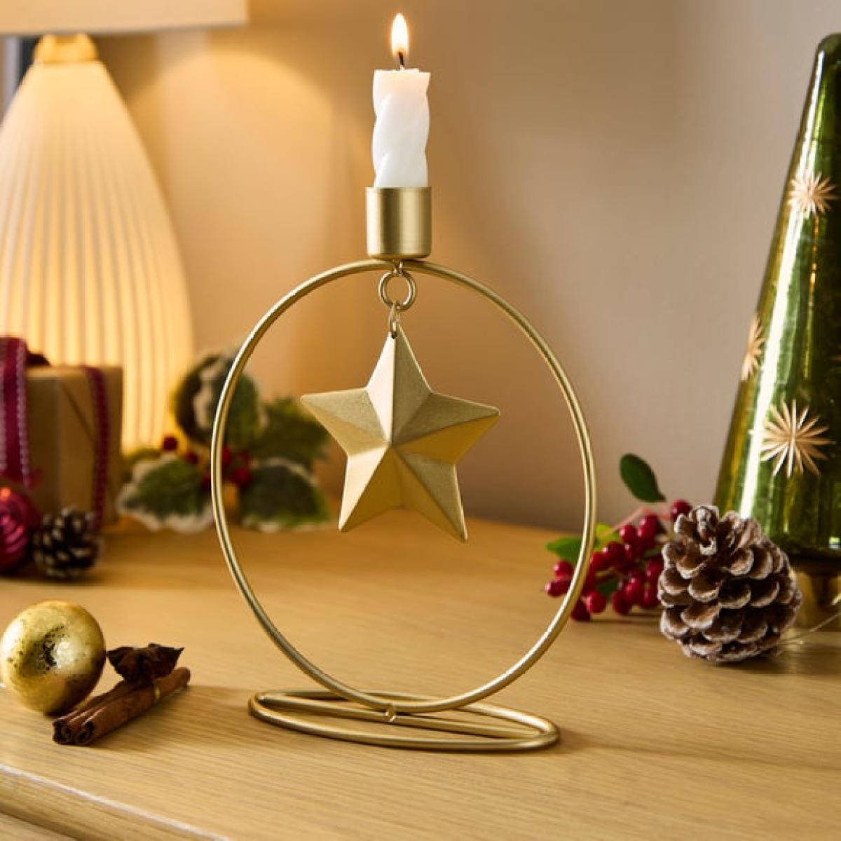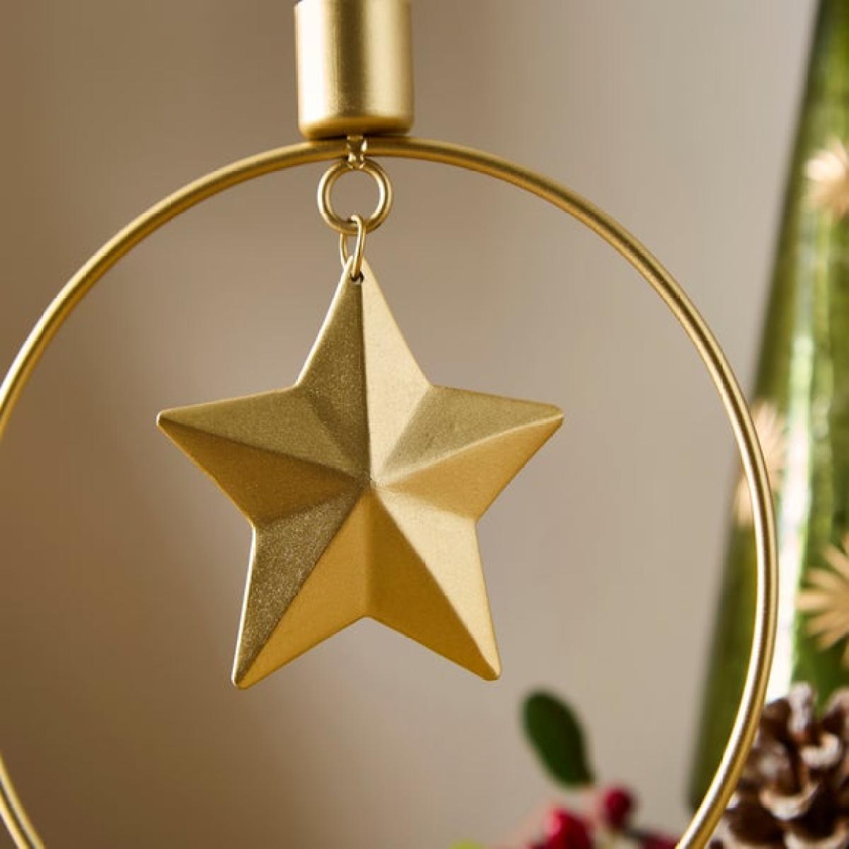 * Perfect for the festive season * Suitable for tapered candles * Easy to wipe clean Add a golden glow to your table with this elegant taper candle holder, finished in a rich powder-coated gold. Designed with a delicate hanging star detail, it brings a festive touch with a modern twist. Crafted from recycled metal, it's a stylish and thoughtful choice for your home. Perfect for showcasing a single tapered candle (not included), it makes a charming centrepiece or accent on a shelf or mantel. The sleek shape and shimmering finish suits any decor, Transform any room from minimal to magical in not time at all. Simply wipe clean to keep it looking lovely year after year.