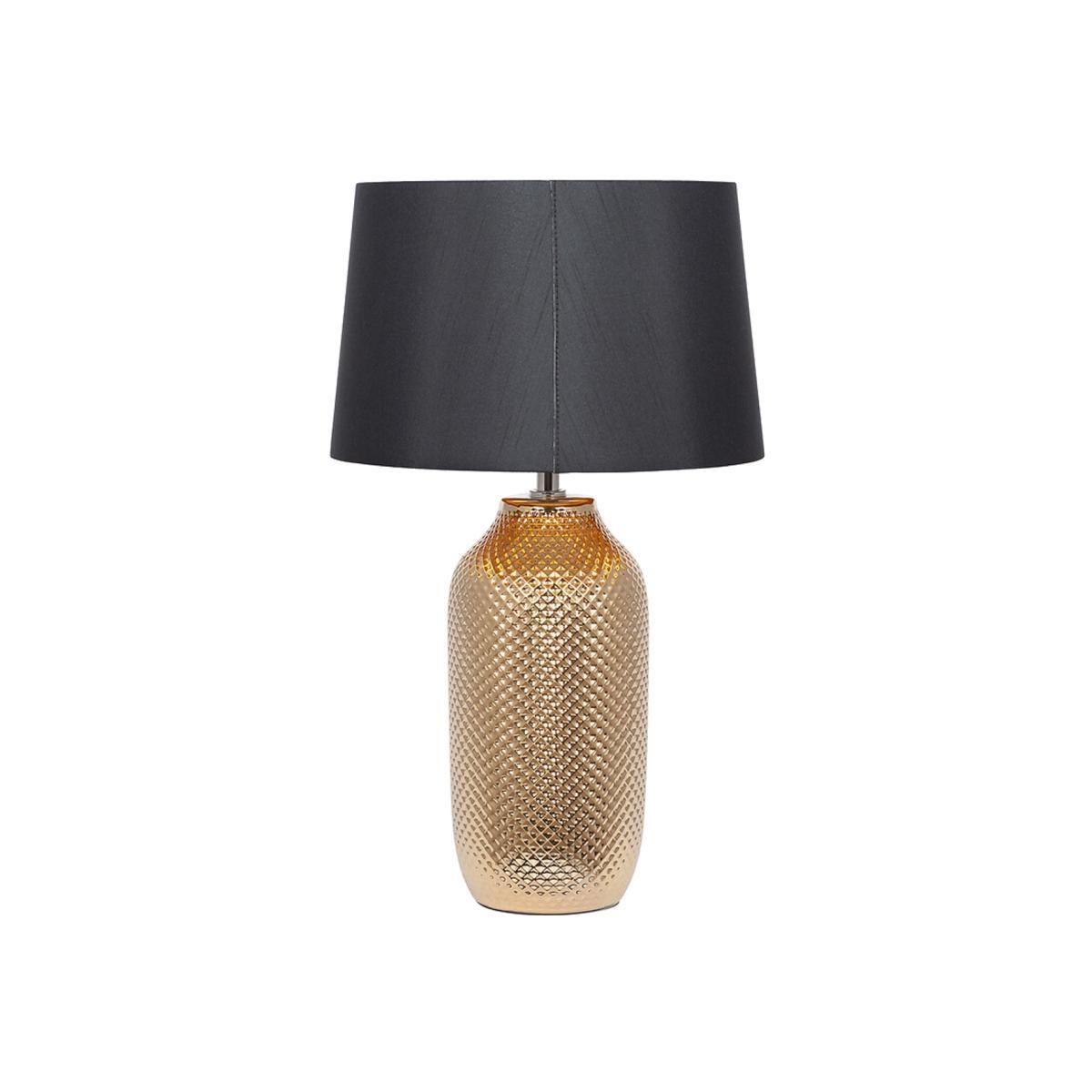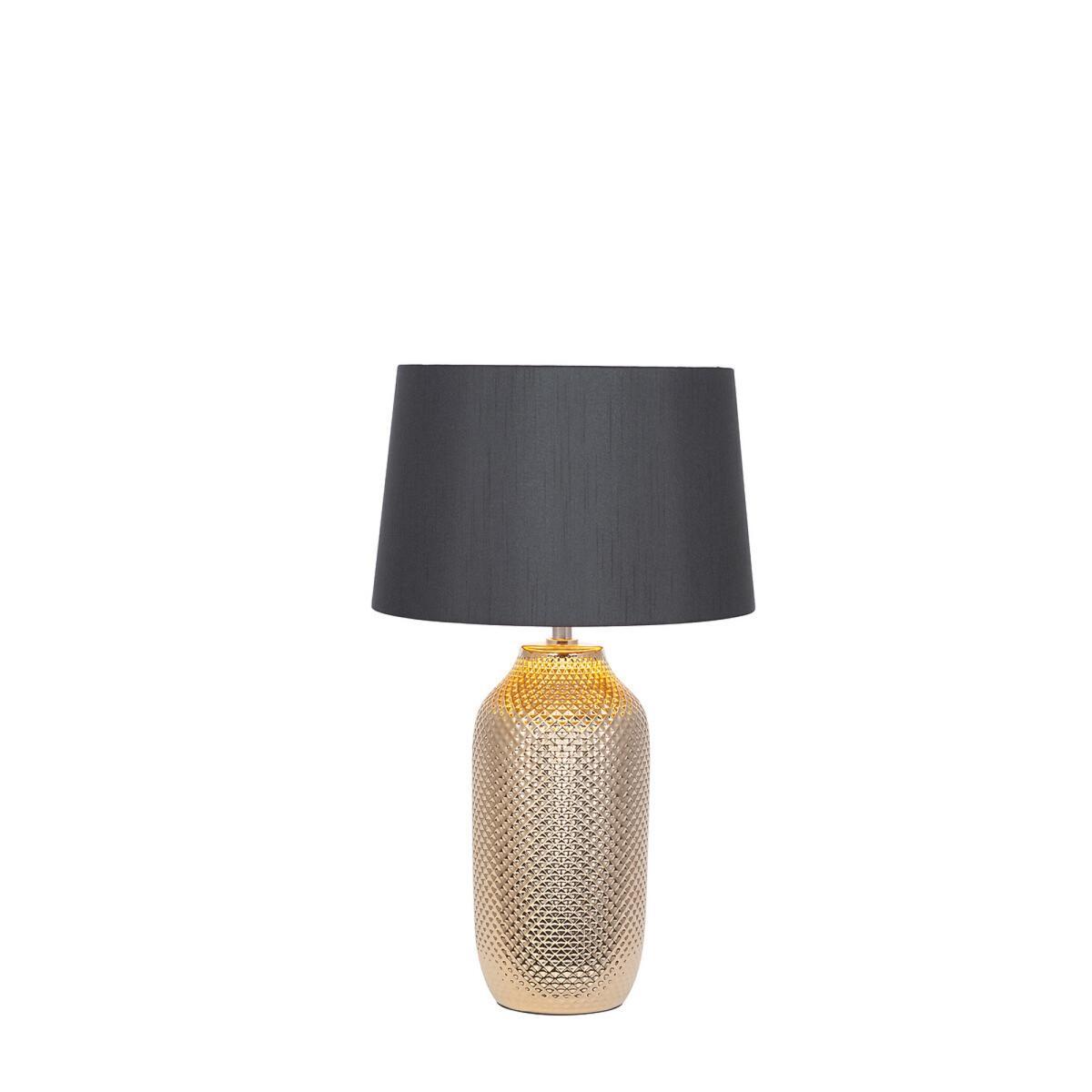 This all-over textured ceramic table lamp is finished in a striking gold effect giving it a contemporary look. The lamp also comes complete with a contrasting black tapered faux cotton shade lined with a matching gold card to reflect the light when lit. Bulb type required: ES/E27 GLS 60W. Product Dimensions: H 50 x W 30 x L 30 cm. This product will be dispatched by one of our trusted suppliers. You’ll be contacted by their selected courier about your delivery.