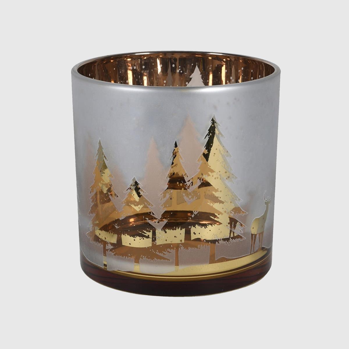 Elevate your ambiance with the alluring Gold Tree Glass Candle Holder. This exquisite candle holder showcases a serene woodland scene with a graceful deer. Crafted from frosted glass adorned with golden hues, it exudes a warm and inviting glow that envelops your space, creating a cosy and charming atmosphere.