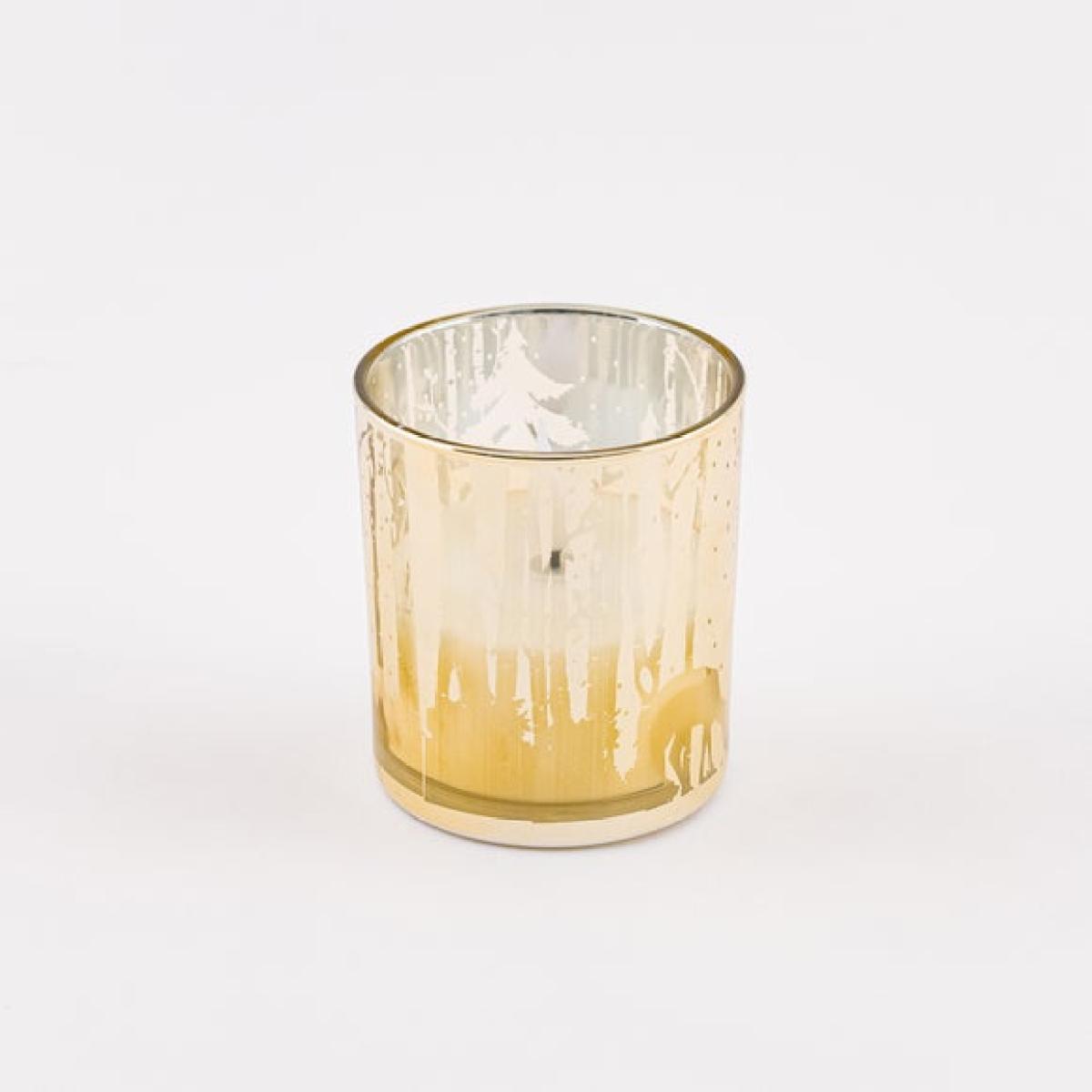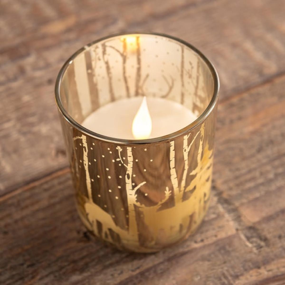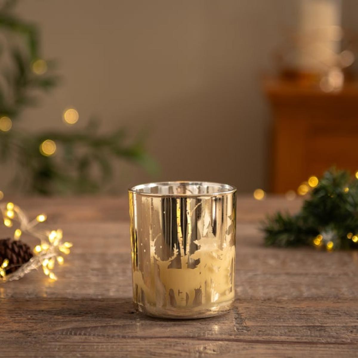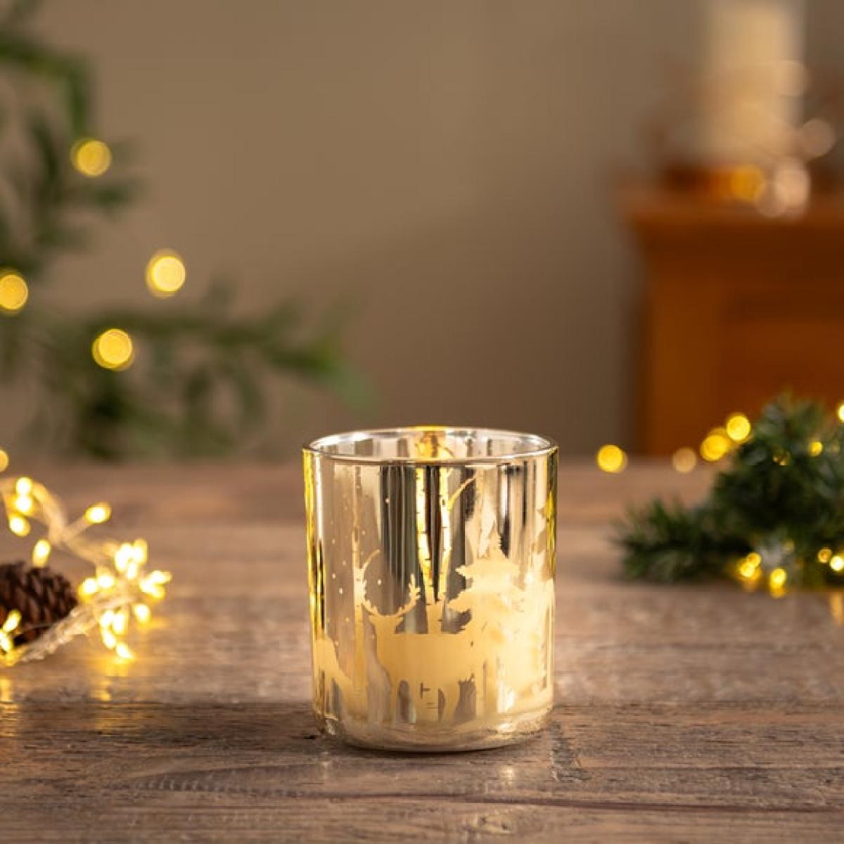 * LED candle * Unscented * Gold woodland scene * Made from real wax * Takes 2 x AA batteries (not included) Add a warm touch to your festive décor with this gold woodland LED candle. Made from real wax and housed in a gold glass vessel, it features a charming woodland scene that brings seasonal character to any space. The gentle glow creates a cosy, inviting atmosphere - without the fuss of flames or smoke. Ideal for homes with children or pets, and perfect for mantelpieces, shelves or table settings. Requires 2 x AA batteries (not included). A simple way to enjoy candlelight safely and stylishly.