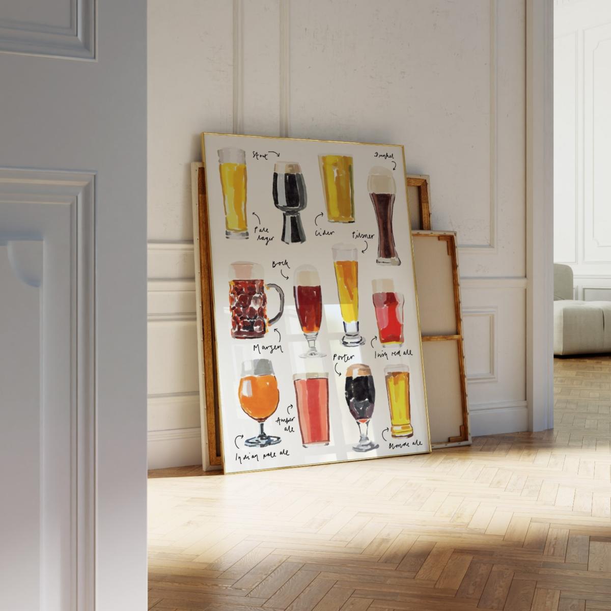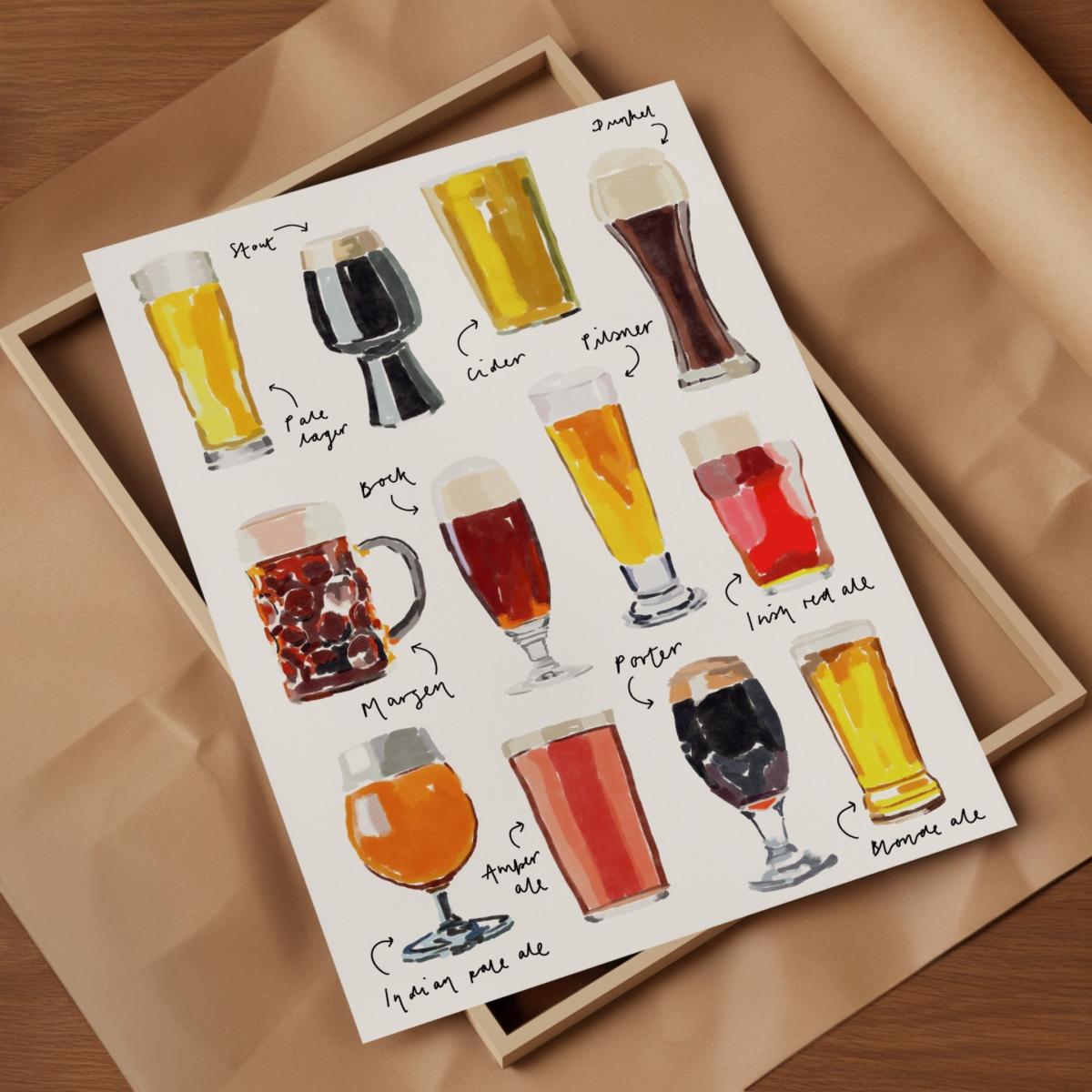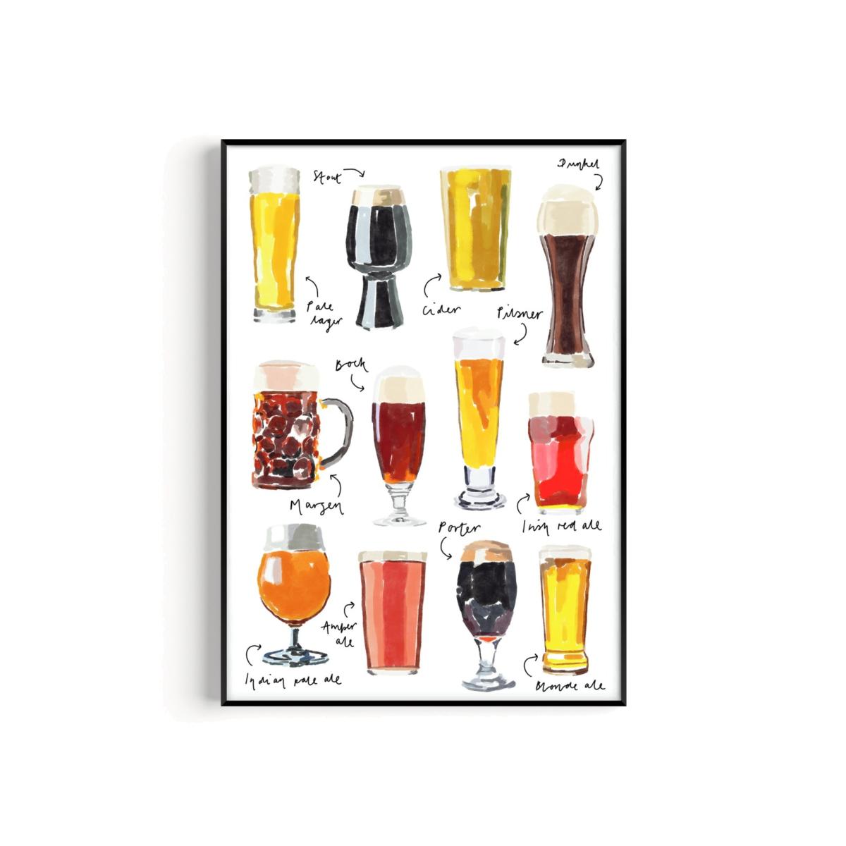 Beer Hand Painted Art Print - A2 Indulge with our hand painted "Beer" print. Designed to add a touch of style to your kitchen or man cave, this high-quality art print features a delicate design with all your favourite types of beer to make for a perfect gift. All prints are digitally designed by myself and printed to order. Smooth fine art 230 gsm matte card. Printed with vivid colour and detail. Sold without a frame.