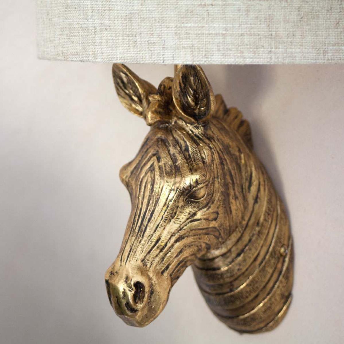 Add to your collection of quirky animal feature pieces with our Gold Zebra Wall Light With Shade. Sculpted with intricate detail, the animal embellishment will hang with pride in your hallway, dining room, or bedroom. The natural linen shade will complement varied colour palettes in your home. Explore more. Animal Lights.