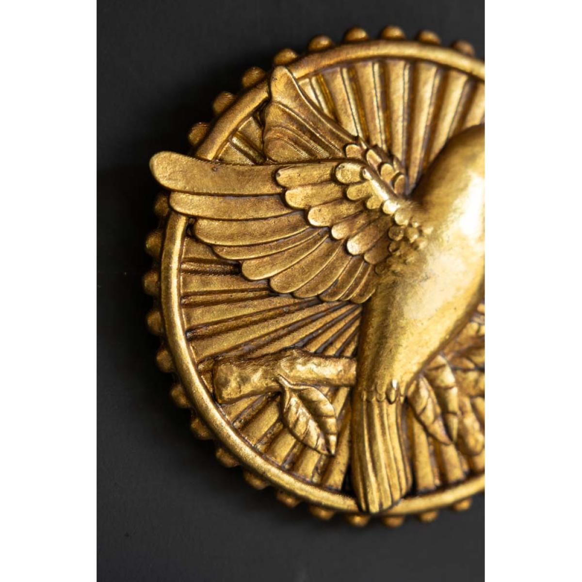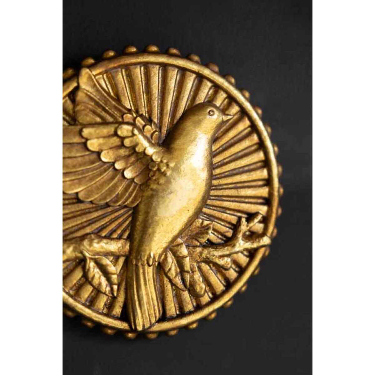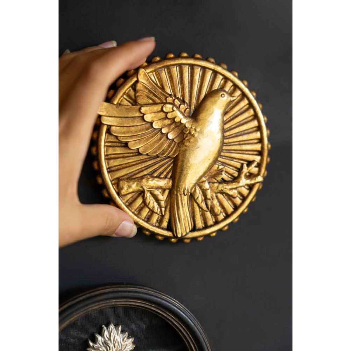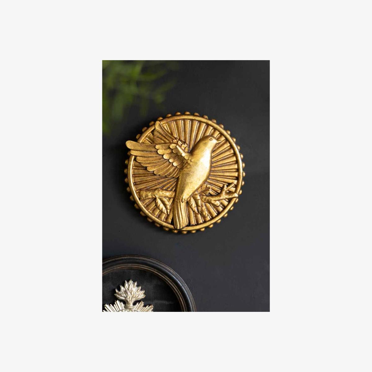 Small but striking, this 13cm Golden Flying Bird Wall Decor features a sunburst backdrop and antique gold finish. A beautiful symbol of freedom and hope for your gallery wall. Bring a sense of peace, beauty, and symbolism to your space with the Golden Flying Bird Wall Decor. Cast in resin and finished in radiant gold, this striking piece features a bird mid-flight, wings fully spread against a sunburst backdrop. Perched on a delicately detailed branch, the design evokes freedom, hope, and new beginnings, perfect for an uplifting touch to any wall. Compact in size but rich in character, this decorative disc makes a fabulous addition to gallery walls, alcoves, or even as a standalone accent. Whether styled among milagro hearts, vintage frames, or eclectic curios, this golden bird is sure to catch the eye and spark joy. Style Tip: Mix and match with other gold-toned wall accents for a bohemian, collected look. - Measures: Diameter 13cm - Material: Resin - Finish: Antiqued gold effect with sunburst detailing