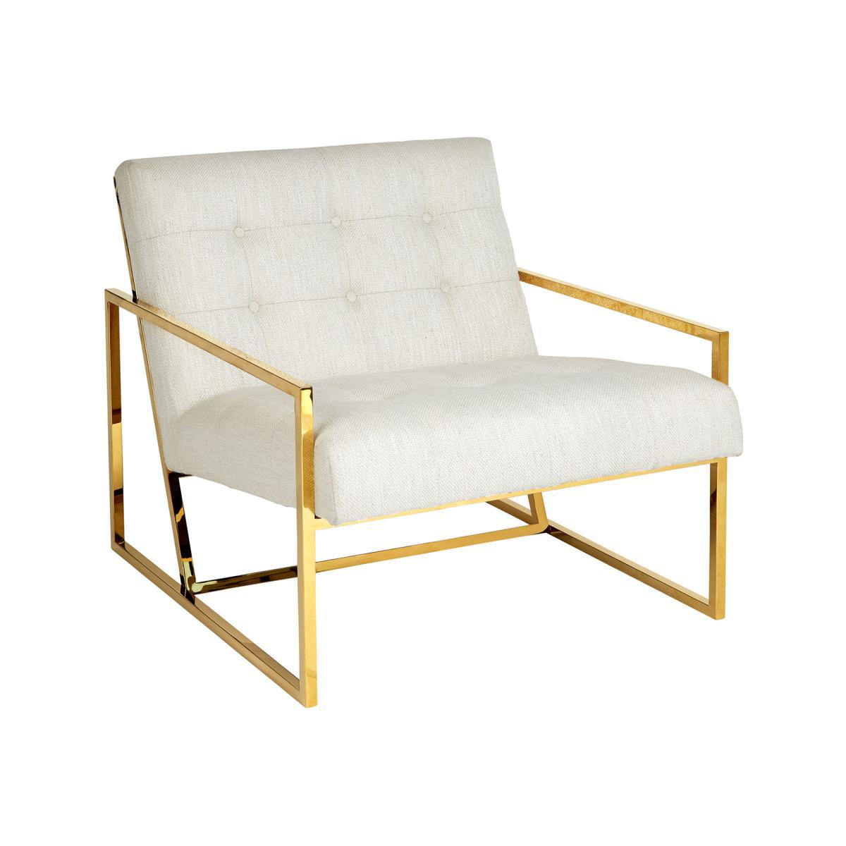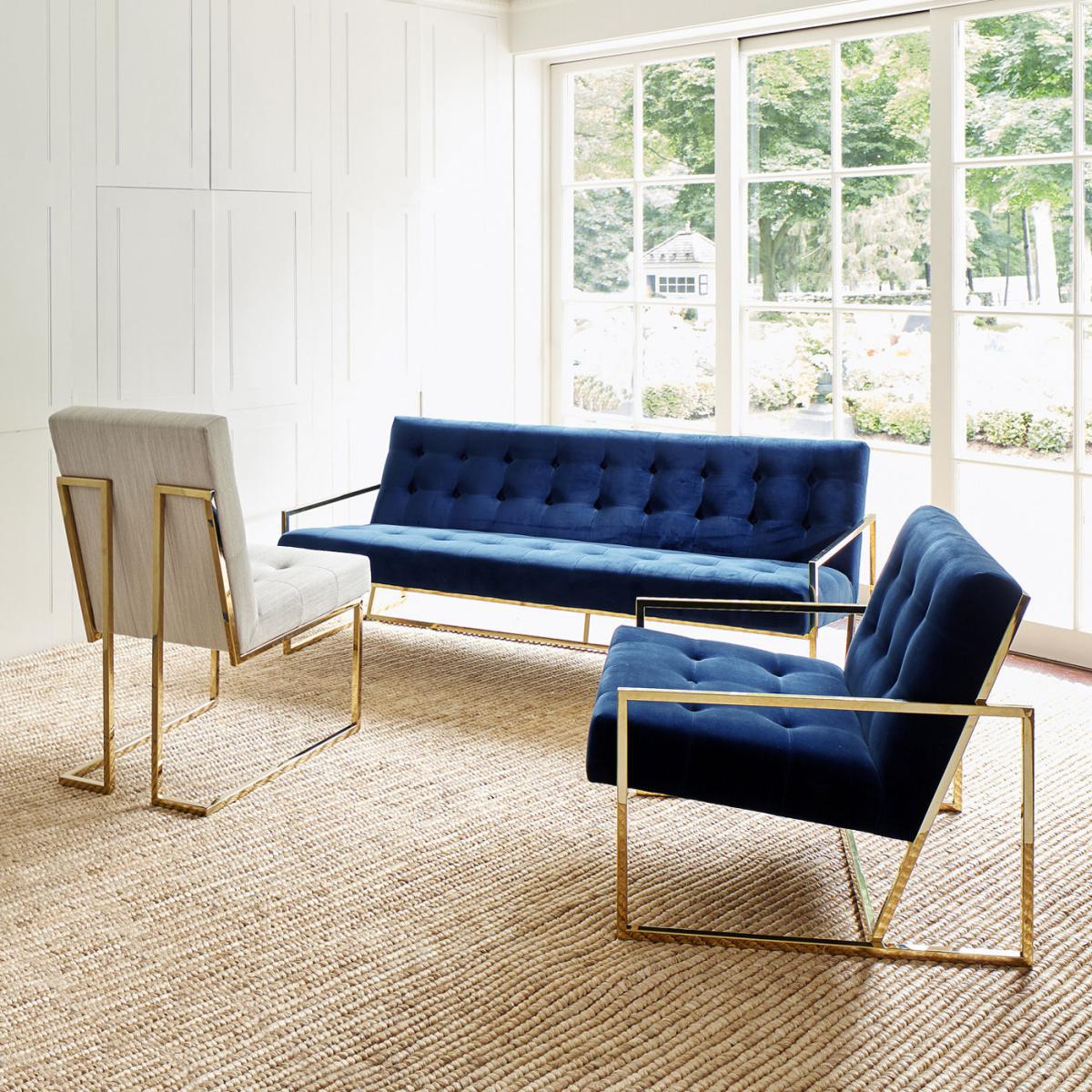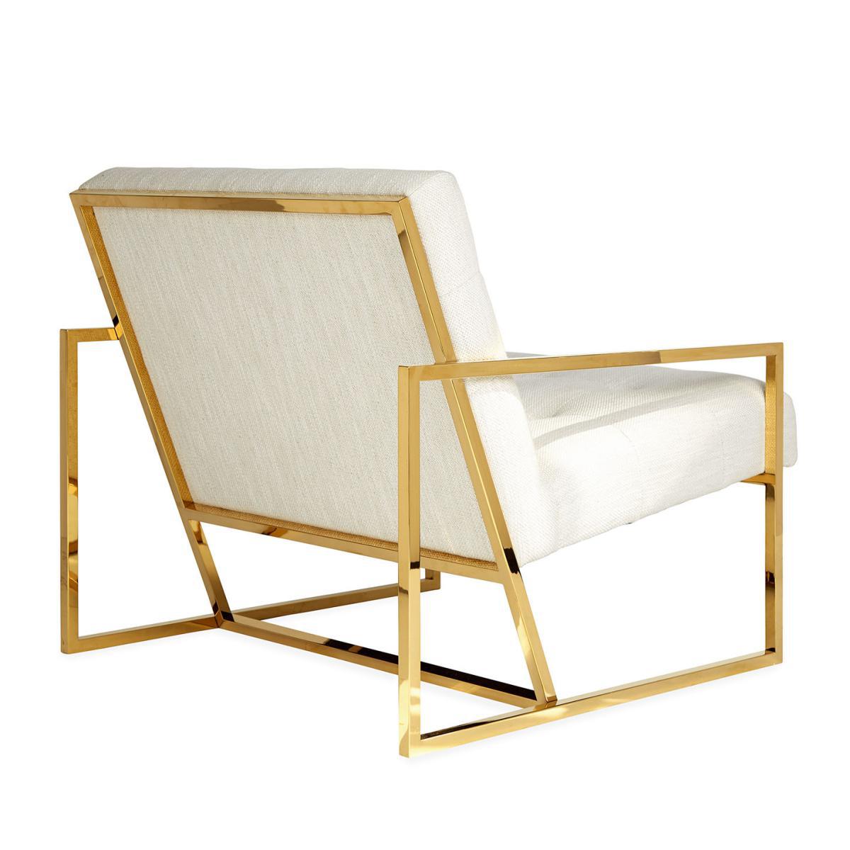 Fifties glamour! This modernist-inspired armchair is designed in a vintage and sophisticated style. It combines geometric rigour and great comfort. Crafted like a precious jewel, it has a fine, polished brass structure with minimalist, clean-cut lines. The structure forms a light and graceful frame around its cushions. Its reclined seat, large backrest and soft padding ensure optimum comfort. The clean lines spotlight the armchair’s high-quality materials and meticulous finishes. The padded seat is covered with a superb, linen-based fabric. A true chic classic, this armchair will cause a sensation!.