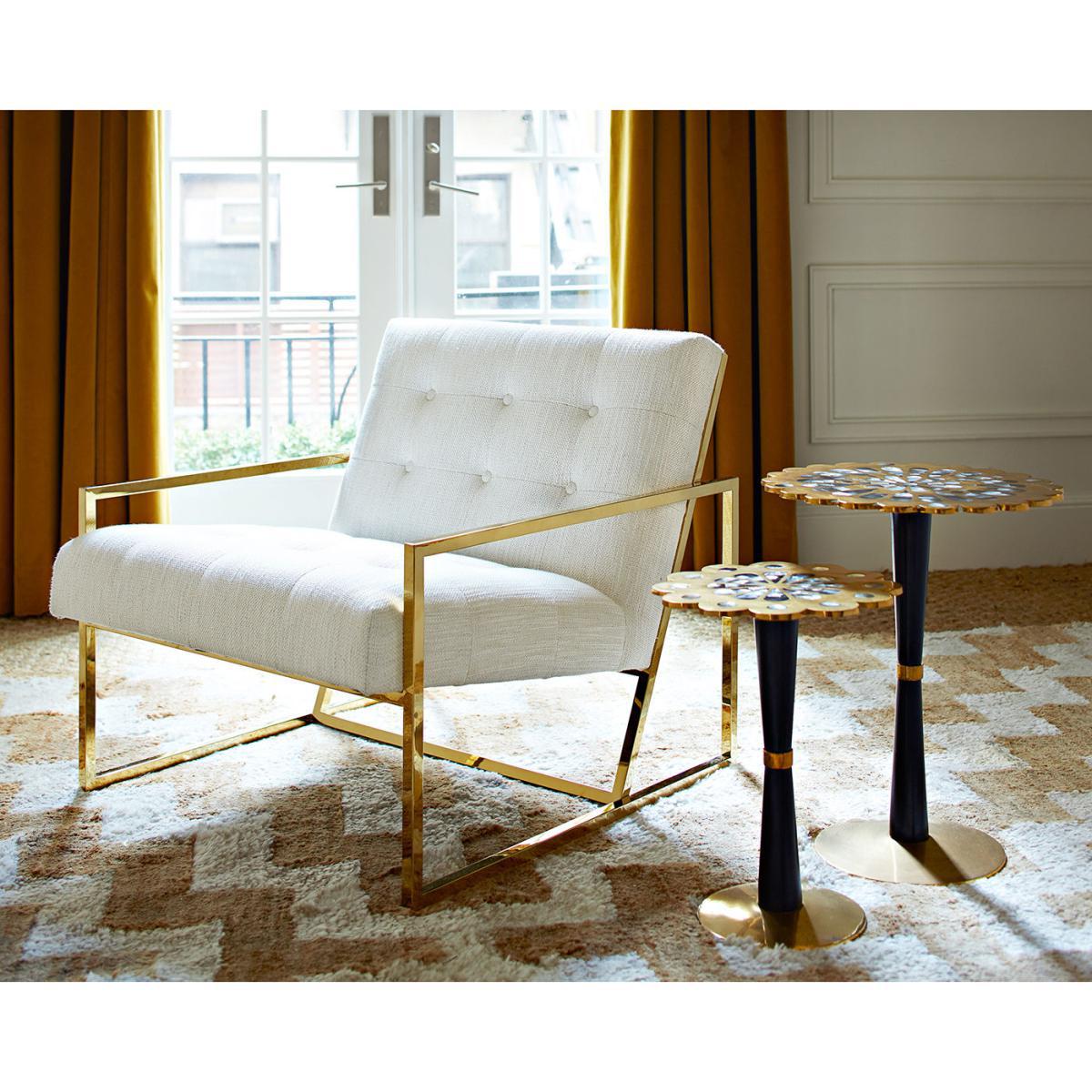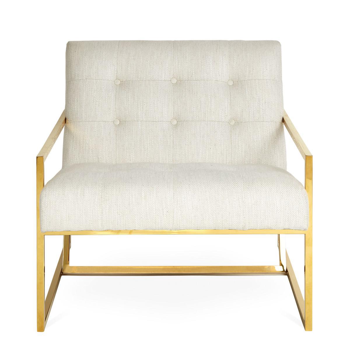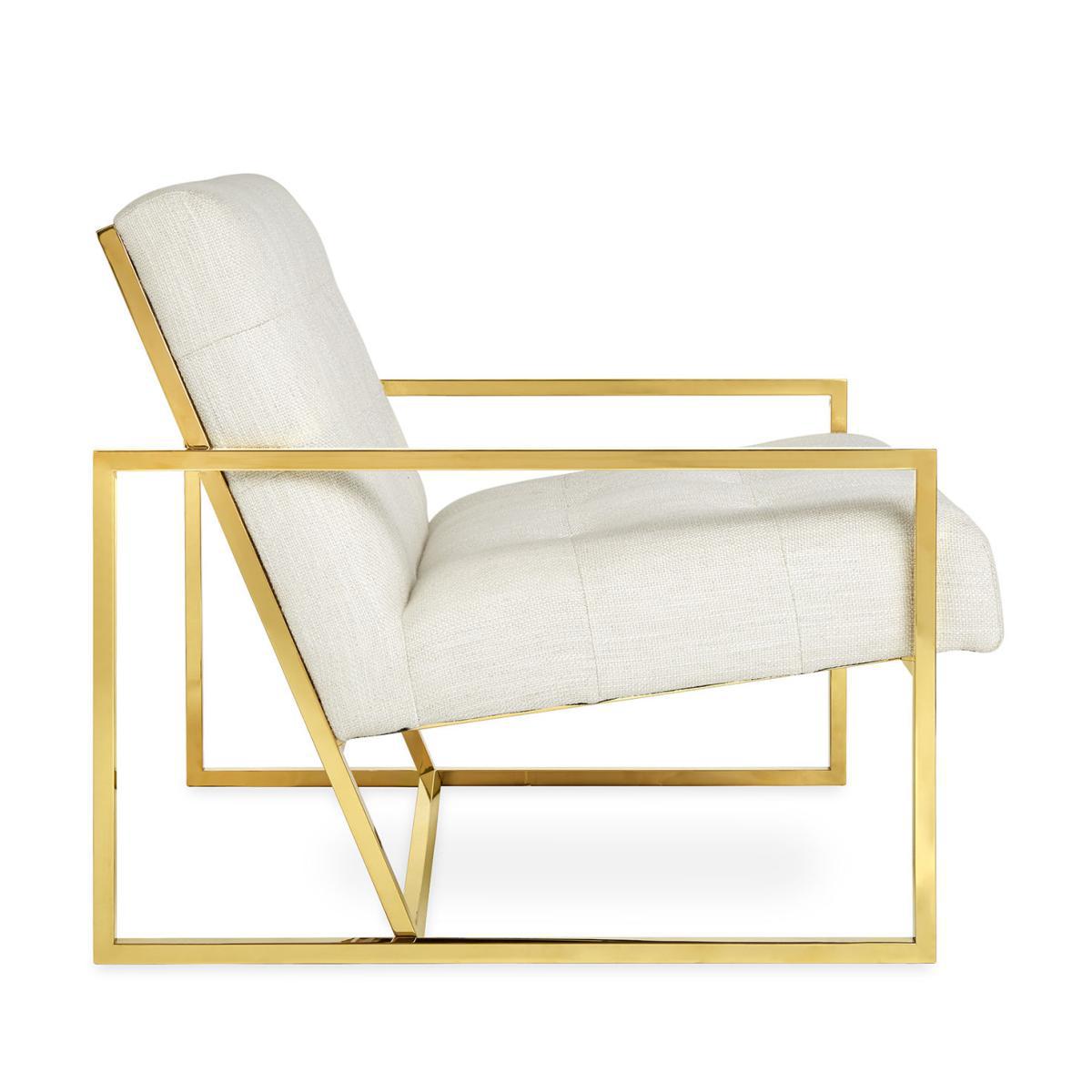 Fifties glamour! This modernist-inspired armchair is designed in a vintage and sophisticated style. It combines geometric rigour and great comfort. Crafted like a precious jewel, it has a fine, polished brass structure with minimalist, clean-cut lines. The structure forms a light and graceful frame around its cushions. Its reclined seat, large backrest and soft padding ensure optimum comfort. The clean lines spotlight the armchair’s high-quality materials and meticulous finishes. The padded seat is covered with a superb, linen-based fabric. A true chic classic, this armchair will cause a sensation!.