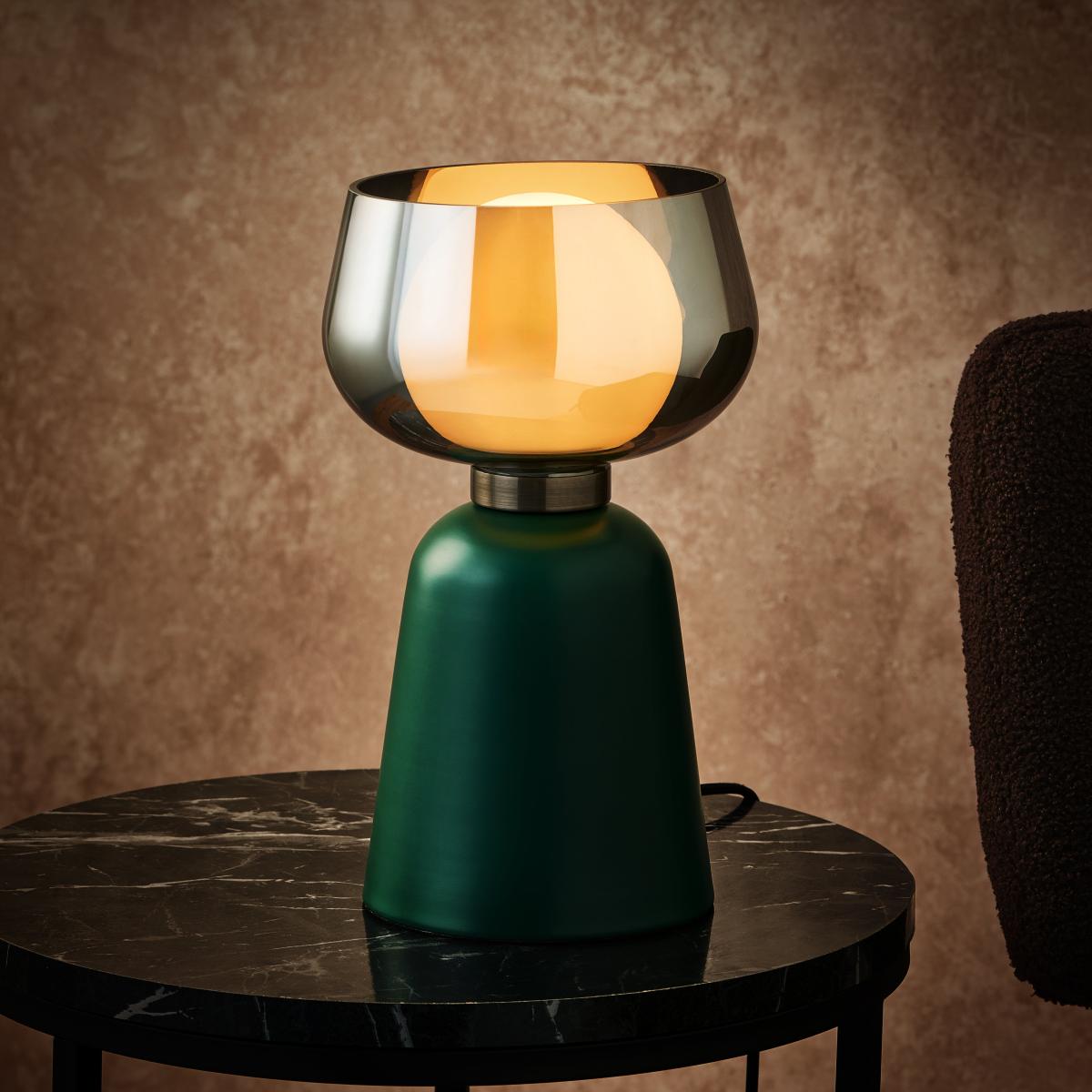 * Unique, Stylish Design * Made from Durable Materials * 3 Stage Touch Dimmable Feature * 1.8 Metre Black Cable * Requires: Golf Bulb & E14 Cap Type Add both stye and practicality to your home with the Gomez Touch Dimmable Table Lamp. Boasting an opal glass shade encased by a smokey glass outer and beautifully finished in emerald green and antique brass, this light offers a three-stage touch dimmable feature - perfect for creating customised ambience.