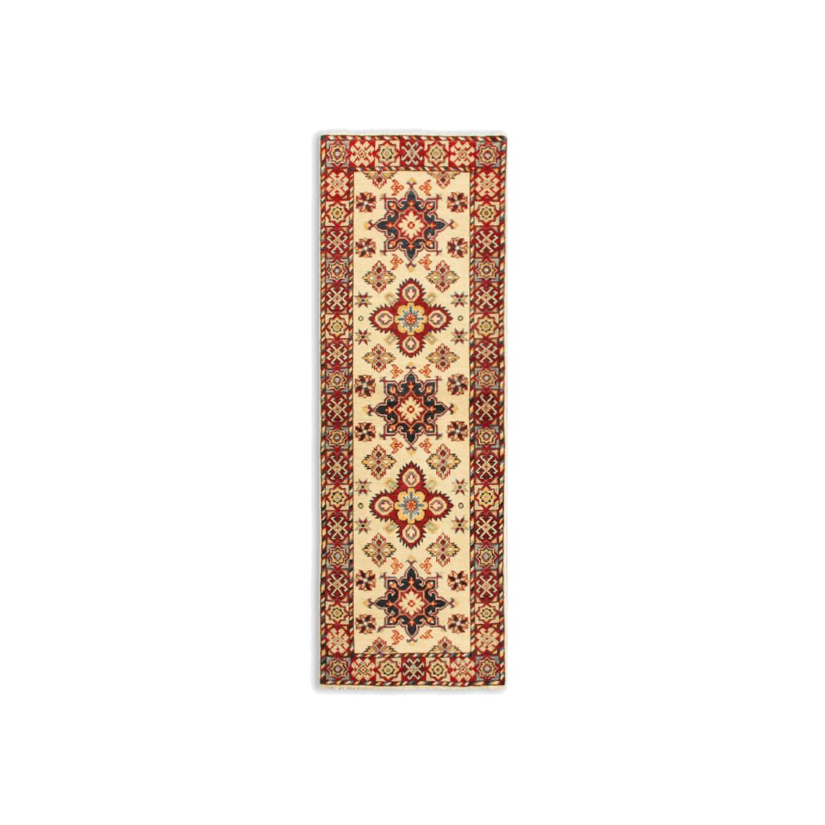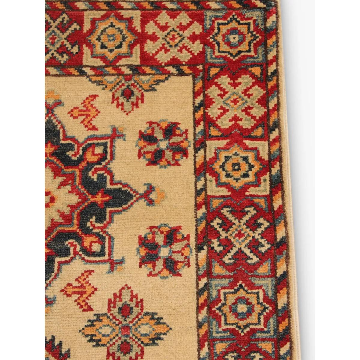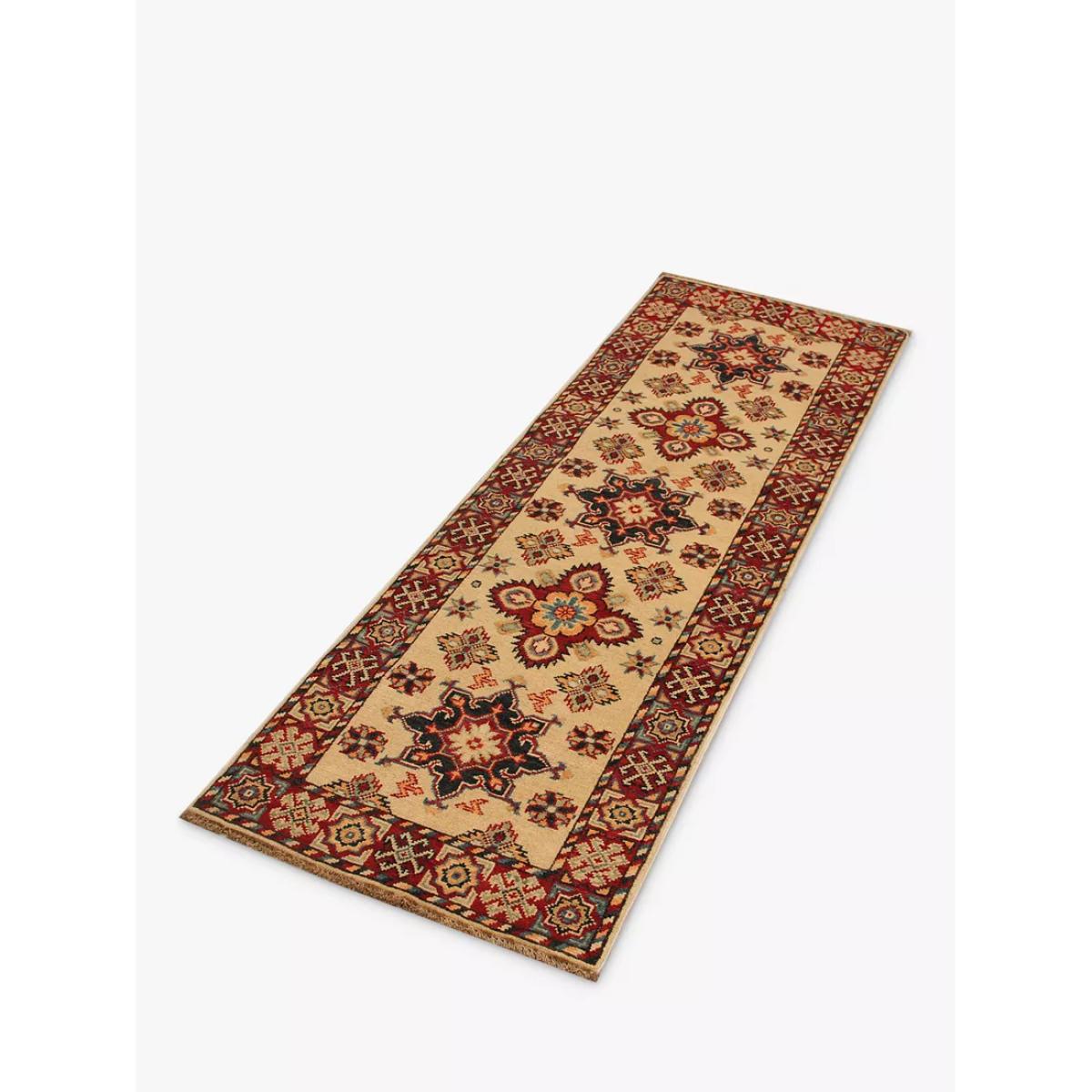 A selection of truly unique and totally individual traditional hand-knotted rugs, this range from Gooch Oriental showcases rugs created by different artisans across town and village locations across the world, including traditional Persian creations. Each piece is carefully selected by the Gooch Oriental team to ensure it's authenticity, quality and finish. Each one is knotted by hand, an intricate process using traditional hand knotting techniques. As such, no two pieces are the same, meaning you can add an authentic and unique piece of crafted design into your home, whilst supporting this heritage industry. The supreme Kazak design is mainly made by the Hazara Tribes of Afghanistan. The design and patterns of Kazak rugs are taken from old Caucasian rugs (Caucasian carpets are from the areas south, east and north of the mountain chain of the Caucasus, Russia). The wool yarns used are all hand spun and dyed using only natural dyes such as cochineal and indigo, which adds to their dramatic and vibrant appearance. Once dyed and hand knotted on a cotton warp base in Afghanistan the rugs are then transported over to Pakistan where they are expertly finished including washing and trimming. The method used to hand make a Kazak rug is called ChappatBaft or Flat woven. Kazak rug weavers are faithful in using traditional bold colour and design mainly with geometrical motifs including a mixture of diamond and circle shapes as well as representations of animals, people and nature. In 1sqm of a Supreme Kazak rug there would be around 160000 + knots giving a fine-density pile. The benefits of a wool rug Warm and durable, wool feels beautifully soft underfoot and is long-lasting Naturally flame-retardant and odour resistant Water repellent so easier to clean Naturally biodegradable, wool is part of the circular economy and contains no micro plastics About your new rug We recommend John Lewis & Partners Rug Hold Underlay. It prevents your rug from moving underfoot and protects against colour transfer to the floor As this rug is made using natural fibres, shedding is to be expected. This will reduce over time, and should not have an impact on the lifespan or performance of your rug. When you first get your rug, please use the brush attachment on your vacuum cleaner whilst the shedding dies down. After that, when vacuuming your rug, use suction only. Rotating brushes may damage the fibres. When vacuuming your rug, use suction only. Rotating brushes may damage the fibres Blot any spills with a clean, dry cloth. Do not rub or use harsh detergents. Textile backed Attend to spillages immediately and blot with a clean, dry cloth to prevent staining. Dilute a small amount of appropriate carpet shampoo in water. Dampen a colourfast cloth in the diluted shampoo solution and dab the rug, lightly agitating, moving in the direction of the pile. Treat the whole rug and not just the affected area. To restore the appearance of the affected area, use a soft bristled brush to gently comb in the direction of the pile. Allow the rug to thoroughly dry.