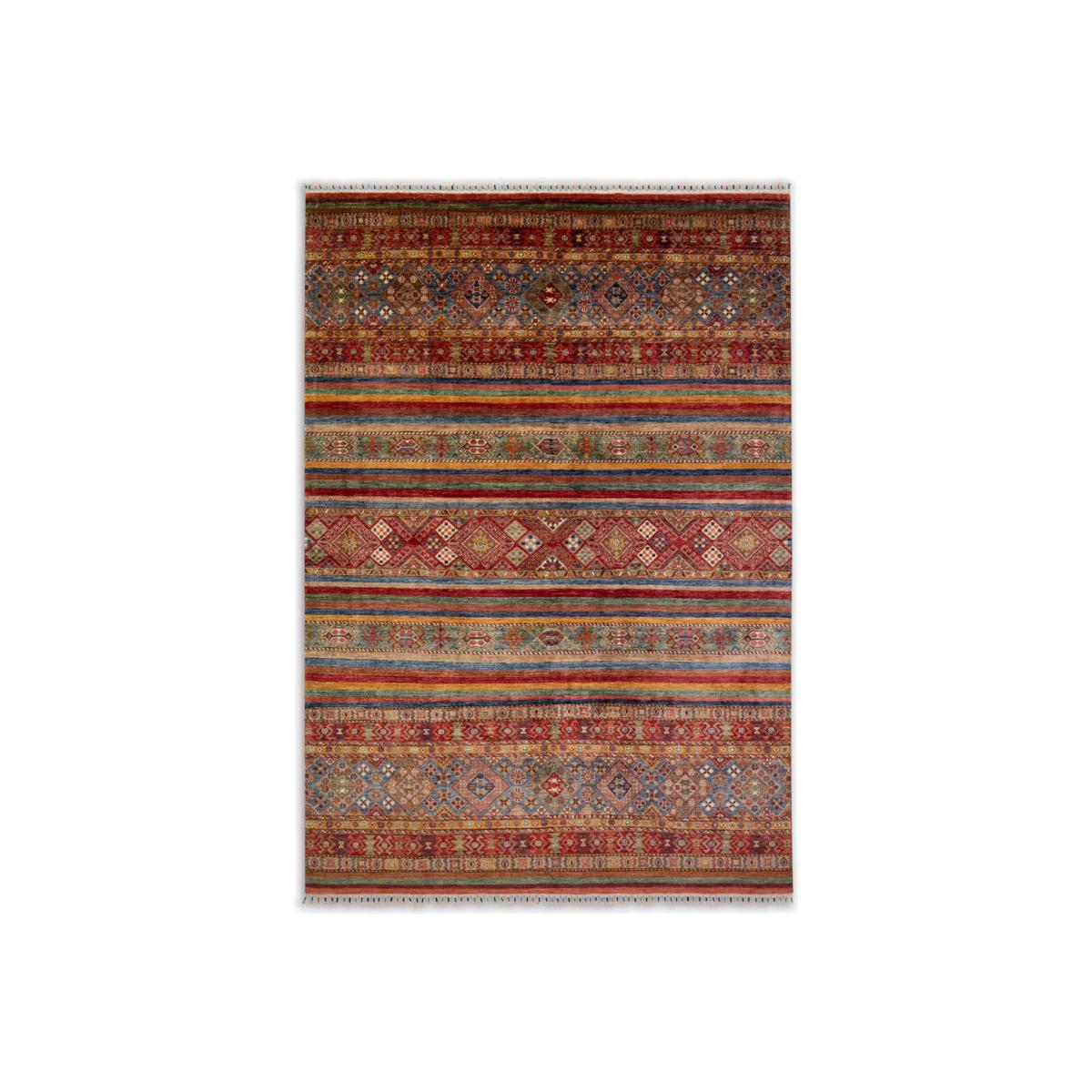 A selection of truly unique and totally individual traditional hand-knotted rugs, this range from Gooch Oriental showcases rugs created by different artisans across town and village locations across the world, including traditional Persian creations. Each piece is carefully selected by the Gooch Oriental team to ensure it's authenticity, quality and finish. Each one is knotted by hand, an intricate process using traditional hand knotting techniques. As such, no two pieces are the same, meaning you can add an authentic and unique piece of crafted design into your home, whilst supporting this heritage industry. The word ‘Khurjeen or Khorjeen’ means ‘’saddle bag’’ in Dari/Farsi. The reason why they chose this name is because of the pattern/style used on the saddle bags. Khurjeen rugs are woven by Turkmen and Hazara tribes in the central and Northern provinces of Afghanistan. The design and patterns of Khurjeen rugs are taken from Saddle bags having different warm colours and straight strips too. Khujeen rugs are unique because of their pattern and delicate designs specially mixing contemporary and traditional designs together. The wool yarns used are all hand spun and dyed using only natural dyes such as cochineal and indigo, which adds to their dramatic and vibrant appearance. Once dyed and hand knotted on a cotton warp base in Afghanistan the rugs are then transported over to Pakistan where they are expertly finished including washing and trimming. In 1sqm of Khurjeen rug there would be around 170000 + knots. About your new rug We recommend. It prevents your rug from moving underfoot and protects against colour transfer to the floor Natural fibres may shed. This will reduce over time, and shouldn’t affect your rug’s lifespan or performance When vacuuming your rug, use suction only. Rotating brushes may damage the fibres Blot any spills with a clean, dry cloth. Do not rub or use harsh detergents. Textile backed