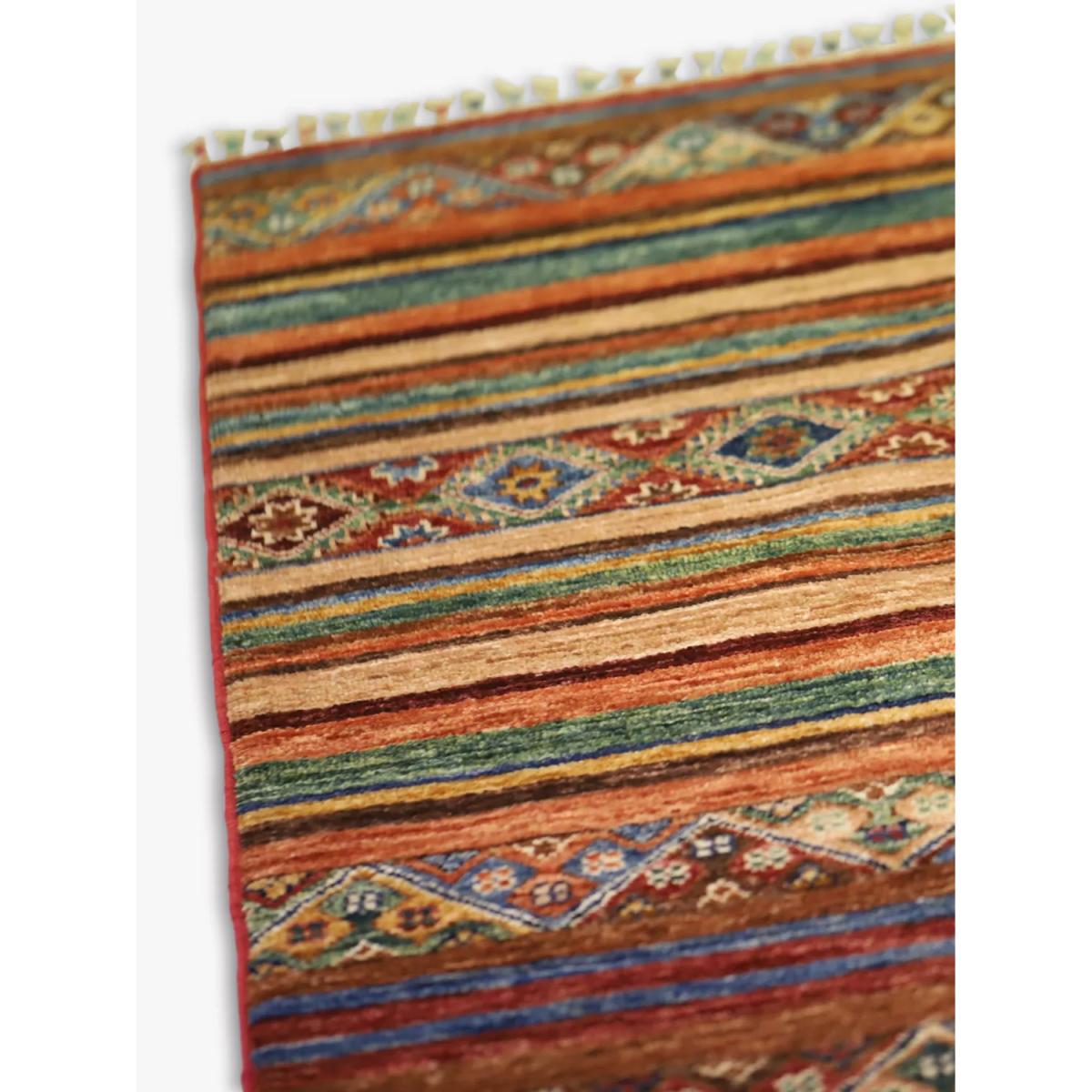 A selection of truly unique and totally individual traditional hand-knotted rugs, this range from Gooch Oriental showcases rugs created by different artisans across town and village locations across the world, including traditional Persian creations. Each piece is carefully selected by the Gooch Oriental team to ensure it's authenticity, quality and finish. Each one is knotted by hand, an intricate process using traditional hand knotting techniques. As such, no two pieces are the same, meaning you can add an authentic and unique piece of crafted design into your home, whilst supporting this heritage industry. The word Khurjeen or Khorjeen means saddle bag in Dari/Farsi. The reason why they chose this name is because of the pattern/style used on the saddle bags. Khurjeen rugs are woven by Turkmen and Hazara tribes in the central and Northern provinces of Afghanistan. The design and patterns of Khurjeen rugs are taken from Saddle bags having different warm colours and straight strips too. Khujeen rugs are unique because of their pattern and delicate designs specially mixing contemporary and traditional designs together. The wool yarns used are all hand spun and dyed using only natural dyes such as cochineal and indigo, which adds to their dramatic and vibrant appearance. Once dyed and hand knotted on a cotton warp base in Afghanistan the rugs are then transported over to Pakistan where they are expertly finished including washing and trimming. In 1sqm of Khurjeen rug there would be around 170000 + knots. The benefits of a wool rug Warm and durable, wool feels beautifully soft underfoot and is long-lasting Naturally flame-retardant and odour resistant Water repellent so easier to clean Naturally biodegradable, wool is part of the circular economy and contains no micro plastics This rug has been knotted by hand, the oldest and most individual way a rug can be made. This involves an intricate process of weaving by hand on a loom where yarns are tied one at a time, giving the rug a durable construction. About your new rug We recommend John Lewis & Partners Rug Hold Underlay. It prevents your rug from moving underfoot and protects against colour transfer to the floor As this rug is made using natural fibres, shedding is to be expected. This will reduce over time, and should not have an impact on the lifespan or performance of your rug. When you first get your rug, please use the brush attachment on your vacuum cleaner whilst the shedding dies down. After that, when vacuuming your rug, use suction only. Rotating brushes may damage the fibres. When vacuuming your rug, use suction only. Rotating brushes may damage the fibres Blot any spills with a clean, dry cloth. Do not rub or use harsh detergents. Textile backed Attend to spillages immediately and blot with a clean, dry cloth to prevent staining. Dilute a small amount of appropriate carpet shampoo in water. Dampen a colourfast cloth in the diluted shampoo solution and dab the rug, lightly agitating, moving in the direction of the pile. Treat the whole rug and not just the affected area. To restore the appearance of the affected area, use a soft bristled brush to gently comb in the direction of the pile. Allow the rug to thoroughly dry.