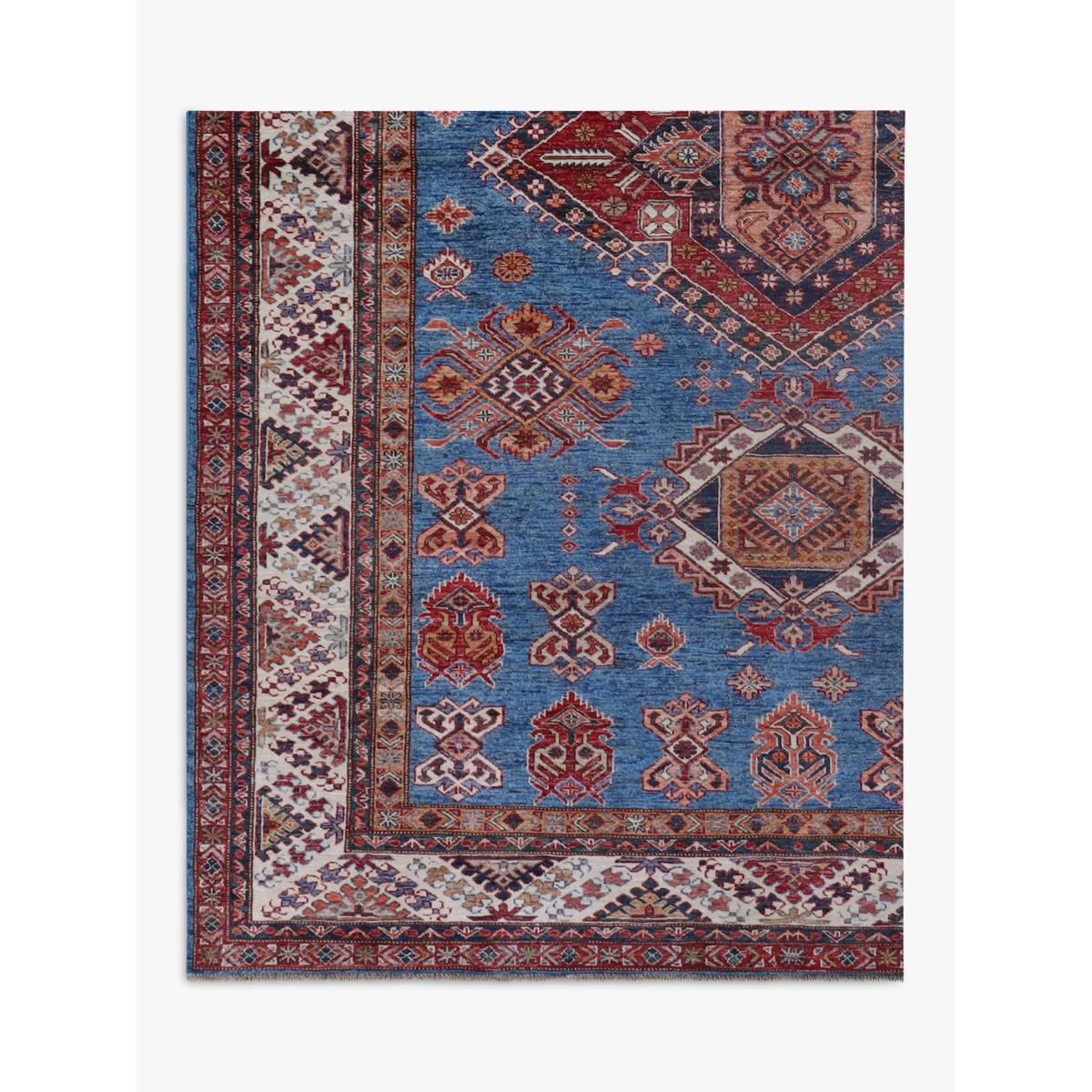 A selection of truly unique and totally individual traditional hand-knotted rugs, this range from Gooch Oriental showcases rugs created by different artisans across town and village locations across the world, including traditional Persian creations. Each piece is carefully selected by the Gooch Oriental team to ensure it's authenticity, quality and finish. Each one is knotted by hand, an intricate process using traditional hand knotting techniques. As such, no two pieces are the same, meaning you can add an authentic and unique piece of crafted design into your home, whilst supporting this heritage industry. The supreme Kazak design is mainly made by the Hazara Tribes of Afghanistan. The design and patterns of Kazak rugs are taken from old Caucasian rugs (Caucasian carpets are from the areas south, east and north of the mountain chain of the Caucasus, Russia). The wool yarns used are all hand spun and dyed using only natural dyes such as cochineal and indigo, which adds to their dramatic and vibrant appearance. Once dyed and hand knotted on a cotton warp base in Afghanistan the rugs are then transported over to Pakistan where they are expertly finished including washing and trimming. The method used to hand make a Kazak rug is called ChappatBaft or Flat woven. Kazak rug weavers are faithful in using traditional bold colour and design mainly with geometrical motifs including a mixture of diamond and circle shapes as well as representations of animals, people and nature. In 1sqm of a Supreme Kazak rug there would be around 160000 + knots giving a fine-density pile. The benefits of a wool rug Warm and durable, wool feels beautifully soft underfoot and is long-lasting Naturally flame-retardant and odour resistant Water repellent so easier to clean Naturally biodegradable, wool is part of the circular economy and contains no micro plastics This rug has been knotted by hand, the oldest and most individual way a rug can be made. This involves an intricate process of weaving by hand on a loom where yarns are tied one at a time, giving the rug a durable construction. About your new rug We recommend John Lewis & Partners Rug Hold Underlay. It prevents your rug from moving underfoot and protects against colour transfer to the floor As this rug is made using natural fibres, shedding is to be expected. This will reduce over time, and should not have an impact on the lifespan or performance of your rug. When you first get your rug, please use the brush attachment on your vacuum cleaner whilst the shedding dies down. After that, when vacuuming your rug, use suction only. Rotating brushes may damage the fibres. When vacuuming your rug, use suction only. Rotating brushes may damage the fibres Blot any spills with a clean, dry cloth. Do not rub or use harsh detergents. Textile backed Attend to spillages immediately and blot with a clean, dry cloth to prevent staining. Dilute a small amount of appropriate carpet shampoo in water. Dampen a colourfast cloth in the diluted shampoo solution and dab the rug, lightly agitating, moving in the direction of the pile. Treat the whole rug and not just the affected area. To restore the appearance of the affected area, use a soft bristled brush to gently comb in the direction of the pile. Allow the rug to thoroughly dry.