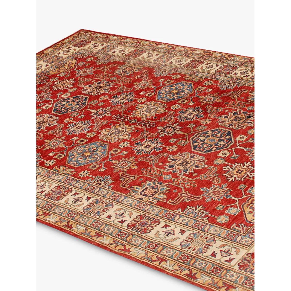 A selection of truly unique and totally individual traditional hand-knotted rugs, this range from Gooch Oriental showcases rugs created by different artisans across town and village locations across the world, including traditional Persian creations. Each piece is carefully selected by the Gooch Oriental team to ensure it's authenticity, quality and finish. Each one is knotted by hand, an intricate process using traditional hand knotting techniques. As such, no two pieces are the same, meaning you can add an authentic and unique piece of crafted design into your home, whilst supporting this heritage industry. The supreme Kazak design is mainly made by the Hazara Tribes of Afghanistan. The design and patterns of Kazak rugs are taken from old Caucasian rugs (Caucasian carpets are from the areas south, east and north of the mountain chain of the Caucasus, Russia). The wool yarns used are all hand spun and dyed using only natural dyes such as cochineal and indigo, which adds to their dramatic and vibrant appearance. Once dyed and hand knotted on a cotton warp base in Afghanistan the rugs are then transported over to Pakistan where they are expertly finished including washing and trimming. The method used to hand make a Kazak rug is called ChappatBaft or Flat woven. Kazak rug weavers are faithful in using traditional bold colour and design mainly with geometrical motifs including a mixture of diamond and circle shapes as well as representations of animals, people and nature. In 1sqm of a Supreme Kazak rug there would be around 160000 + knots giving a fine-density pile. The benefits of a wool rug Warm and durable, wool feels beautifully soft underfoot and is long-lasting Naturally flame-retardant and odour resistant Water repellent so easier to clean Naturally biodegradable, wool is part of the circular economy and contains no micro plastics This rug has been knotted by hand, the oldest and most individual way a rug can be made. This involves an intricate process of weaving by hand on a loom where yarns are tied one at a time, giving the rug a durable construction. About your new rug We recommend John Lewis & Partners Rug Hold Underlay. It prevents your rug from moving underfoot and protects against colour transfer to the floor As this rug is made using natural fibres, shedding is to be expected. This will reduce over time, and should not have an impact on the lifespan or performance of your rug. When you first get your rug, please use the brush attachment on your vacuum cleaner whilst the shedding dies down. After that, when vacuuming your rug, use suction only. Rotating brushes may damage the fibres. When vacuuming your rug, use suction only. Rotating brushes may damage the fibres Blot any spills with a clean, dry cloth. Do not rub or use harsh detergents. Textile backed Attend to spillages immediately and blot with a clean, dry cloth to prevent staining. Dilute a small amount of appropriate carpet shampoo in water. Dampen a colourfast cloth in the diluted shampoo solution and dab the rug, lightly agitating, moving in the direction of the pile. Treat the whole rug and not just the affected area. To restore the appearance of the affected area, use a soft bristled brush to gently comb in the direction of the pile. Allow the rug to thoroughly dry.