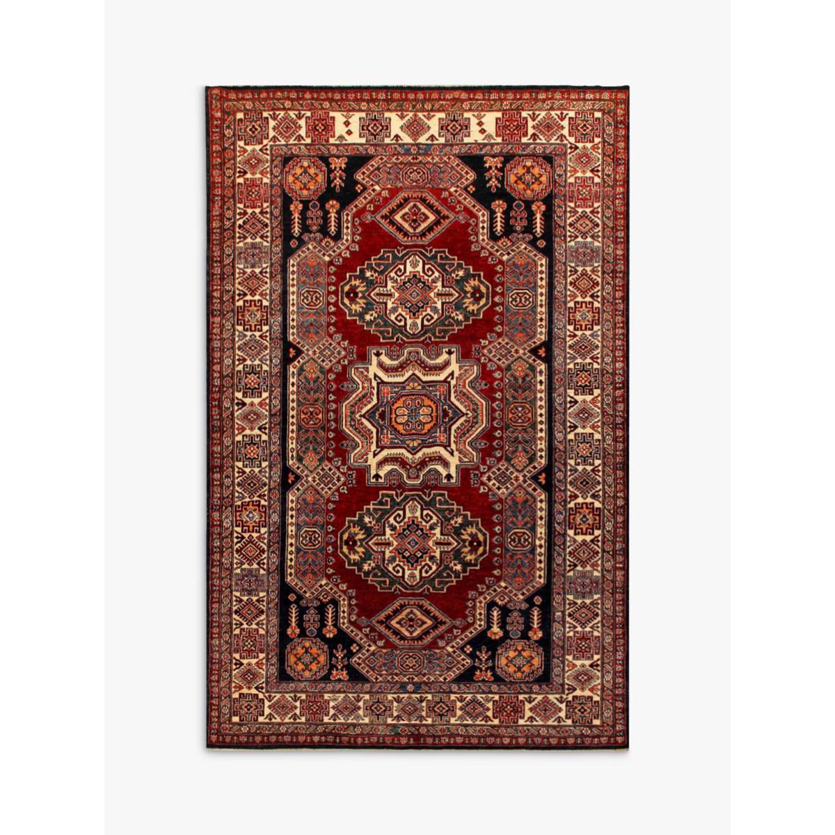 A selection of truly unique and totally individual traditional hand-knotted rugs, this range from Gooch Oriental showcases rugs created by different artisans across town and village locations across the world, including traditional Persian creations. Each piece is carefully selected by the Gooch Oriental team to ensure it's authenticity, quality and finish. Each one is knotted by hand, an intricate process using traditional hand knotting techniques. As such, no two pieces are the same, meaning you can add an authentic and unique piece of crafted design into your home, whilst supporting this heritage industry. The supreme Kazak design is mainly made by the Hazara Tribes of Afghanistan. The design and patterns of Kazak rugs are taken from old Caucasian rugs (Caucasian carpets are from the areas south, east and north of the mountain chain of the Caucasus, Russia). The wool yarns used are all hand spun and dyed using only natural dyes such as cochineal and indigo, which adds to their dramatic and vibrant appearance. Once dyed and hand knotted on a cotton warp base in Afghanistan the rugs are then transported over to Pakistan where they are expertly finished including washing and trimming. The method used to hand make a Kazak rug is called ChappatBaft or Flat woven. Kazak rug weavers are faithful in using traditional bold colour and design mainly with geometrical motifs including a mixture of diamond and circle shapes as well as representations of animals, people and nature. In 1sqm of a Supreme Kazak rug there would be around 160000 + knots giving a fine-density pile. The benefits of a wool rug Warm and durable, wool feels beautifully soft underfoot and is long-lasting Naturally flame-retardant and odour resistant Water repellent so easier to clean Naturally biodegradable, wool is part of the circular economy and contains no micro plastics About your new rug We recommend John Lewis & Partners Rug Hold Underlay. It prevents your rug from moving underfoot and protects against colour transfer to the floor As this rug is made using natural fibres, shedding is to be expected. This will reduce over time, and should not have an impact on the lifespan or performance of your rug. When you first get your rug, please use the brush attachment on your vacuum cleaner whilst the shedding dies down. After that, when vacuuming your rug, use suction only. Rotating brushes may damage the fibres. When vacuuming your rug, use suction only. Rotating brushes may damage the fibres Blot any spills with a clean, dry cloth. Do not rub or use harsh detergents. Textile backed Attend to spillages immediately and blot with a clean, dry cloth to prevent staining. Dilute a small amount of appropriate carpet shampoo in water. Dampen a colourfast cloth in the diluted shampoo solution and dab the rug, lightly agitating, moving in the direction of the pile. Treat the whole rug and not just the affected area. To restore the appearance of the affected area, use a soft bristled brush to gently comb in the direction of the pile. Allow the rug to thoroughly dry.