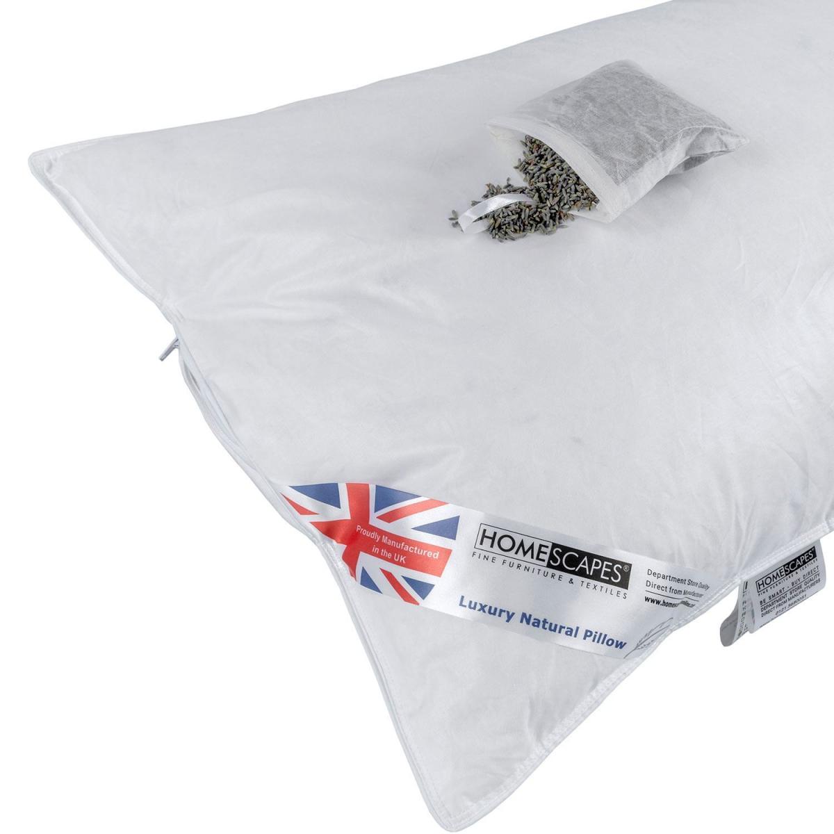 Create the perfect night-time ambiance with this lavender infused Goose Feather and Down pillow from Homescapes. Combining comfort with the soothing aroma of lavender, this pillow from Homescapes will ensure that you get the best nights sleep possible. Homescapes Goose Feather and Down pillow is made up of 85 super soft white goose feathers that create a comfortable cloud-like pillow to sink your head into. This is combined with 15 down feathers to offer support while you sleep. It is cased inside 100 cotton, a natural and breathable fabric that will allow the soothing lavender aromas to infuse throughout the night. Dried lavender is contained within a secure cotton pouch and is placed inside this pocketed pillow. Widely regarded for its soothing properties, lavender encourages a relaxing and stress free sleep, and can be hugely beneficial to sufferers of insomnia, anxiety and depression. Pack includes one pillow with one lavender pouch. Each lavender pouch lasts up to 90 days, and you can update the scent with replaceable pouches from Homescapes. Machine washable, the lavender pouch is removable so that the pillow can be washed and dried to keep it fresh and clean.