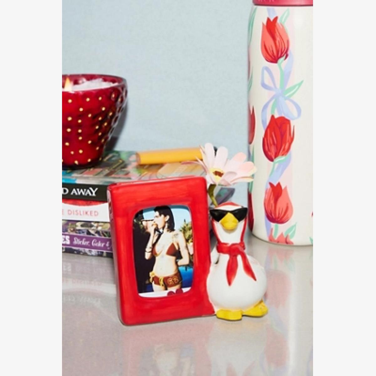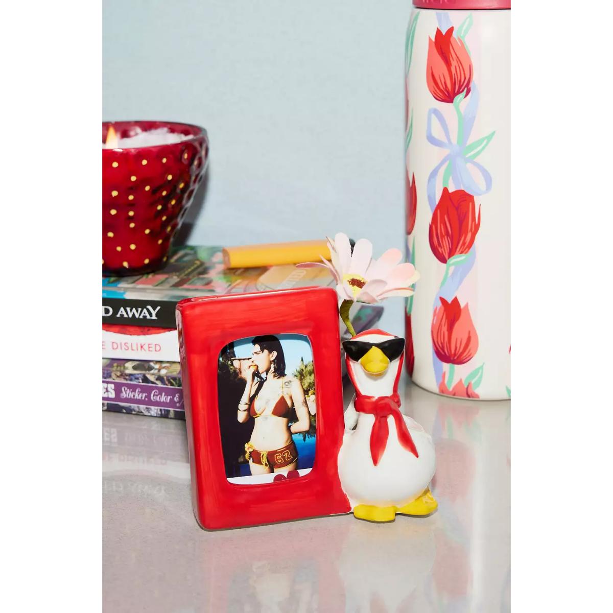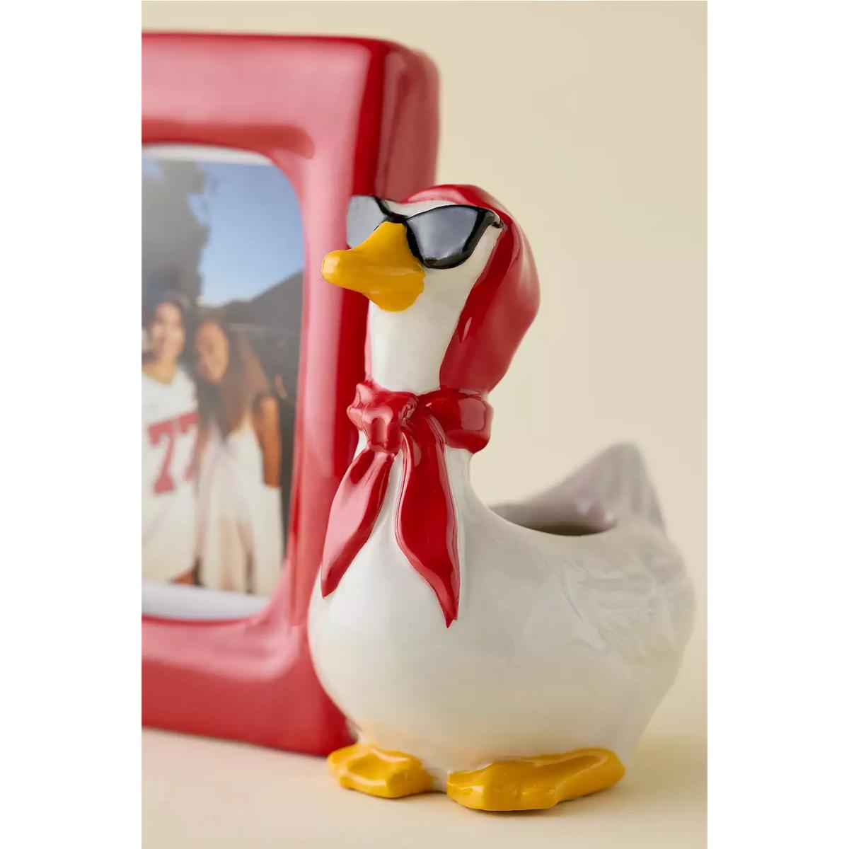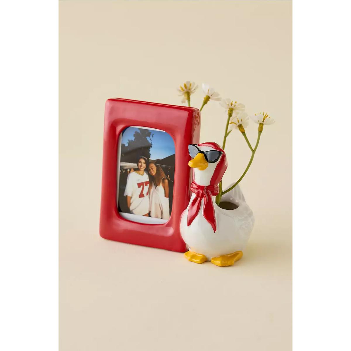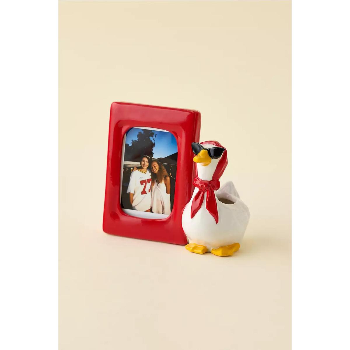 Playful ceramic photo frame with a whimsical goose design. Features a glossy red border for Instax photos, paired with a sunglasses-wearing goose figurine that doubles as a small vase, perfect for personalising your space with memories and flowers. **Content + Care** \- 100% Stoneware \- Wipe clean